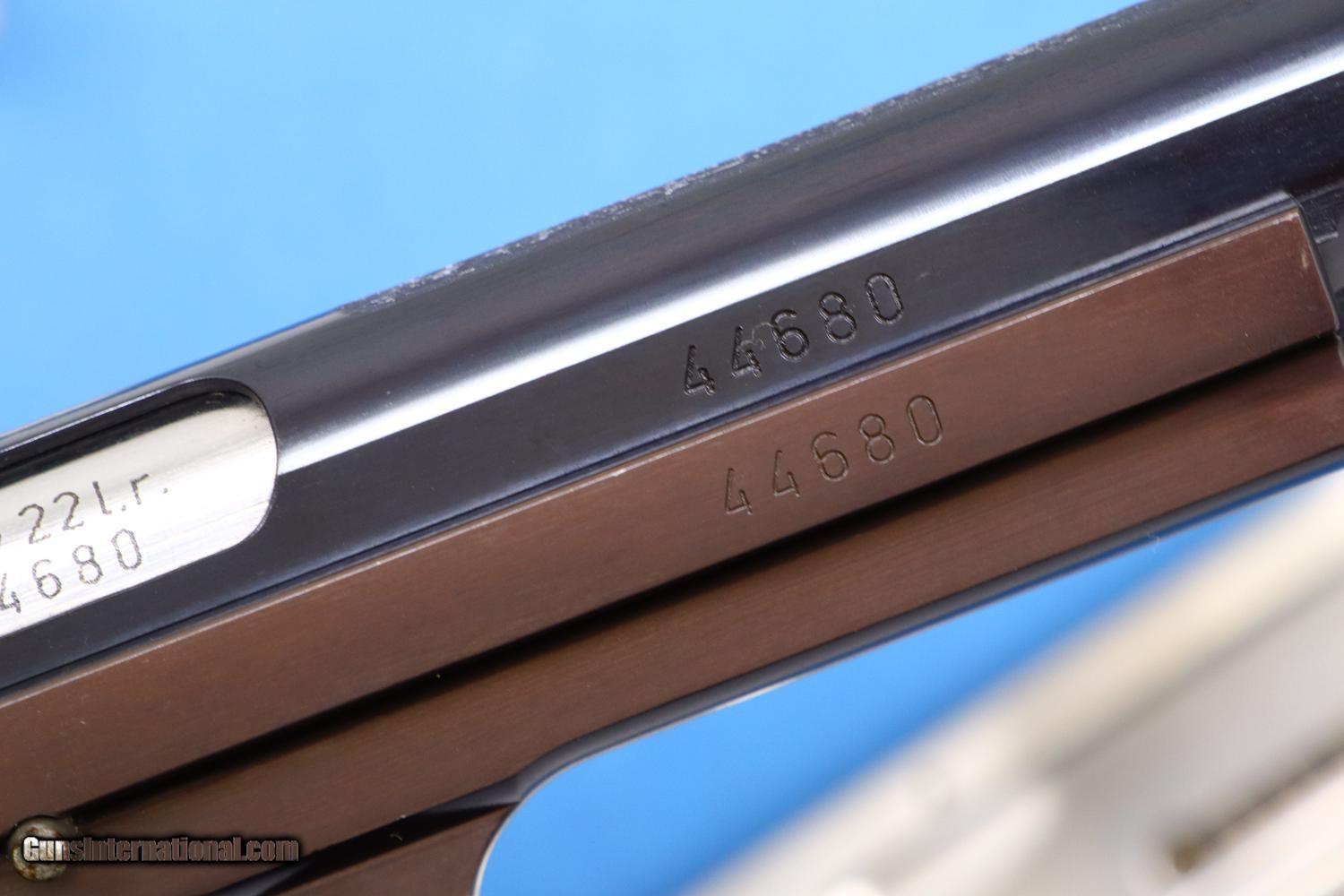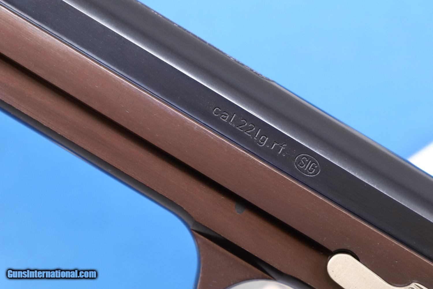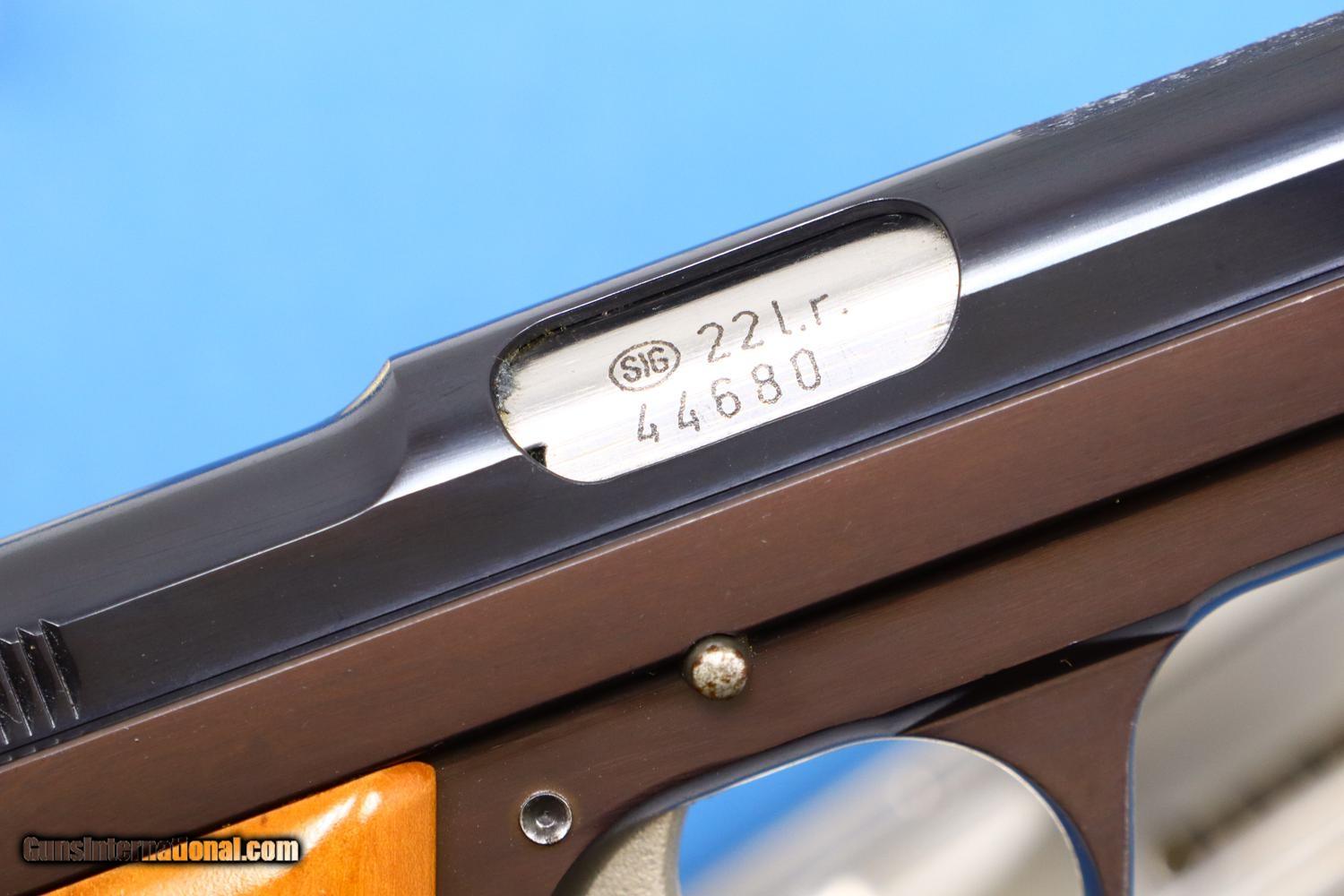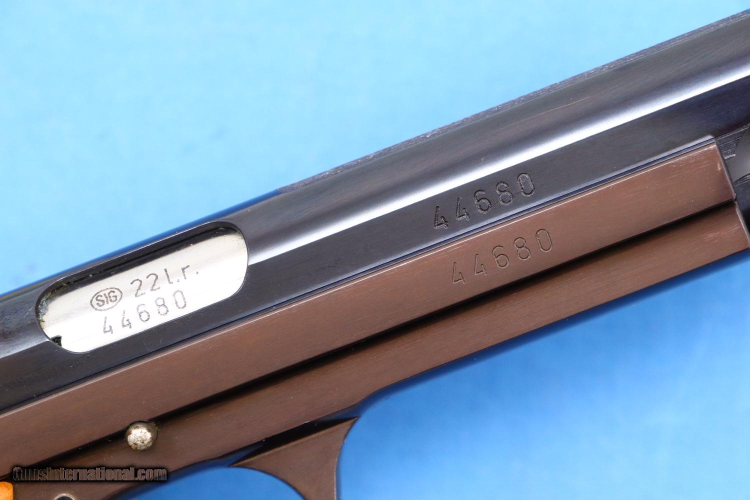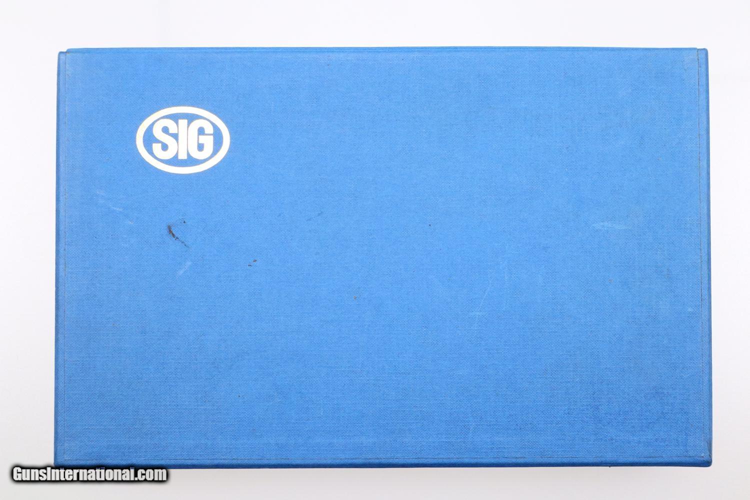 Description: Synopsis: Magnificent, AS NEW, SIG, P210-7, Swiss .22 LR Pistol, Boxed, 44680, FB01018 Description: Phenomenal SIG P210-7, a dedicated and all matching .22 LR pistol, with dished slide having drift adjustable front and rear sights. The left side of the slide is marked with the caliber and encircled SIG logo. The full serial number is on the right side of the slide, immediately below on the frame, and repeated on the exposed chamber. Usual white highlighted S (safe) and red highlighted F (fire). Slide, frame, safety lever, and magazine release are high polish blued, the frame plum toned, with the barrel, hammer, trigger and slide release in-the-white. Walnut checkered grips secured with a single transverse screw. Unmarked in-the-white magazine body with blued floorplate as correct for this pistol. Generic blue/gold SIG box. Condition: AS NEW original high polish blue, not a single scratch or rub mark on this magnificent pistol. Tiny casting imperfections on crest of slide release. Mirror bore. Perfect manual mechanics. Exterior of unnumbered box in comparable condition, the crumbled grey foam from the bottom having been removed. If you want the best, classic, SIG P210-7 in a high polish blue with standard fixed sights, this is your chance! ~~Insured shipping fee of $155; most packages shipped using FedEx 2nd Day.~~ SOLD Manufacturer: SIG Serial Number: 44680 Caliber Info: .22LR |