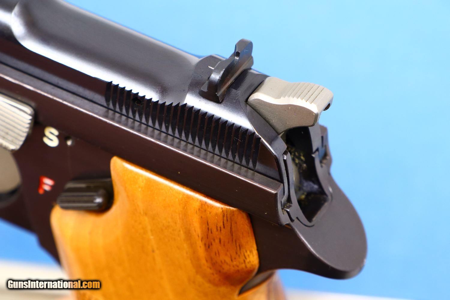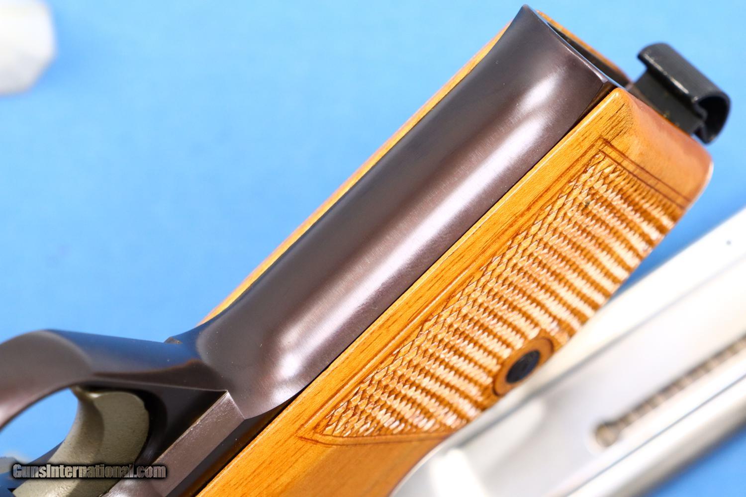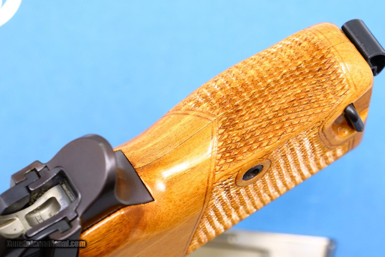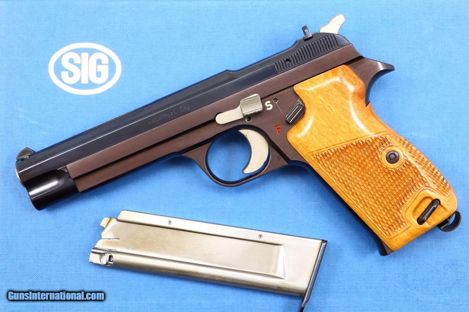 Description: Synopsis: Magnificent, AS NEW, SIG, P210-7, Swiss .22 LR Pistol, Boxed, 44680, FB01018 Description: Phenomenal SIG P210-7, a dedicated and all matching .22 LR pistol, with dished slide having drift adjustable front and rear sights. The left side of the slide is marked with the caliber and encircled SIG logo. The full serial number is on the right side of the slide, immediately below on the frame, and repeated on the exposed chamber. Usual white highlighted S (safe) and red highlighted F (fire). Slide, frame, safety lever, and magazine release are high polish blued, the frame plum toned, with the barrel, hammer, trigger and slide release in-the-white. Walnut checkered grips secured with a single transverse screw. Unmarked in-the-white magazine body with blued floorplate as correct for this pistol. Generic blue/gold SIG box. Condition: AS NEW original high polish blue, not a single scratch or rub mark on this magnificent pistol. Tiny casting imperfections on crest of slide release. Mirror bore. Perfect manual mechanics. Exterior of unnumbered box in comparable condition, the crumbled grey foam from the bottom having been removed. If you want the best, classic, SIG P210-7 in a high polish blue with standard fixed sights, this is your chance! ~~Insured shipping fee of $155; most packages shipped using FedEx 2nd Day.~~ SOLD Manufacturer: SIG Serial Number: 44680 Caliber Info: .22LR |