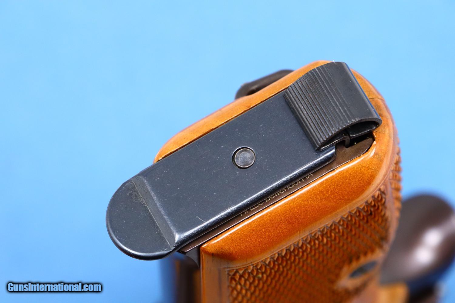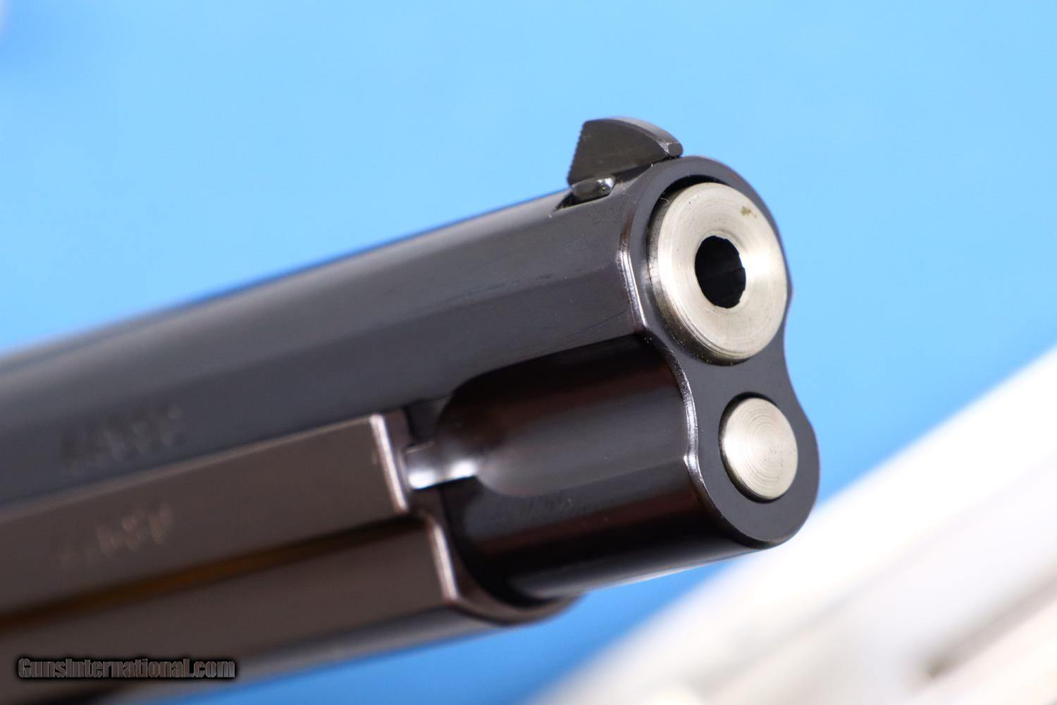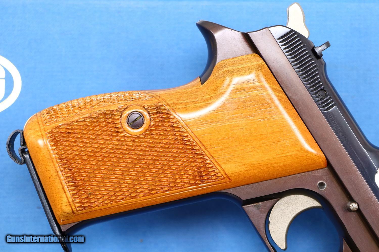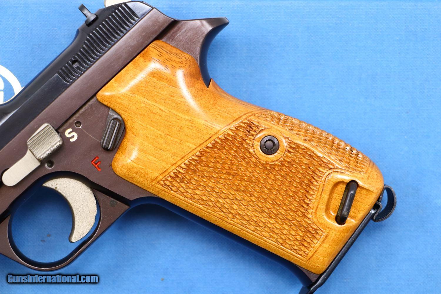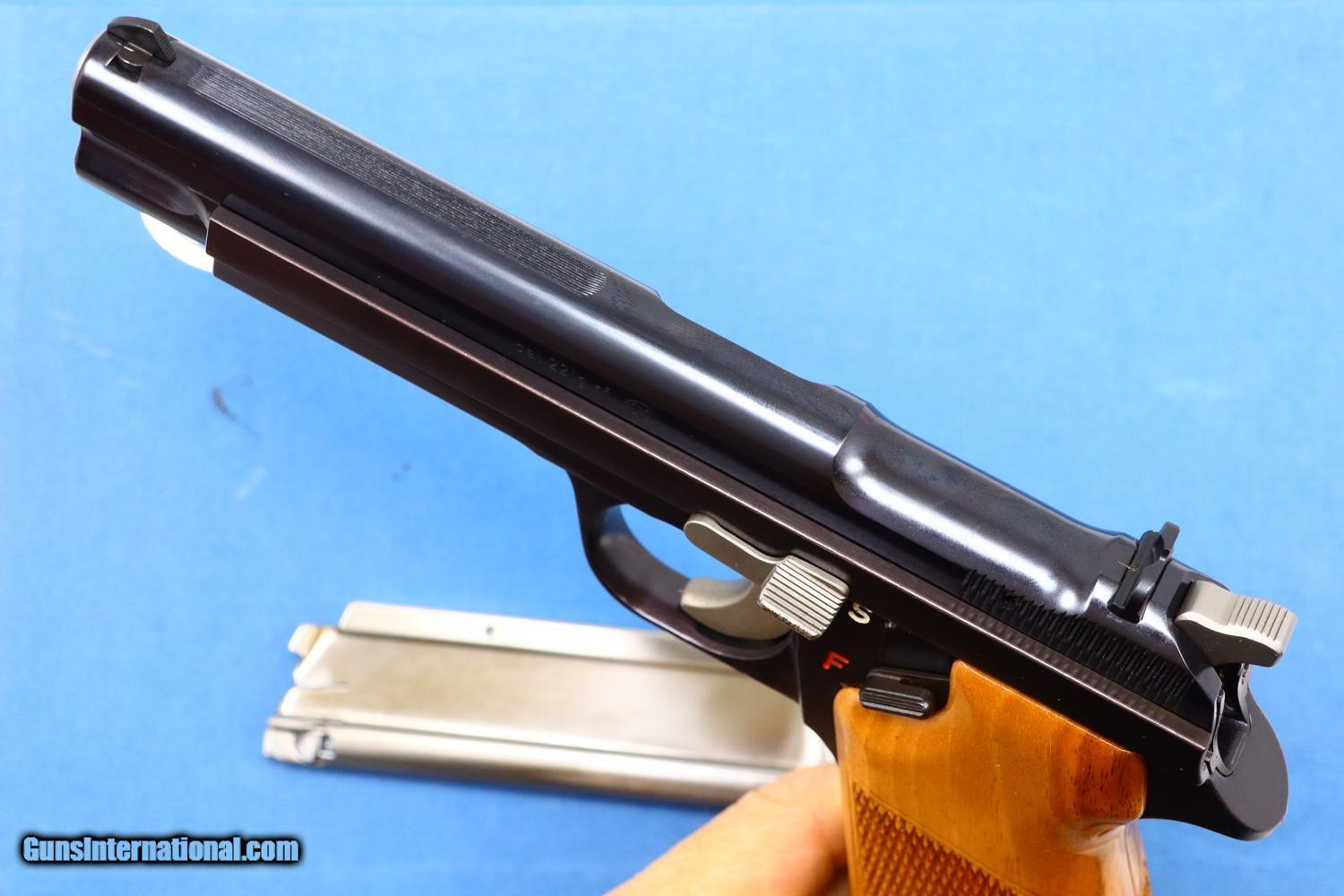 Description: Synopsis: Magnificent, AS NEW, SIG, P210-7, Swiss .22 LR Pistol, Boxed, 44680, FB01018 Description: Phenomenal SIG P210-7, a dedicated and all matching .22 LR pistol, with dished slide having drift adjustable front and rear sights. The left side of the slide is marked with the caliber and encircled SIG logo. The full serial number is on the right side of the slide, immediately below on the frame, and repeated on the exposed chamber. Usual white highlighted S (safe) and red highlighted F (fire). Slide, frame, safety lever, and magazine release are high polish blued, the frame plum toned, with the barrel, hammer, trigger and slide release in-the-white. Walnut checkered grips secured with a single transverse screw. Unmarked in-the-white magazine body with blued floorplate as correct for this pistol. Generic blue/gold SIG box. Condition: AS NEW original high polish blue, not a single scratch or rub mark on this magnificent pistol. Tiny casting imperfections on crest of slide release. Mirror bore. Perfect manual mechanics. Exterior of unnumbered box in comparable condition, the crumbled grey foam from the bottom having been removed. If you want the best, classic, SIG P210-7 in a high polish blue with standard fixed sights, this is your chance! ~~Insured shipping fee of $155; most packages shipped using FedEx 2nd Day.~~ SOLD Manufacturer: SIG Serial Number: 44680 Caliber Info: .22LR |
