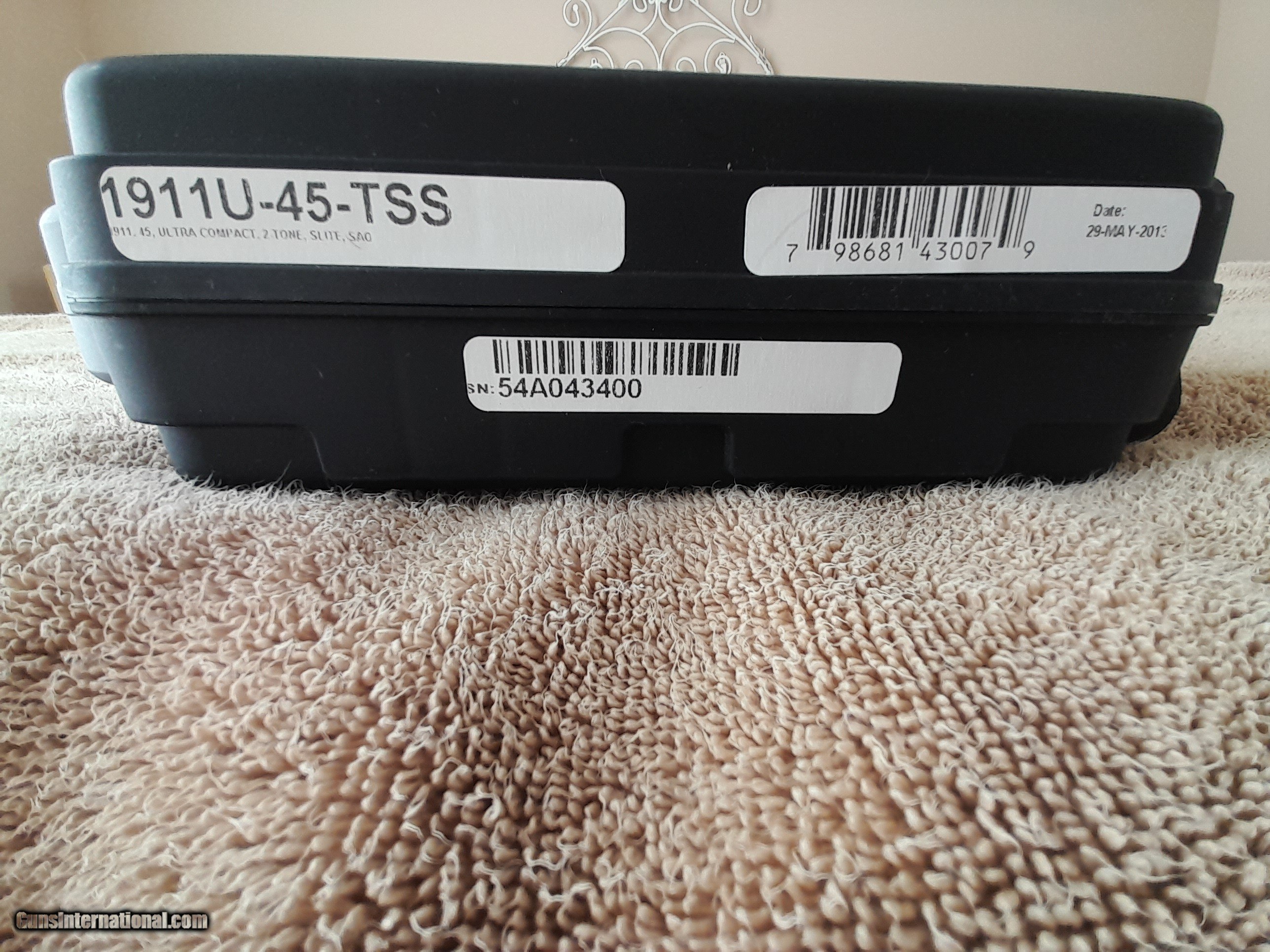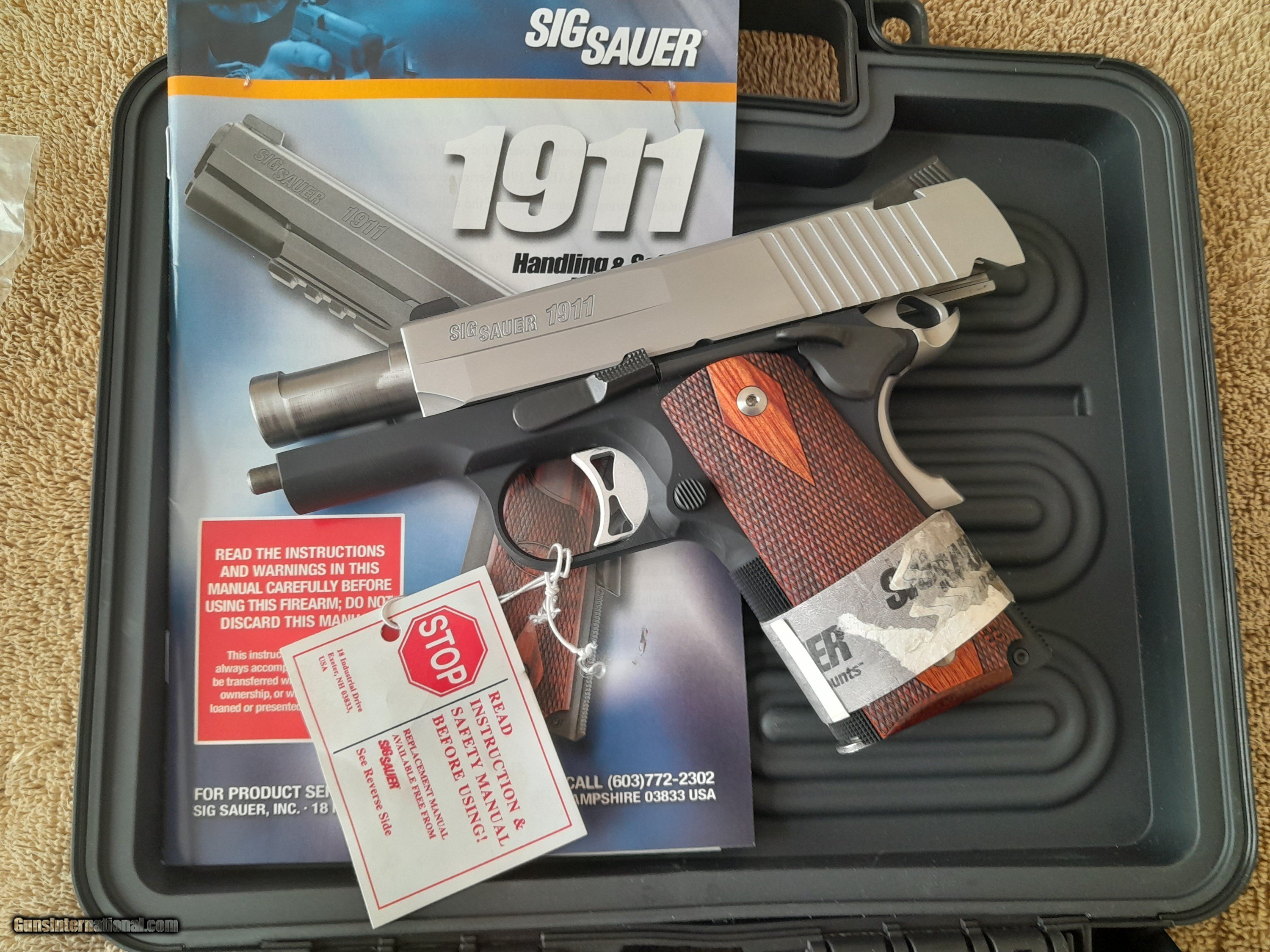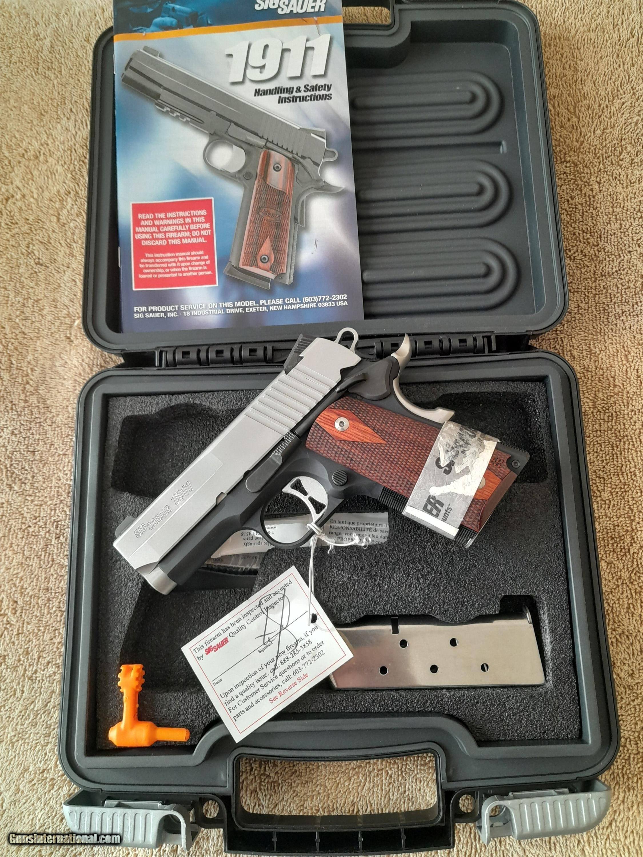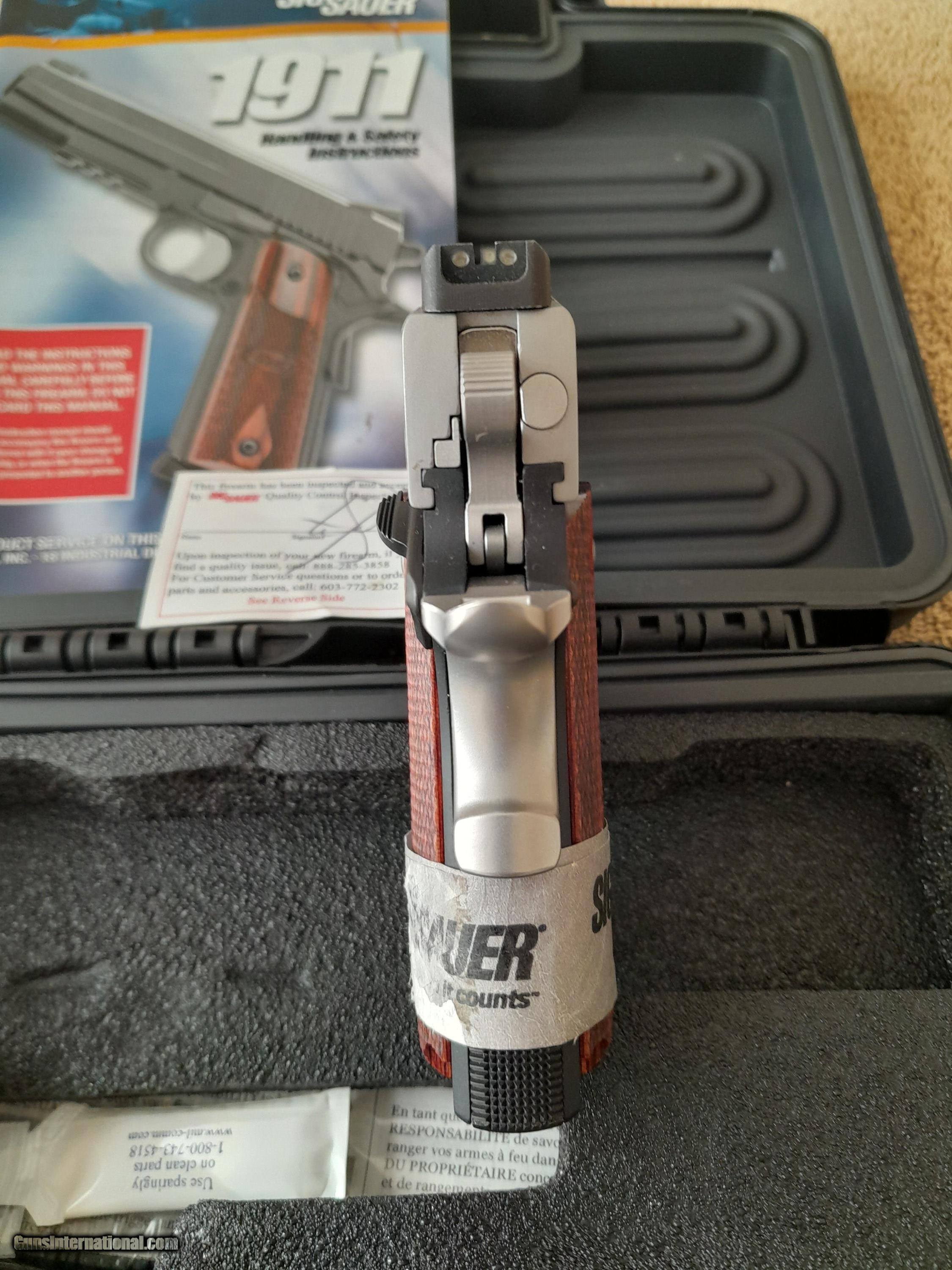 Description: This no longer made and harder-to-find SIG 1911 Ultra Two-Tone 45 ACP, Model 1911U-45-TSS, comes in its factory-fresh box complete with hang tag; two stainless steel magazines, and owner's manual. It is in immaculate and LNIB condition! (I received it on trade and previous owner stated it was unfired. I believe him, and that certainly appears to be the case; but I cannot verify 100%.). It is a beautiful gun in perfect condition! Not bulky and great overall size and weight for concealed carry. It features a stainless steel slide and frame, low-profile SIGLITE night sights, skeletonized combat hammer and trigger, enhanced beavertail grip safety, custom redwood grips, checkered front strap, and two factory 7-round polished stainless steel magazines. Very well-built as is its fit and finish. My preferred method of payment is US Postal money order and results in immediate shipment. I will accept bank cashier's check but may delay shipping 3 days or until check clears bank. I do not charge sales tax. Pistol will be shipped directly from my FFL dealer to Purchaser's FFL dealer, no exceptions. Shipping/insurance is $50 to lower-48 states and is in addition to purchase price and must be included with total remittance. (According to the manufacturer, this firearm is NOT CA or MA compliant.) SOLD Manufacturer: Sig Arms Model: 1911U-45-TSS Barrel Length: 3.3 Condition: LNIB Metal Condition: Perfect Wood Condition: Perfect Bore Condition: Perfect Action: Semi-auto single action Triggers: Skeletonized Weight: 28 oz. Sights: SIGLITE low-profile 3-dot night sights Extras: Owner's manual Case: Factory black plastic Item Location: Nebraska |