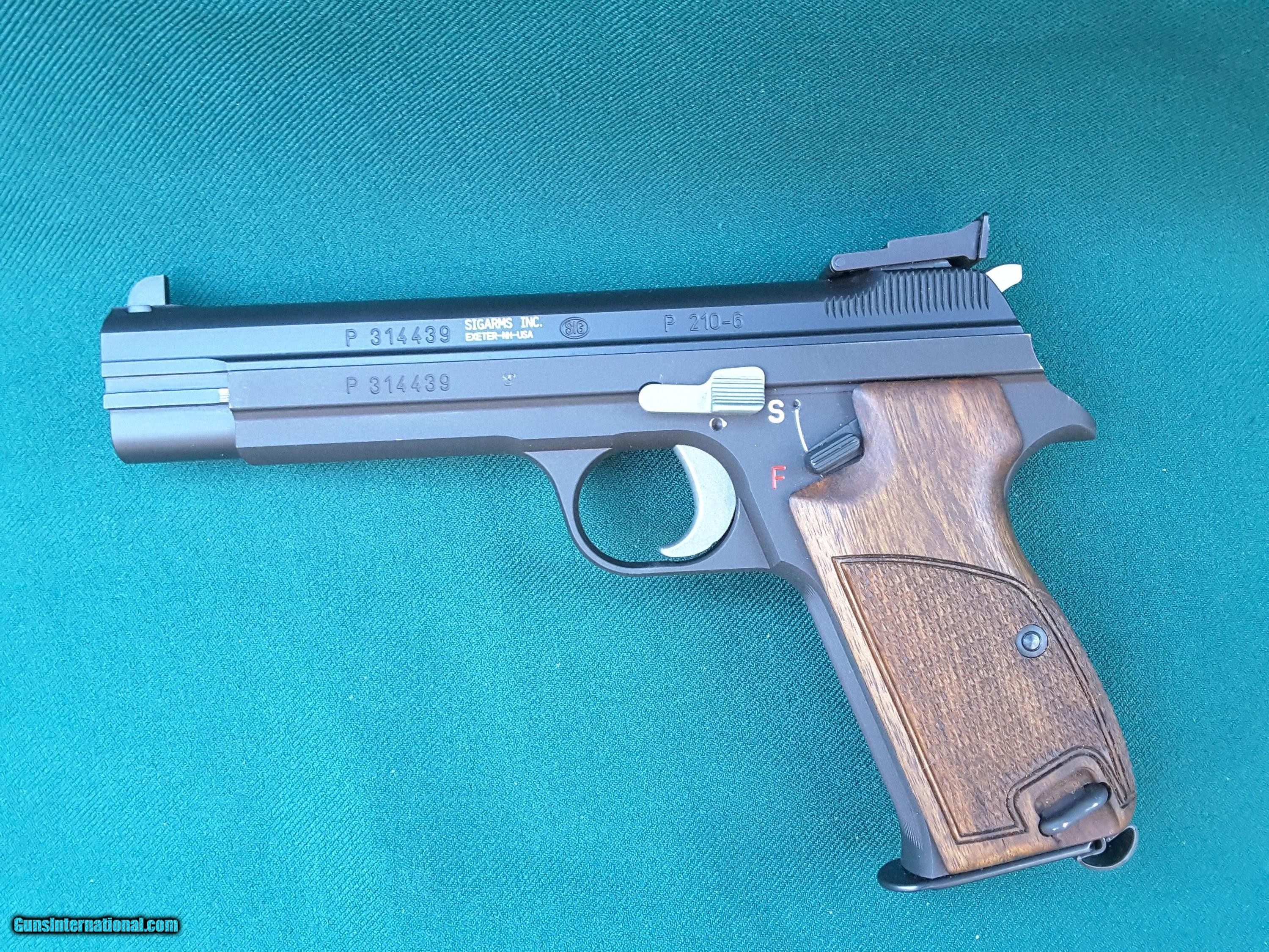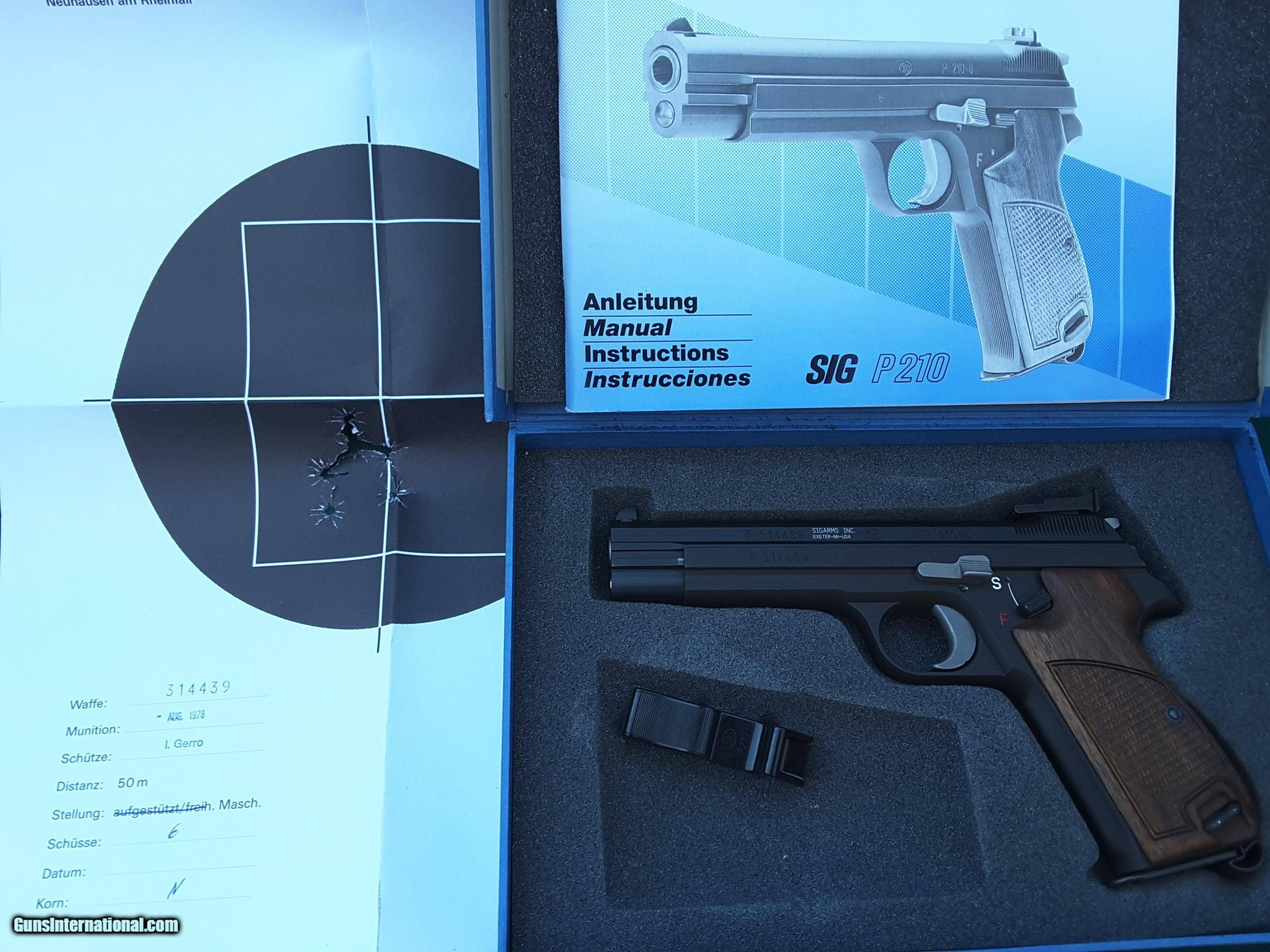 Description: SIG Arms 210-6, semi-automatic, serial #314439, 9MM, 4 5/8" barrel, as new, original matte blue finish, checkered walnut grips, adjustable rear sight, partridge front sight, single magazine, loader. Test target and factory box numbered to the gun along with manual. REDUCED PRICE TO $3,650 Sold Pendng Funds SOLD Manufacturer: SIG Arms Model: 210-6 Serial Number: 314439 Barrel Length: 4 5/8 Condition: As new Metal Condition: As new Wood Condition: As new Bore Condition: As new |