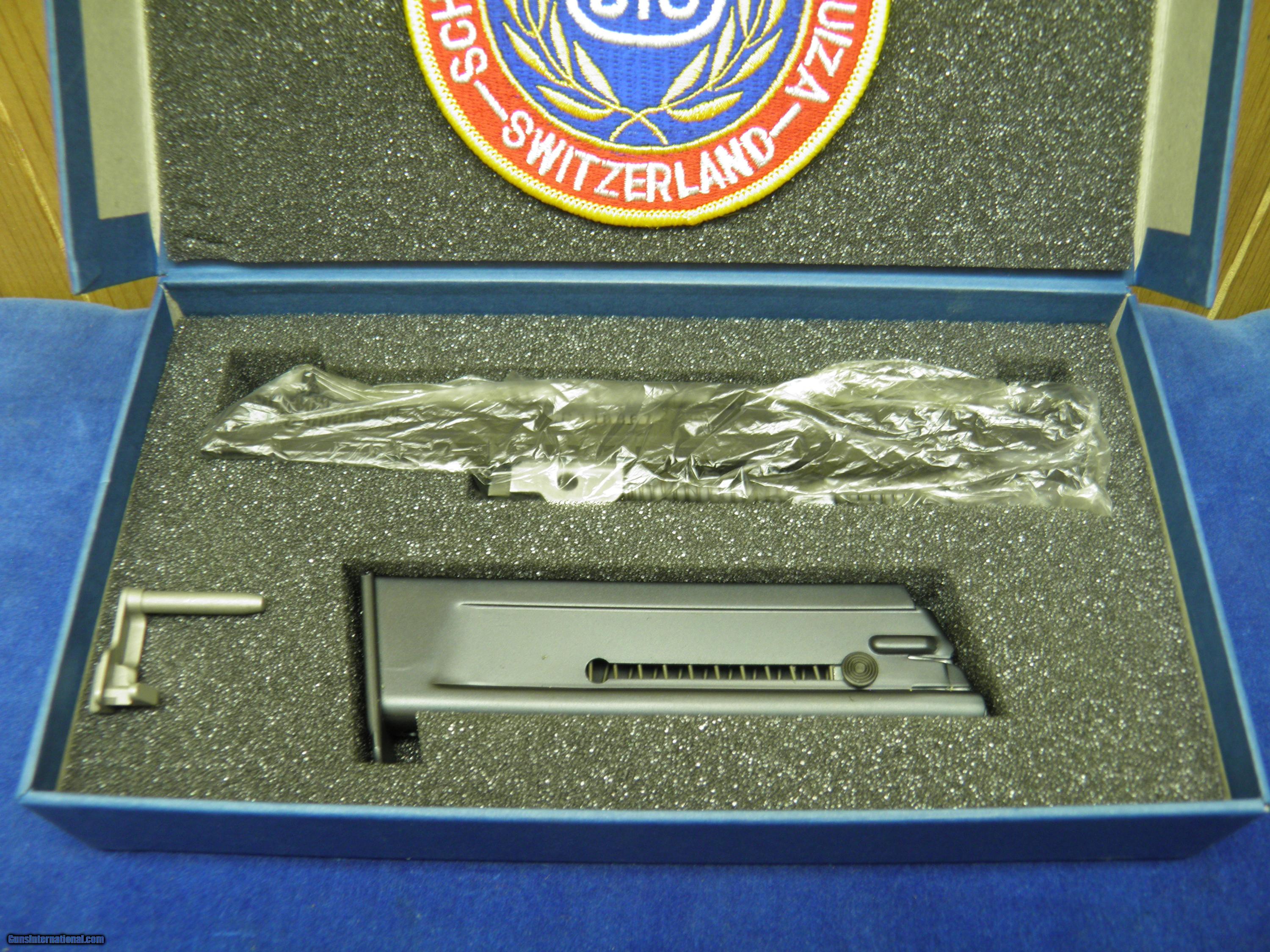 Description: SIG ARMS P-210 SMALL BORE CONVERSION SYSTEM 22LR, MARKED SWITZERLAND ON SLIDE, INCLUDES, SLIDE WITH SIGHTS, BARREL, RECOIL SPRING, TAKE -DOWN LEVER, MAGAZINE, INSTRUCTIONS, FACTORY TEST TARGET, FACTORY PATCH, "CONDITION" 100% NEW TEST FIRED AT FACTORY ONLY! FITS ALL P-210 PISTOLS, VERY RARE PIECE IN THIS CONDITION!! SOLD |
