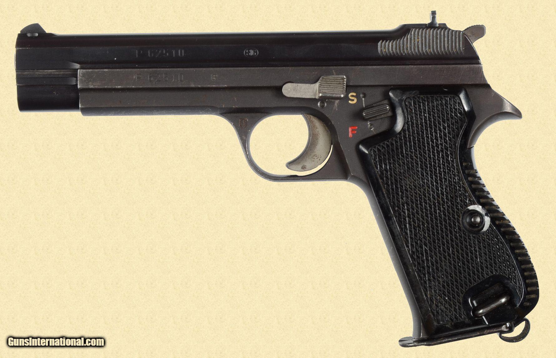Description: 9mm Luger; 85% blue, excellent bore, good grips, 4.75'' barrel, Manufactured circa mid 1970's. Original blue finish slide, matte finish frame and checkered black plastic grips. Matching numbers frame, slide and barrel. Geneva Police proofed on the left side of the trigger guard. Standard fixed sights, factory magazine. Berner Probe proof on the left side frame rail. Metal finish shows holster wear and handling marks on the frame rails and front grip frame strap. Mechanically fine. Our import mark on the bottom of the frame. SOLD Serial Number: P62510 |