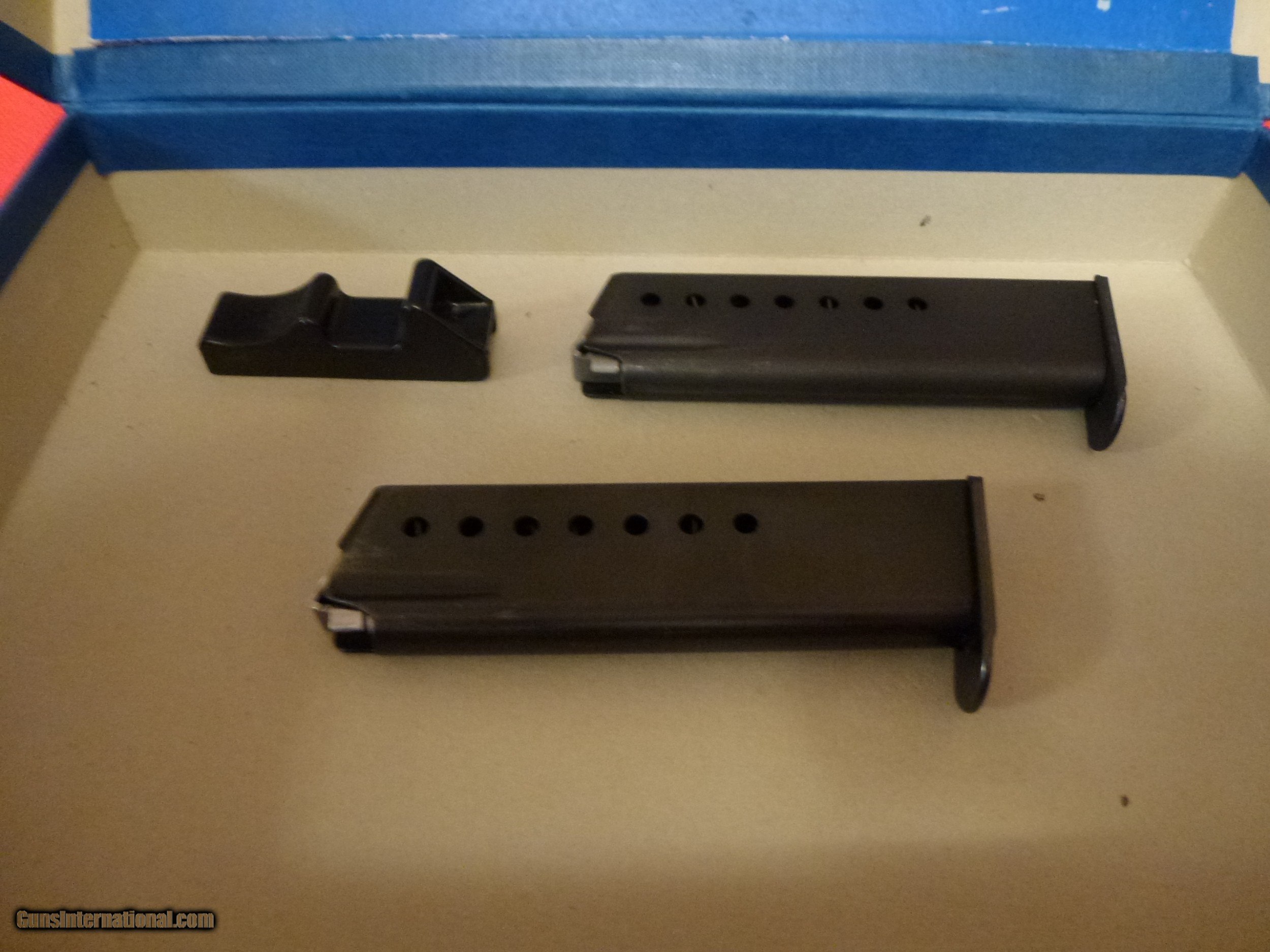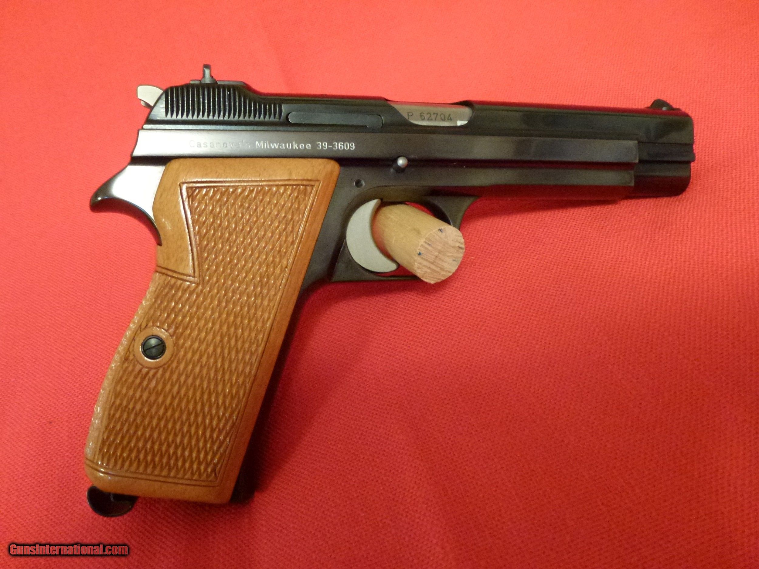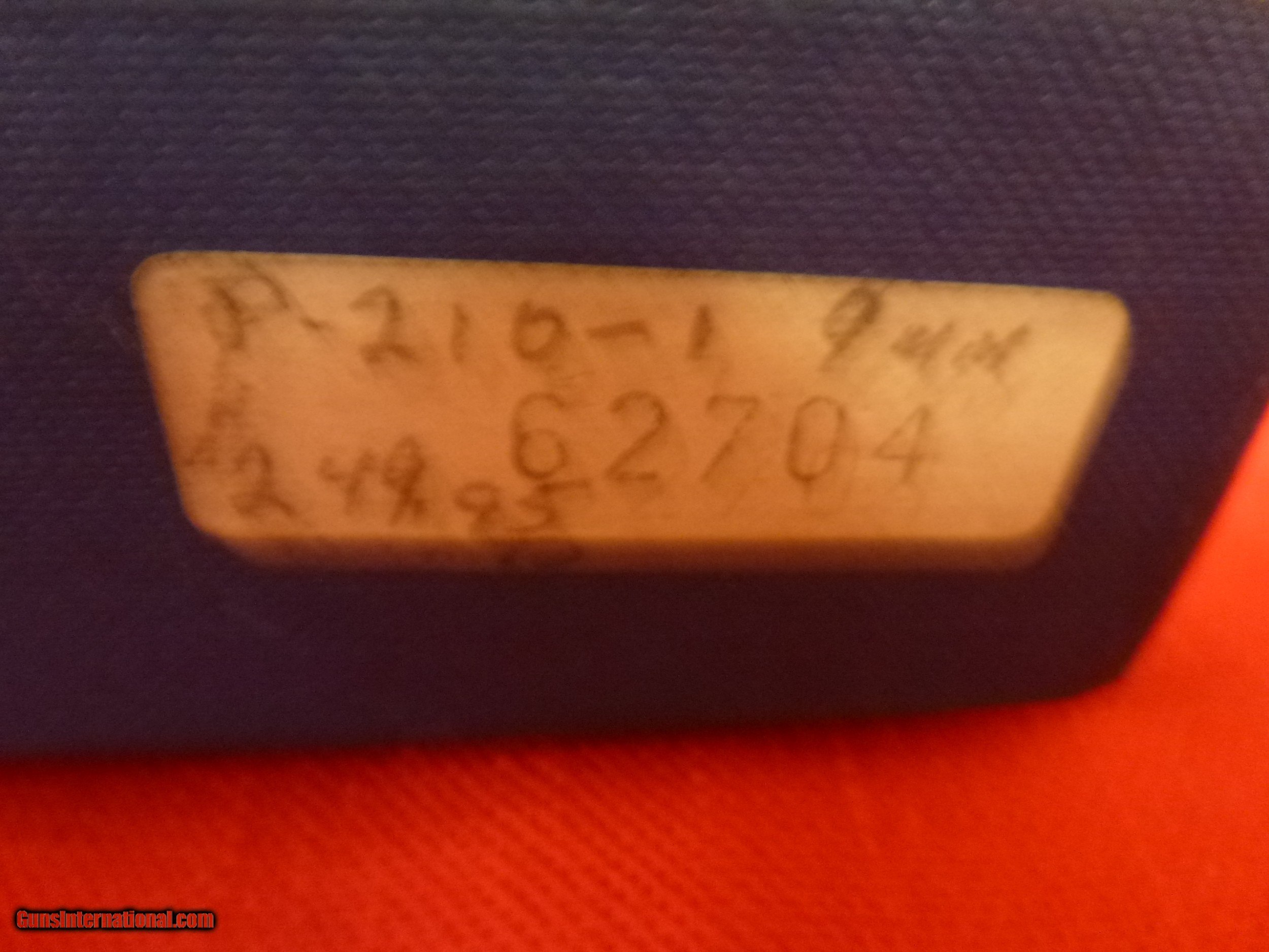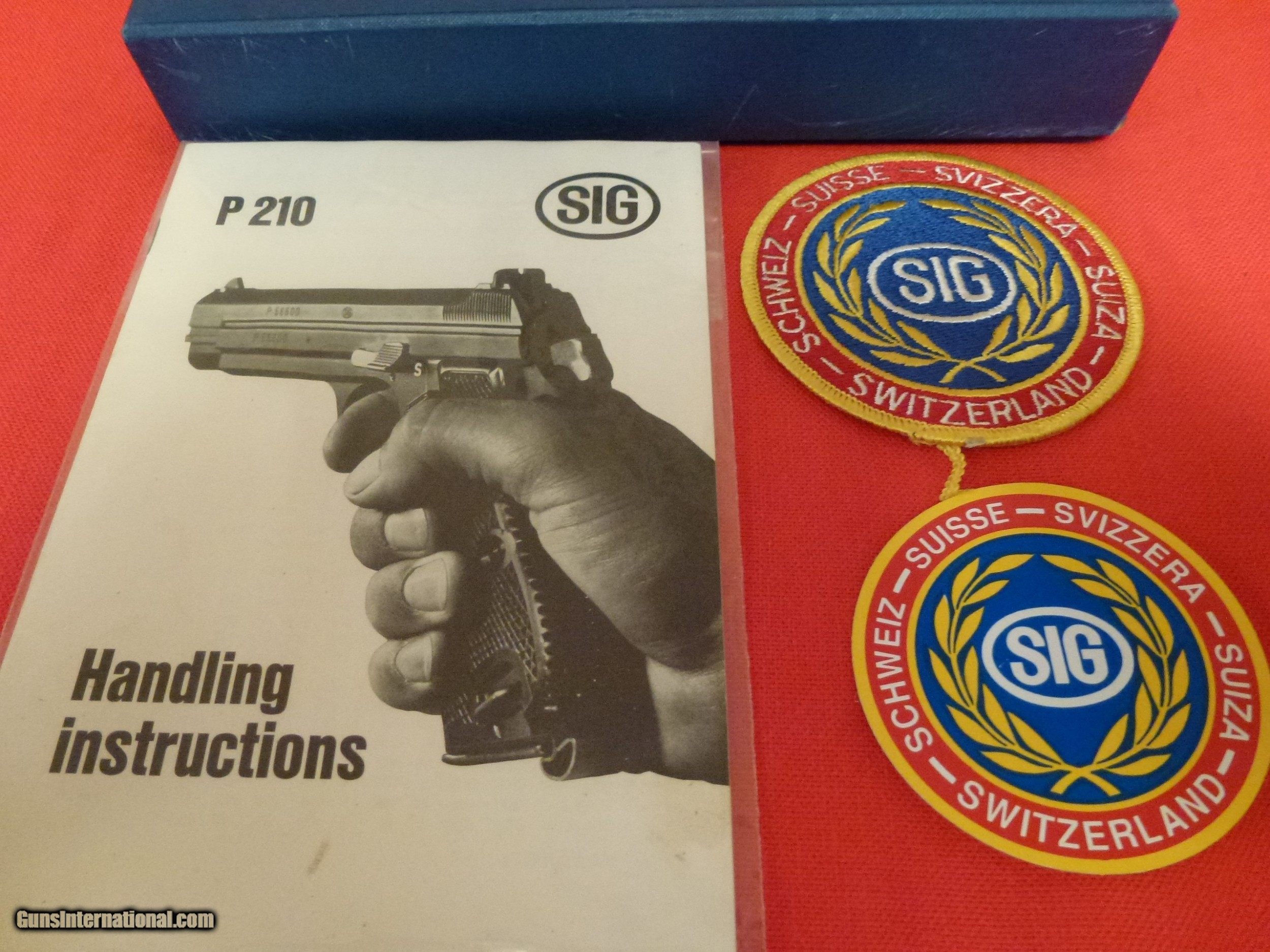 Description: This is one of the finest Sig P210-1 pistols in the United States. This pistol has the highly polished blue finish. The frame has a slight plum color that is often seen in guns manufactured in the 1960's. This gun was manufactured in Switzerland for the American market and was imported by Casanova's of Milwaukee, Wisconsin. It comes with the original blue box, an English language manual, 2 SIG patches, 1 original Sig magazine and 1 later Sig magazine. The gun has been fired but it is in 98-99% condition. It has beautiful light colored checkered wood grips that are in mint condition. YOU WILL NOT BE DISAPPOINTED. The gun was manufactured in either 1968 or 1969. Shipping is included in the price. NO RETURNS ALLOWED so please review the pictures and read the full description. Please e-mail me with any questions. SOLD Curio/Relic: Yes Handgun Caliber: 9x19mm Parabellum (9mm Luger, 9x19mm NATO) Manufacturer: Sig Arms Model: P210-1 Serial Number: 62704 Condition: Excellent Metal Condition: Excellent Wood Condition: Excellent Bore Condition: Excellent Action: Semi-Auto Finish: Blue Manufacture Date: 1968 or 1969 Extras: Manual and Sig patches Case: Blue (deteriorated foam was removed) |