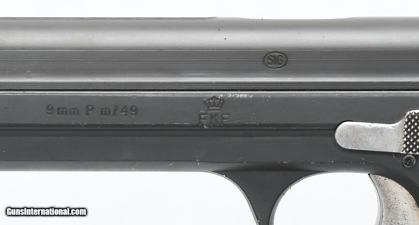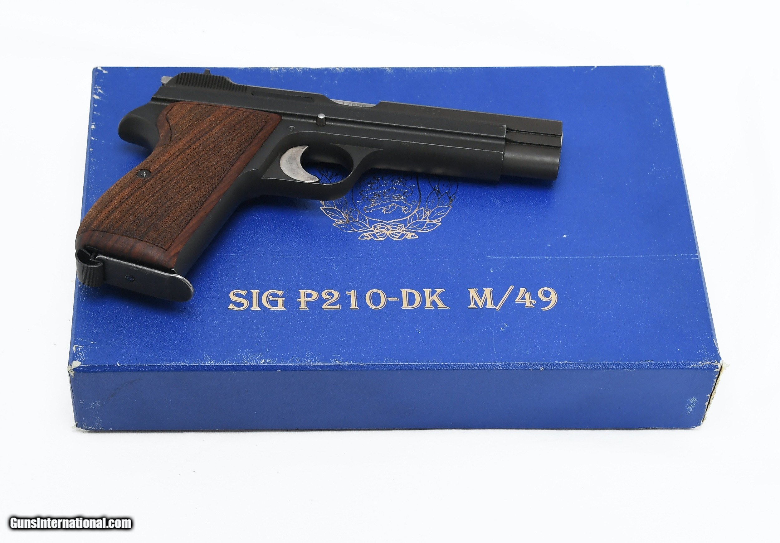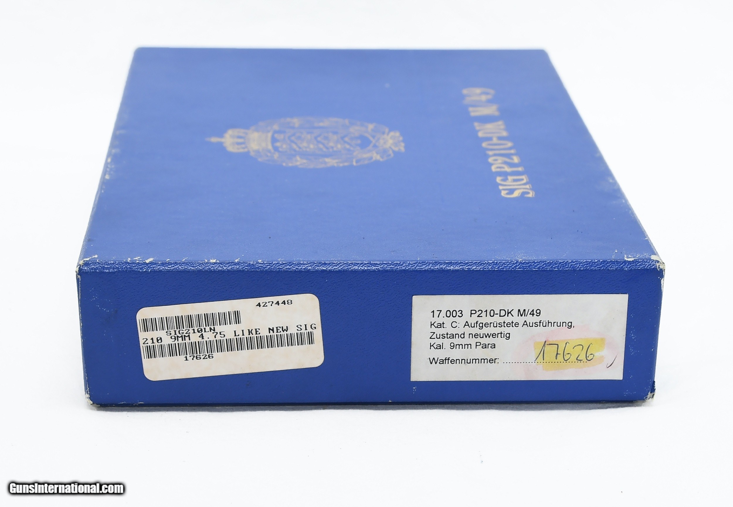 Description: Sig 210 M/49 9mm single action pistol. This is one of the original Swiss made for the Danish Army 210’s and the only thing different on this 210 from when it was issued are the grips. These are correct, lanyard ring Sig 210 grips made from “stippled” wood with nice palm swells, whereas in original military configuration the grips would have been plastic. One magazine and the original box with foam interior that is disintegrating from age come with this 210. 97% original condition. These 210’s are often regarded as the best shooting 9mm pistols ever made! $3,160.00 SN: 17626 SOLD |