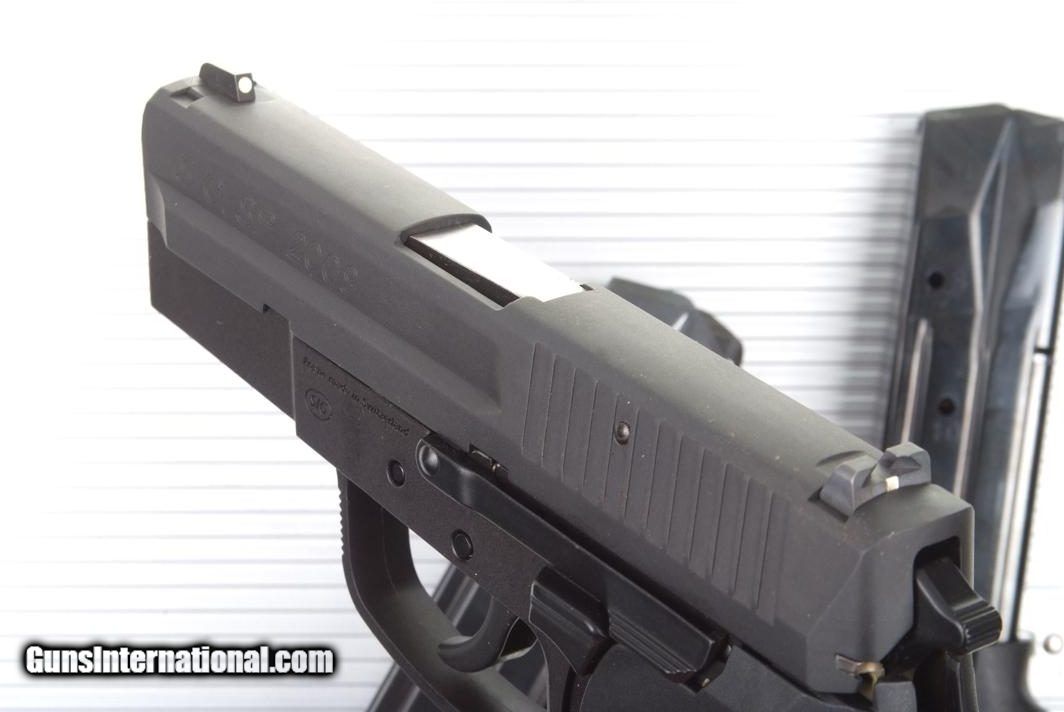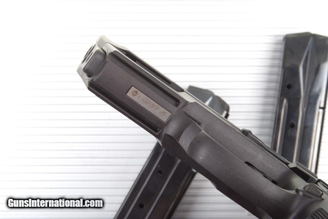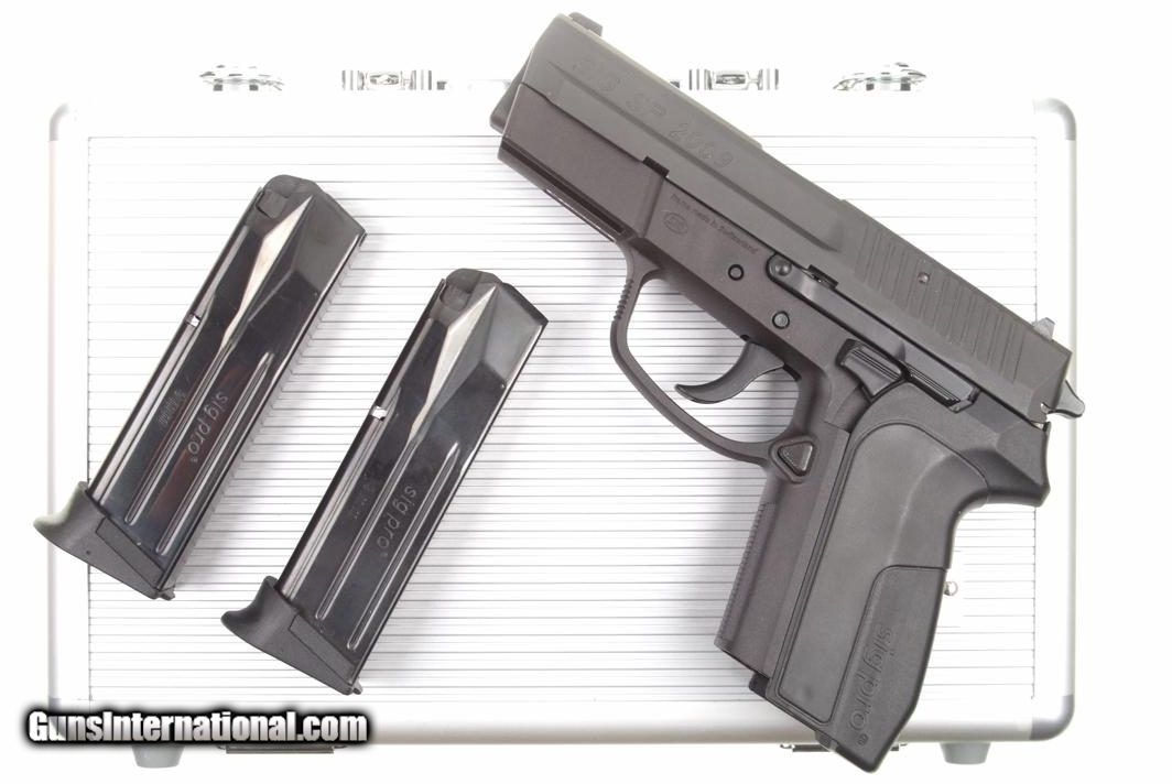 Description: Standard configuration SP2009 with 3.75" barrel and drift adjustable white highlighted sights. A high tech polymer SA/DA pistol, magazine release set up for right handed shooter, with tactical rail. Left side of slide marked with model. Frame molded with SIG logo, its manufacture in Switzerland, product warning, and full serial number on inserted metal strip on forward frame. Smooth Grips, each side marked "sig pro". High capacity "sig pro" magazine marked with caliber; capacity holes marked "5,10,15". Made in Italy by "MEC CAR". Complete with plastic pseudo-aluminum carrying case with key. Synopsis: SIG SP2009, Commercial, spare magazine, case. Condition: Excellent ++, near new, with only the most minor rub mark on the right side of the chamber from racking the slide back. The same crisp condition applies to the grips and each of the magazines that show virtually no insertional wear. Mirror bore with sharp rifling. Perfect manual mechanics. A modern Sig Pistol, made in Switzerland, that should appeal to anyone wanting a light weight high capacity carry/sport pistol. ~~Insured shipping fee of $55; most packages shipped using FedEx 2nd Day.~~ SOLD Manufacturer: SIG Serial Number: SP0065865 Caliber Info: 9mmP |