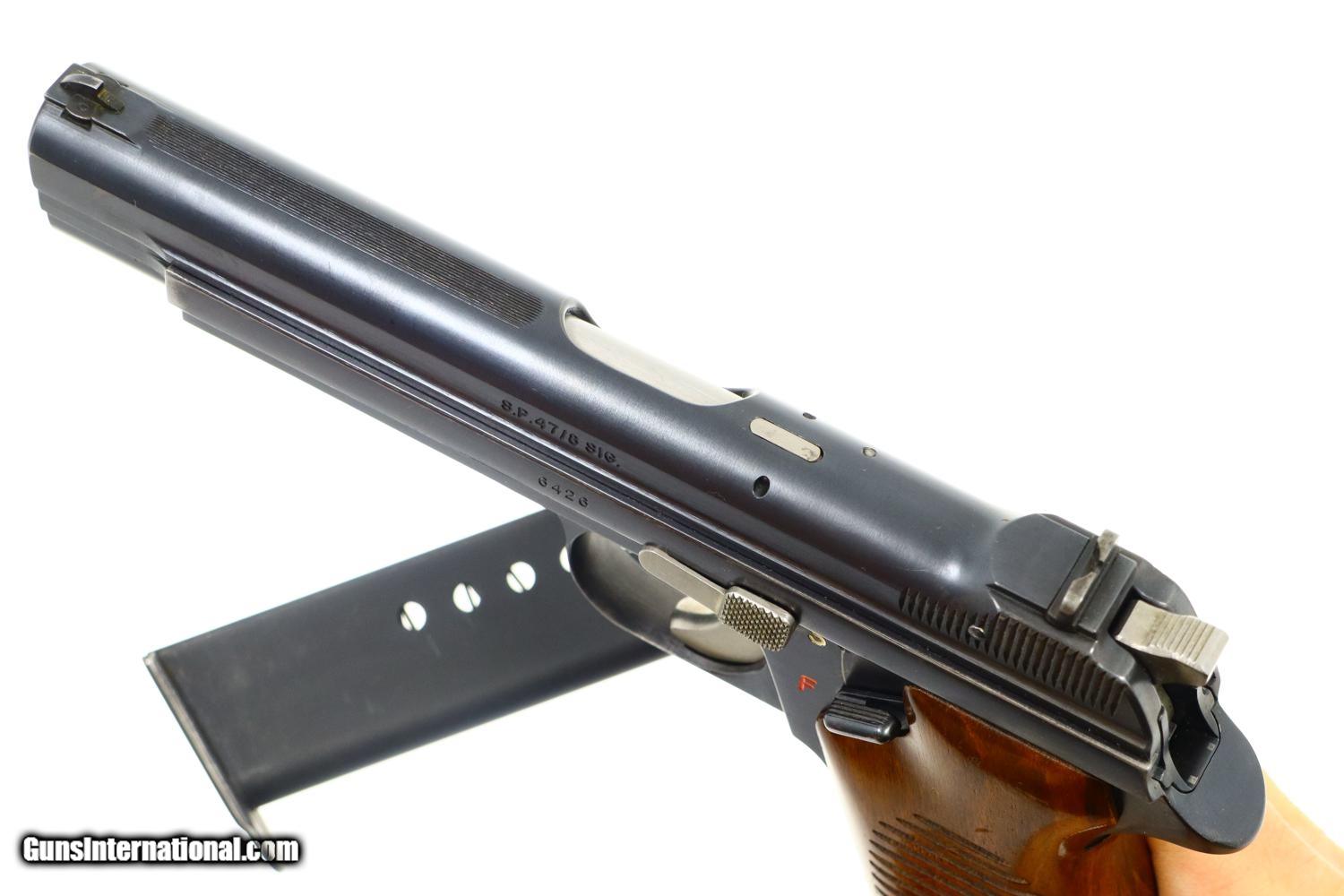 Description: Synopsis: Super Early SIG, SP 47/8, 7.65mm, 6426, FB00898 Description: This SIG is the 426th production P210 configuration pistol, the series starting at SN 6001, different from later by virtue of its slide markings, manner of numberation, and rust blue finish. This single action pistol has a 4.75” barrel, drift adjustable semi patridge front sight, drift adjustable rear sight, and loaded indicator. The left side of the slide is marked "S.P.47/8 SIG". The full serial number is repeated on the left side of the frame, the right side of the barrel hood and under the slide/over the firing pin housing. The hammer group, without half cock, is unnumbered. Safety detents are marked with an “S” in white and “F” in red. Fitted with serrated walnut grips, no lanyard ring on the left side as correct for these Swedish contract pistols. Secured with fire blued screw and unmarked matte magazine with 7 indicator holes and removable floorplate. Condition: Approximately 92-95% bright, original blue with most of the wear on the tip of the rails and on frontstrap. Comparable condition grips that retain most of their original varnish. Mirror bright bore. Perfect manual mechanics. One of the earliest SIG pistols, made before the either the P210 or the P49 series went into production, this example in the scarcer 7.65mmP. A real gem for the advanced collector. ~~Insured shipping fee of $155; most packages shipped using FedEx 2nd Day.~~ SOLD Manufacturer: SIG Serial Number: 6426 Caliber Info: 7.65mm |