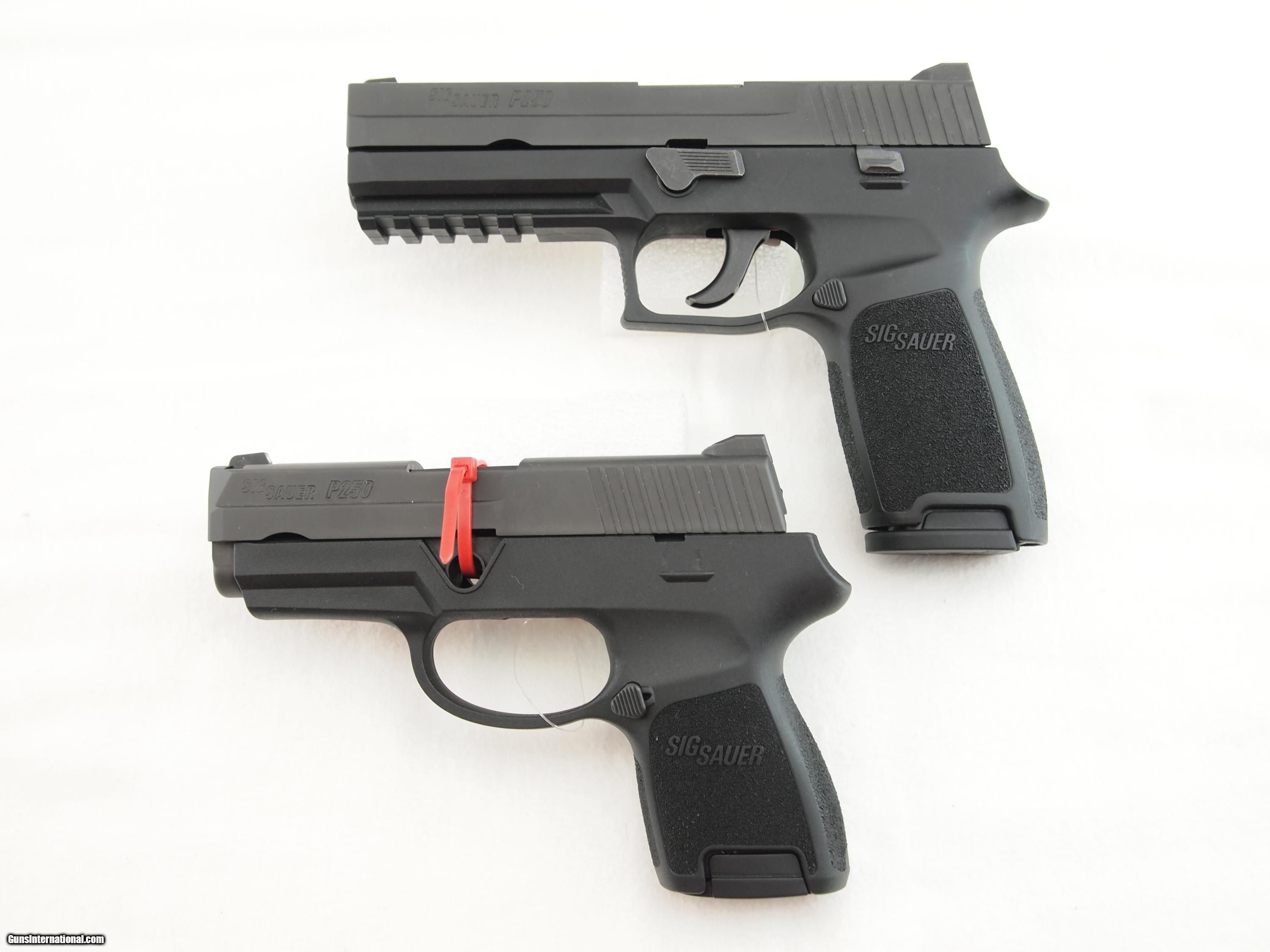 Description: SigSauer, P250, 250F-9-2SUM, 9X19mm, modular pistol that allows the shooter to change caliber and grip size at will. This set contains a 9mm action with one full frame and slide with a 4.7" bbl. and one sub-compact frame and slide with a 3.6" bbl. Each slide is equipped with night sights and a black Nitron finish. Both have black polymer frames and come with a magazine. This pistol and conversion kit are in 99% condition. Very nice! Add 3% for Credit Card Shipping $25.00 SOLD |