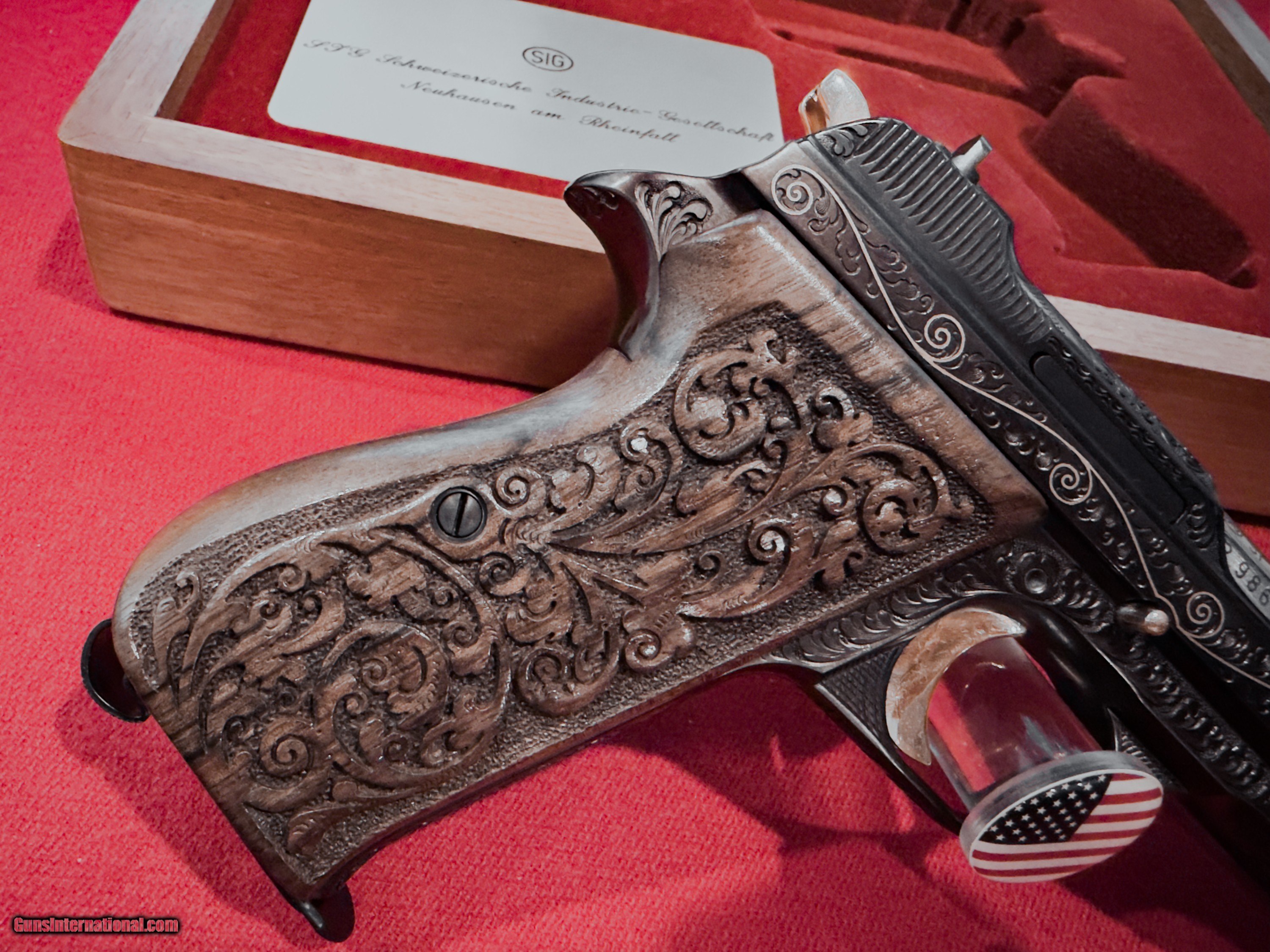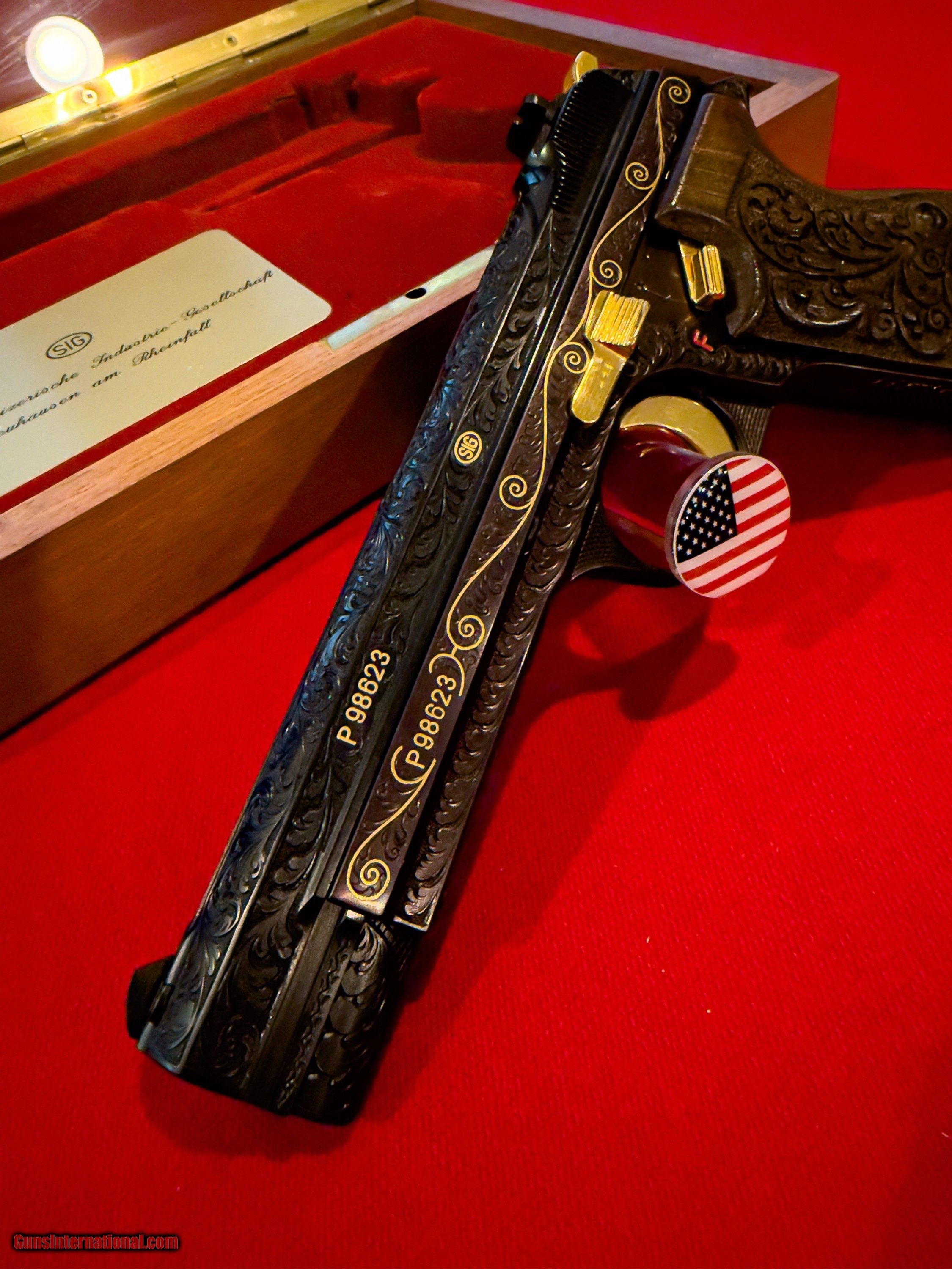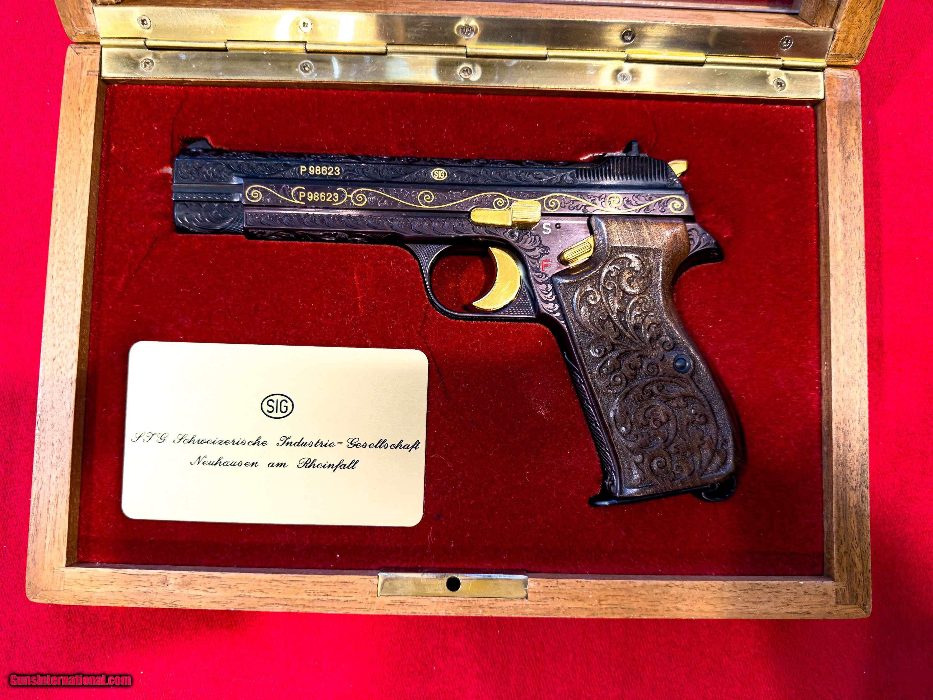 Rare & Beautiful Sig Sauer P210 Luxury Engraved With Exquisite Gold Inlay W/ Glass Top Wood Presentation Case