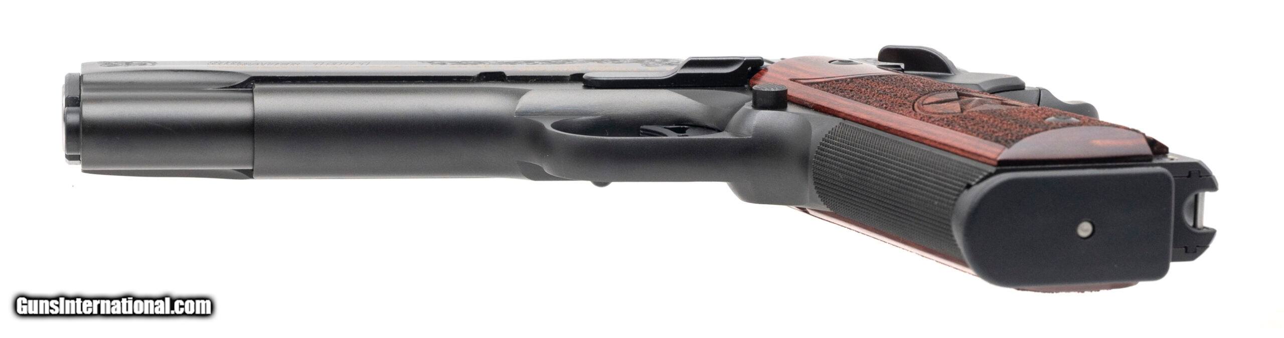 Description: "SN: 54B111032. Modern production, .45 ACP with a 5"" barrel. Bore is very good. Commemorative government size steel frame pistol with front night sight, ambidextrous manual thumb-safety, engraved polished blue finished slide w/gold accents, and stippled medallion wood grips. Includes an additional magazine, and original case. Overall condition is excellent. Price: $1,895.00 Contact Seller |