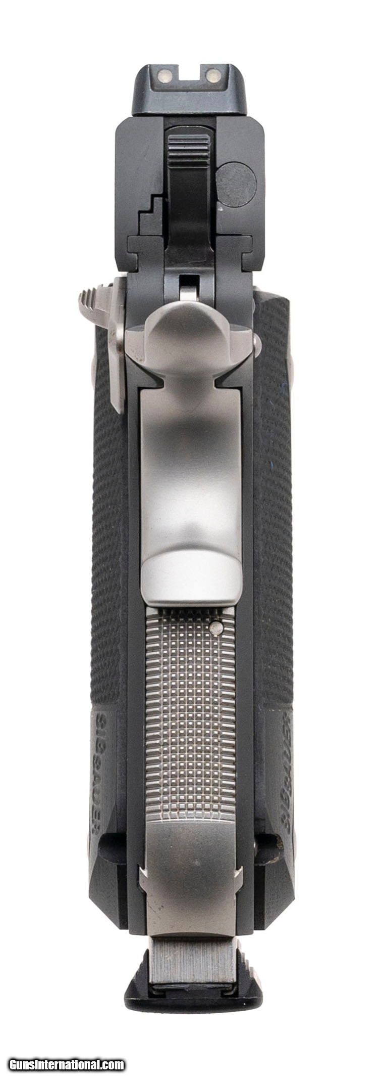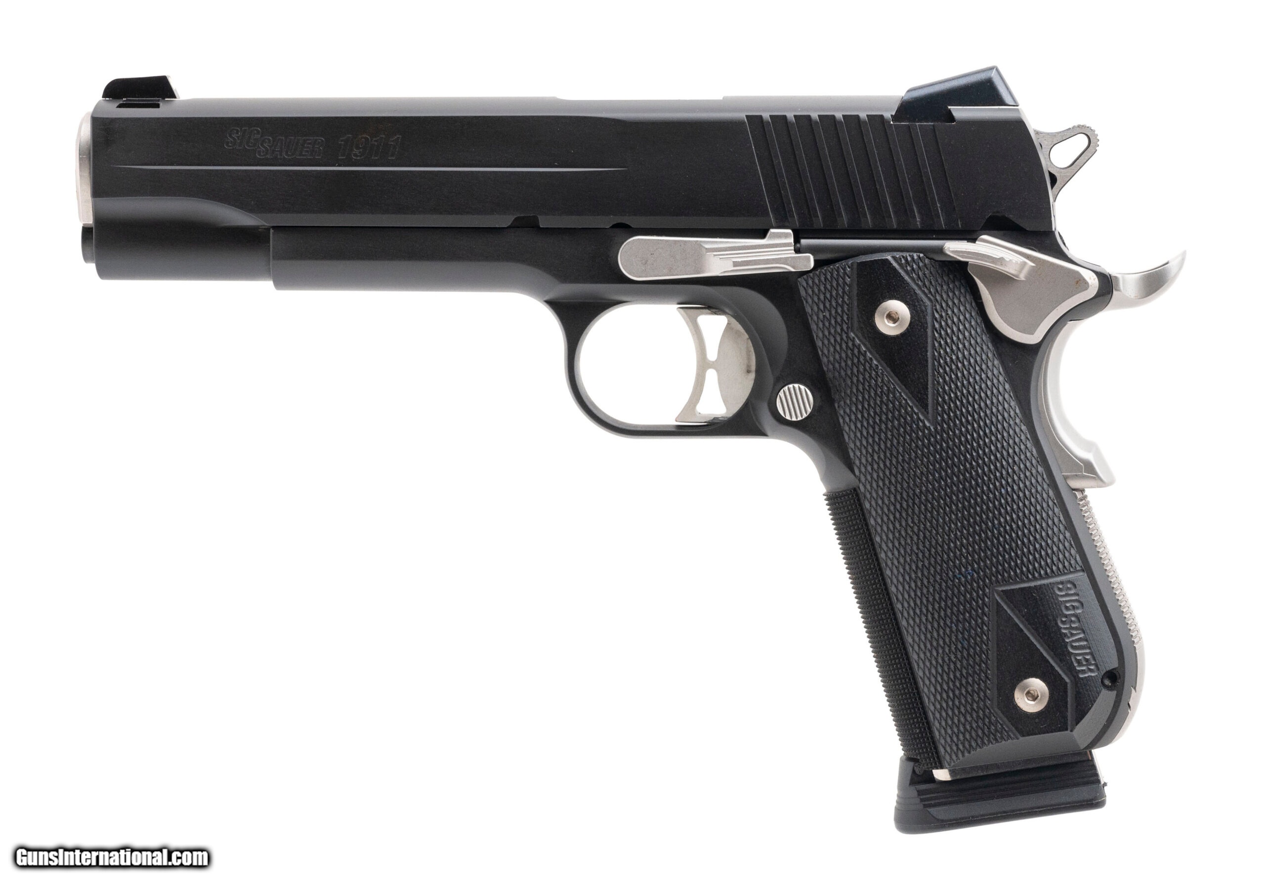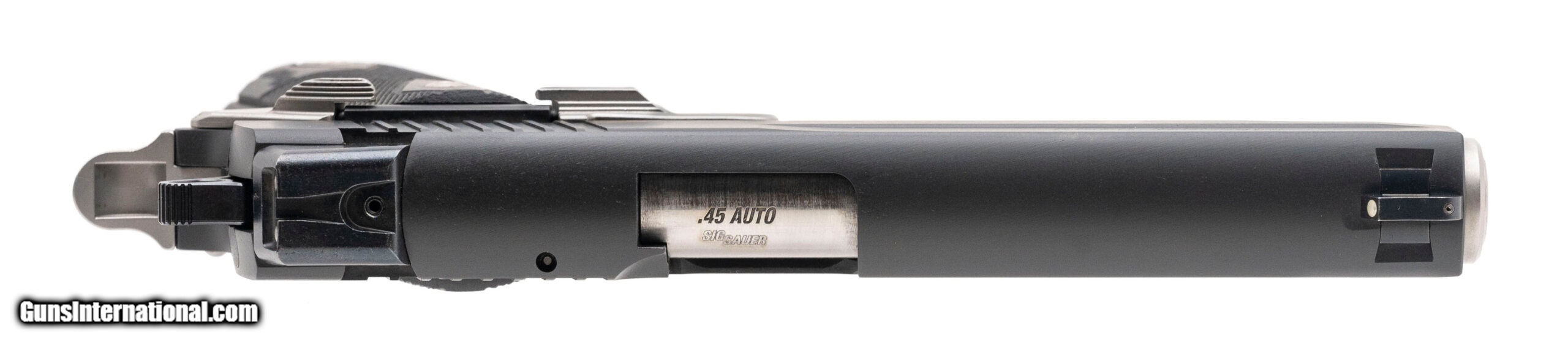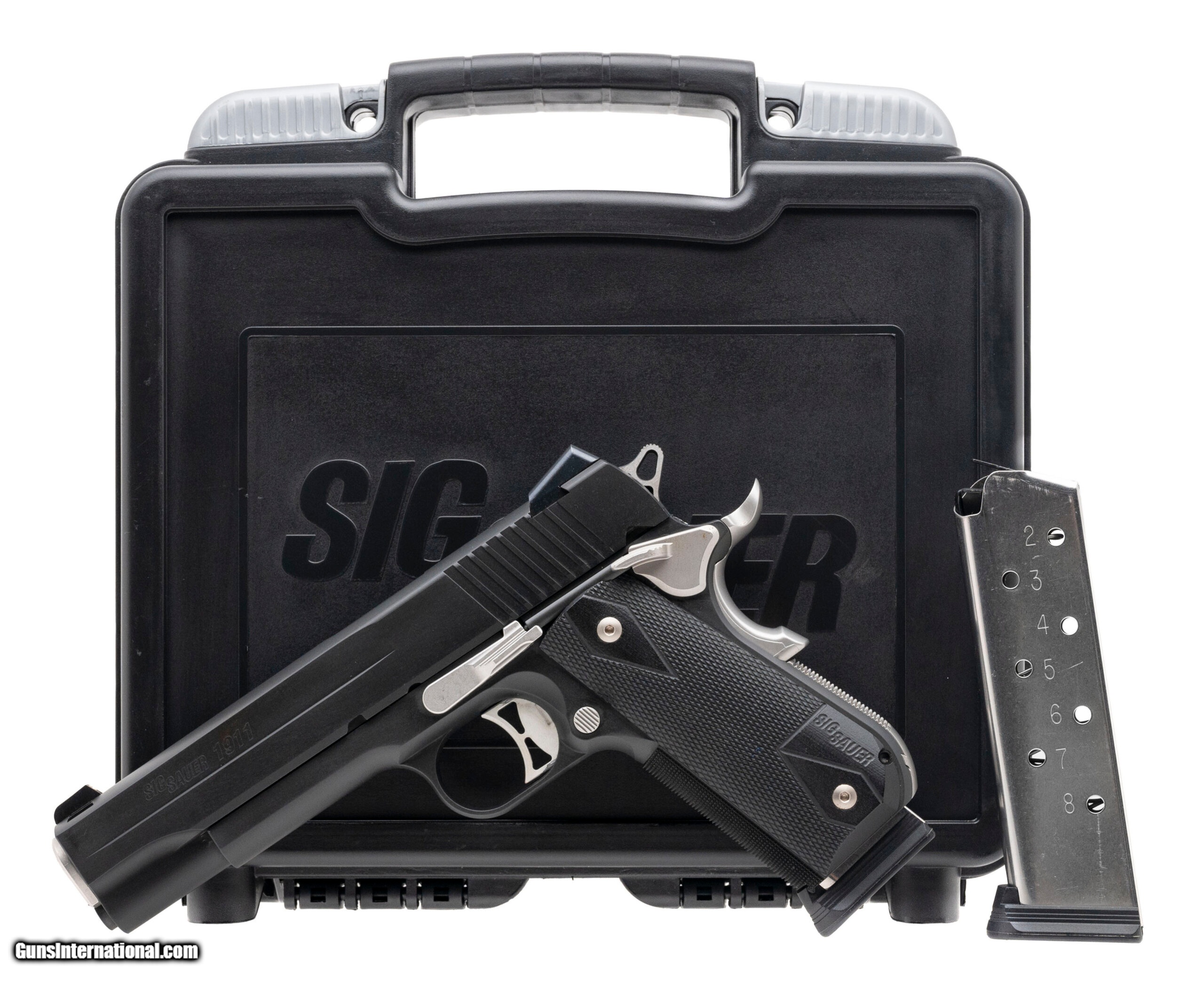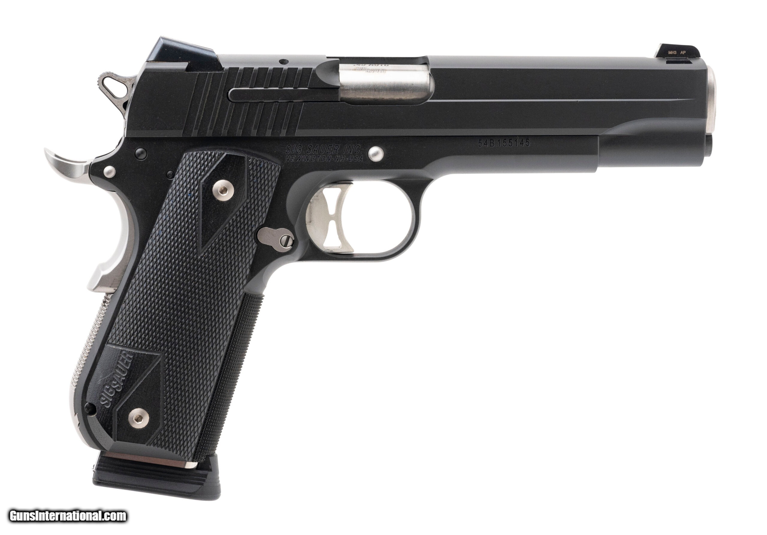Description: "SN: 54B155145. Modern production. .45 ACP with a 5" barrel. Bore is in very good condition. Sig Sauer full size 1911 steel frame pistol. Finish is in very good condition with holster wear. Grips are in very good condition. Overall condition is very good. Comes with case and extra magazine. SOLD |