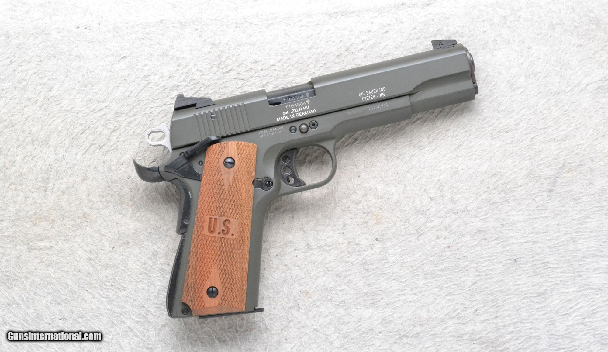 Description: This Sig Sauer Model 1911-22 is a right hand semi-auto pistol in .22 LR HV Cal. It has a 5 inch barrel with a rear serrated slide. A blade front sight and notch rear sight, both with yellow sight dots. The grip panels are a diamond checkered hardwood with U.S. laser cut into them. The back strap is grooved. It has a grooved adjustable 3 hole trigger. .22 Long Rifle SOLD Chambers: 10 round magazine. Metal Condition: Excellent. Wood Condition: Excellent. Bore Condition: Excellent. Barrels: 5 inch barrel with a rear serrated slide. Weight: 36 oz. Sights: Blade front. Notch rear. Yellow sight dots. Item Location: Richfield, WI |