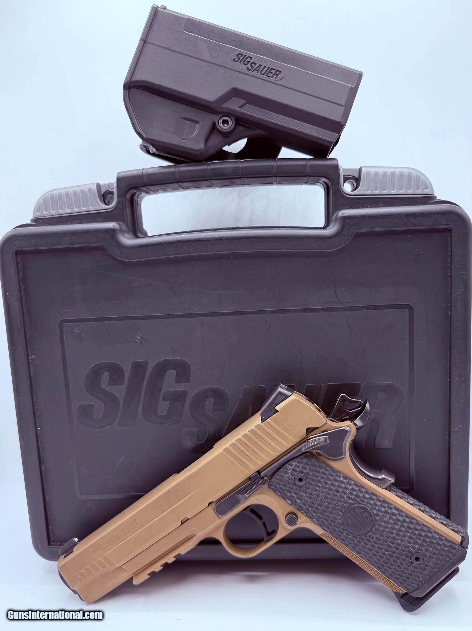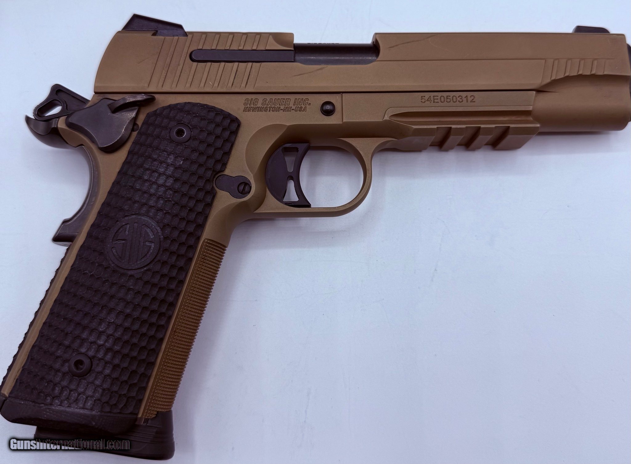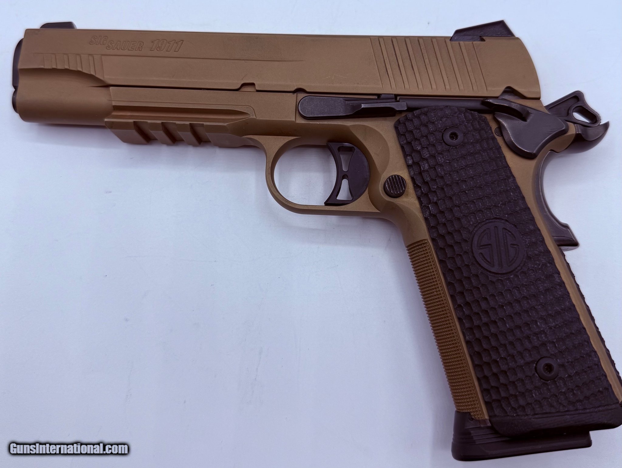 Description: Guns Listing ID: 578105 This model is the SIG Sauer 1911 semi auto pistol. Which comes standard with a 8 round magazine, Custom G10 Grips, SIGLite Sights and a PVD Flat Dark Earth Finish. Specs & Features: SIG Sauer 1911 .45 ACP 5\" Barrel SIGLite Night Sights 8 Round Magazine SIG Rail (M-1913 Picatinny Compatible) Stainless Steel Frame (PVD Finish) Stainless Steel Slide (PVD Finish) Single Action Only Trigger System Piranha Textured Custom G10 Grips Dark Controls Forward Cocking Serrations PVD Finish - Flat Dark Earth 0386263 - TMM - EL Manufacturer: SIG SAUER Model: 1911 Caliber Info: .45 ACP Condition: Used - Non-Certified Barrels: 5" BARREL Action: SEMI AUTOMATIC Finish: DESERT BROWN Price: $1,199.99 Contact Seller |