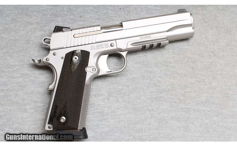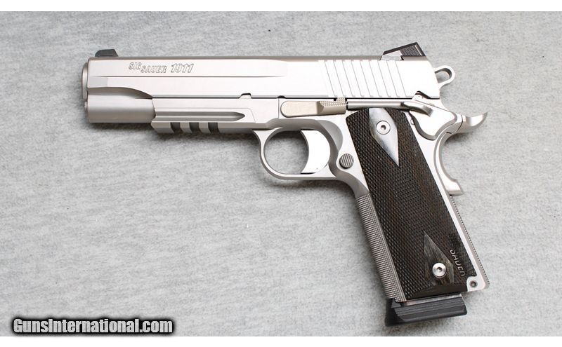 Description: Excellent, light wear and handling marks, comes with 5 mags and hard case. Sig Sauer 1911 type semi auto stainless pistol, 5" barrel, night sights, aluminum trigger, lightweight hammer and extended grip safety. Pistol also has checkered front strap and mainspring housing, integral accessory rail and black factory grip panels. .45 Auto SOLD Chambers: Semi auto Metal Condition: Excellent Wood Condition: Grips are excellent Bore Condition: Bright Barrels: 5 Triggers: Single action Fore End: Rail for accessory mounting Butt Pad: Factory grips Sights: Night sights Item Location: La Vista, NE |