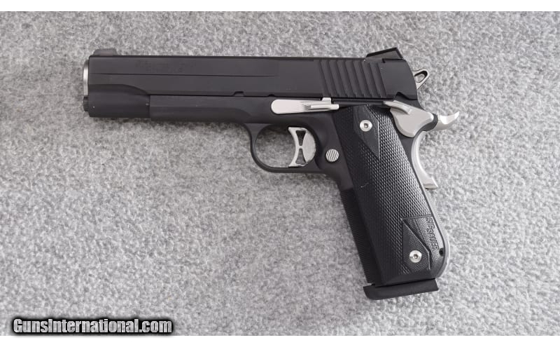 Description: This Sig Sauer 1911 in .45 Auto is in very good condition. It features three dot nite sights. The frame features a bobtail main spring housing. Extended thumb safety and beavertail. Ships in the original Sig Sauer box along with one (1) magazine. .45 Auto SOLD Metal Condition: Very Good Bore Condition: Excellent Barrels: 5 Triggers: Factory Butt Pad: Checkered Two Panel Grips Weight: 2.5 lbs Sights: Three Dot Night Sights Item Location: Wheeling |