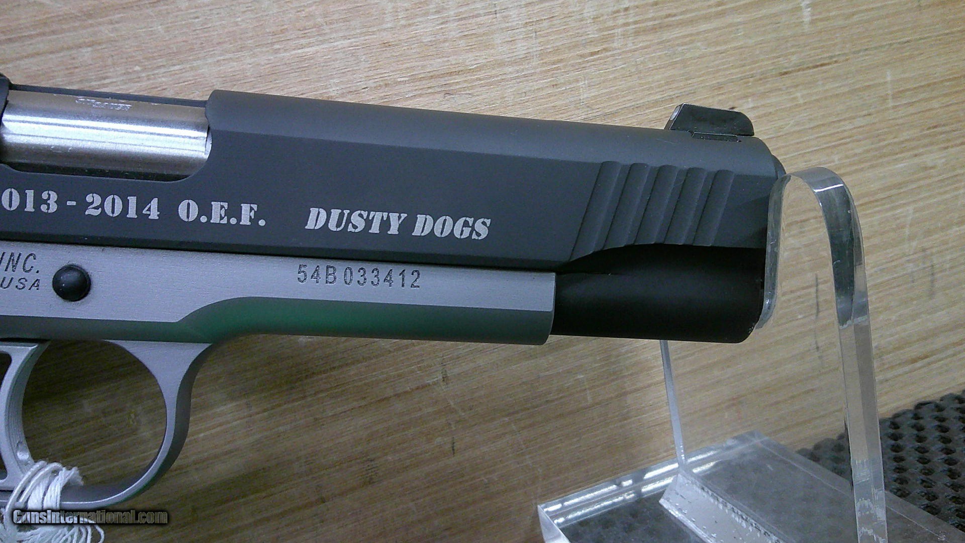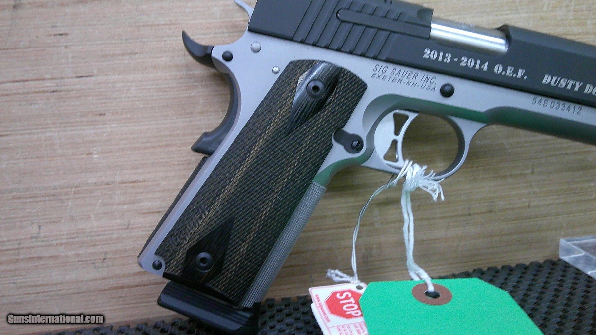 Description: CONSIGNMENT USED VERY GOOD CONDITION SIG SAUER 1911 DUSTY DOGS SPECIAL CONFIGURATION .45 ACP W1911-45-SP -- 5" BARREL -- 2 TONE -- 3 - 8 RND MAGS HAS 2013 - 2014 O.E.F. DUSTY DOGS ON RIGHTHAND SIDE OF SLIDE WITH FACTORY HARD CASE HAS BEEN FIRED SOME ****PLEASE CALL IN THE WITH THE SELLER’S INVENTORY NUMBER IF INQUIRING ABOUT A FIREARM****** WE DO NOT SHIP FIREARMS AND/OR FIREARMS’ PARTS OUT OF THE 50 UNITED STATES, SO DON’T ASK—YOU NEED TO KNOW IF FIREARM IS LEGAL FOR YOUR STATE PRICE REFLECTS PAYMENT BY MONEY ORDER / CASHIERS CHECK. A 3% PREMIUM IS ADDED FOR CREDIT CARDS. WE DO ACCEPT PERSONAL OR BUSINESS CHECKS, BUT THERE IS A GRACE PERIOD OF 10 BUSINESSS DAYS ON THEM. Shipping is $60 for handgun and $50 for long gun. Shipping to Alaska and Hawaii will be more based on weight of firearm. USPS SHIPPING IS HIGHER. WE DO OFFER LAYAWAY PLANS FOR 30,60, OR 90 DAYS.NOT ON CONSIGNMENT GUNS THERE IS A $5.00 CHARGE FOR EVERY 30 DAYS ITEM IS ON LAYAWAY. WE ALSO REQUIRE A 20% DOWN PAYMENT ON TOTAL OF LAYAWAY SALE. LAYAWAYS ARE NON- REFUNDABLE. HERE IS HOW THIS PROCESS WORKS. YOU WOULD CALL US AT 540-337-9218 WITH LISTER # TO PURCHASE THE GUN. THEN ONCE I HAVE RECEIVED PAYMENT AND AN FFL (FEDERAL FIREARMS LICENSE) FROM A LICENSED DEALER IN YOUR AREA OF YOUR CHOICE. WE WILL THEN SHIP THE GUN TO THEM. YOU WOULD THEN PICK UP THE GUN AT YOUR LOCAL DEALER AND DO PAPER WORK THERE. Please have your FFL Dealers contact information when you call. DOMINION OUTDOORS 15 ANGELA COURT FISHERSVILLE, VA 22939 540-337-9218 540-337-2422 fax M – F 9 a.m. to 6 p.m. ETZ Sat 9 a.m. to 4 p.m. ETZ ****PLEASE CALL IN THE WITH THE SELLER’S INVENTORY NUMBER**** ***PLANO HARD CASES AVAIABLE FOR PURCHASE $25.00 WITH THE PURCHASE OF A FIREARM** *** Online prices compared to in store prices will vary. *** SOLD |