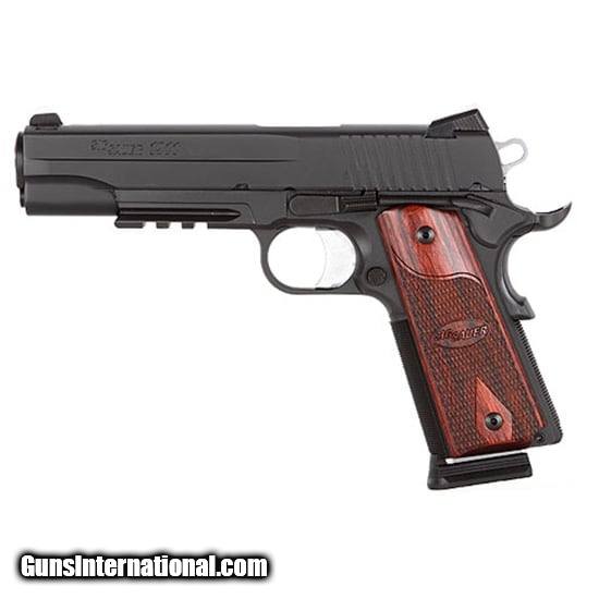 Description: Guns Listing ID: 1253 Built on a proven platform that is more than a century old the SIG Sauer 1911 Full-Size combines the legendary design of the 1911 with modern features for todays firearm enthusiasts. This semi-automatic handgun is made with an all-metal frame and protective coating and features exceptional ergonomics and a crisp single-action only trigger pull. Chambered in 9mm 10mm 45 ACP and 357 SIG the 1911 Full-Size offers a 71 or 81 capacity. Details Action Single - Caliber 45 ACP - Weight 4.600 - Barrel Length 5 - Sights Novak - Frame Material Alloy - Frame Finish Black - Overall Length 10.5 - Height 3 - Width 10 - Magazine Capacity 81 - Grip Rosewood SOLD Manufacturer: SIG SAUER Model: 1911 FULL SIZE CA COMPLIANT RAIL Caliber Info: .45 ACP Condition: new Barrels: 5 BARREL |