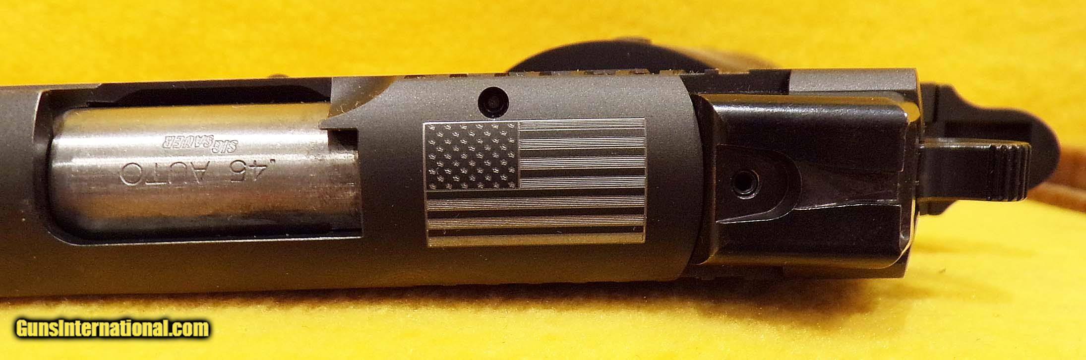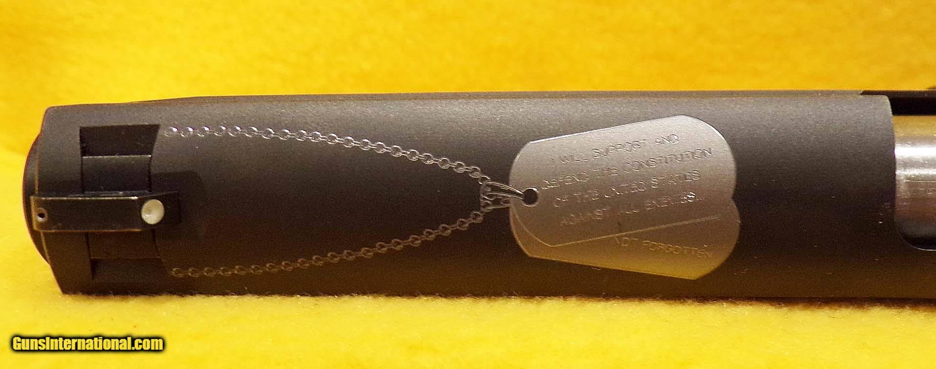 Description: SIG SAUER 1911 POW/MIA LIMITED EDITION IN .45 ACP CAL., WITH 5" BARREL. COLOR MATTE. CONDITION 98% LIKE NEW. SERIAL NUMBER 54B094126. SIG SAUER 1911 POW/MIA LIMITED EDITION IN .45 ACP CAL., COMES WITH TWO MAGAZINES, FACTORY HARD CASE PAPERS, SLIDE HAS DOG TAGS ON TOP WITH AMERICAN FLAG, RIBBONS ON BOTH SIDES OF SLIDE, GRIPS HAVE MIA/POW SYMBOL, 98% LIKE NEW CONDITION. OUR STOCK # D1737 SOLD |