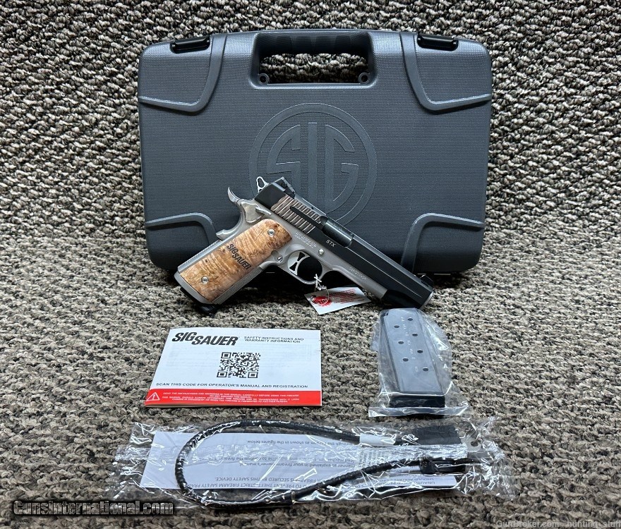 Description: Guns Listing ID: 994914 Sig Pistols are engineered to perform anywhere, at any time, and under any circumstance. They boast unique, advanced features that stand out among the rest. Sig‚‚s 1911 pistols feature exceptional ergonomics, crisp SAO trigger, all-metal frame, rugged construction and protective coating. They have been engineered for today‚‚s shooter with Sig‚‚s reliability and modern refinements. The 1911 Full Size STX model is machined to exacting tolerances and hand-fitted to insure reliability and performance. The frame features 25-line per inch checkering on the front strap, while the mainspring housing has 20-line per inch checkering. Its stainless steel slide is further accented by polished cocking serrations and a flat top which enhances the two-tone aspect of this pistol. The slide is topped off with adjustable combat night sights while the frame is outfitted with a magwell for fast smooth reloads. Additional features includes match grade barrel, hammer/sear set and trigger, and wood grip. This model has a 5\" barrel, SigLite night sights, and comes with two 8-round magazin SOLD Manufacturer: SIG SAUER Model: 1911 STX FULL-SIZE Caliber Info: .45 ACP Condition: Used - Non-Certified Barrels: 5 BARREL |