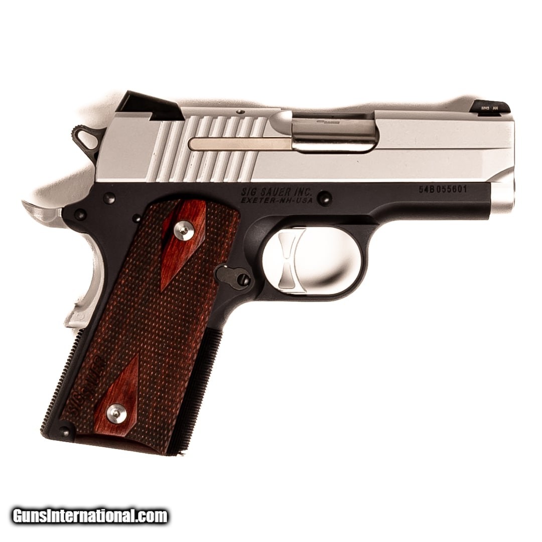 Description: Guns Listing ID: 839224 For sale is a Sig Sauer 1911. This handgun would be perfect for a wide variety of tasks as it is both powerful and reliable. If you‚‚re looking for a trustworthy pistol, it doesn‚‚t get much better than a 1911 made by Sig. This 1911 features night sights and a safety. Purchase includes the original case, manual, and two 7-round magazines. Get the best bang for your buck when you get a Certified Used Firearm . When you see the Certified Used stamp on any of our firearms, you can be confident that you’re getting exactly what you want – a gun only in very good to excellent condition and held to the highest quality standard. All Certified Used Guns come with a ‘no questions asked’ return policy . PLUS, ALL CERTIFIED USED GUNS SHIP FRE SOLD Manufacturer: SIG SAUER Model: 1911 Caliber Info: .45 ACP Condition: Used - Certified Barrels: 3.2 BARREL Finish: TWO-TONE |