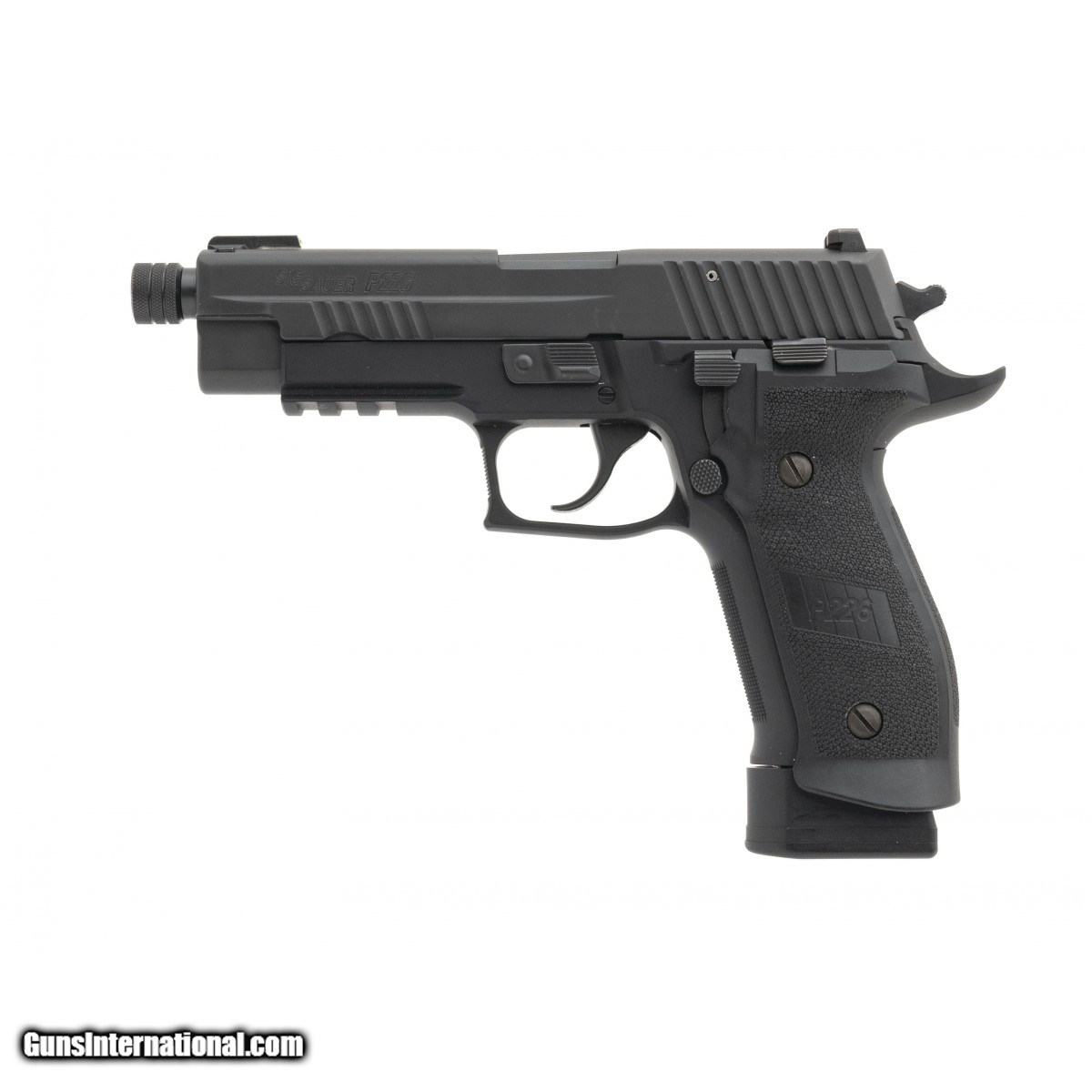 Double action ""TACOPS"" model P226 with 4.9"" threaded barrel, rail, flared magwell and front fiber optic sight. Overall excellent condition. Comes with box and three extra magazines.