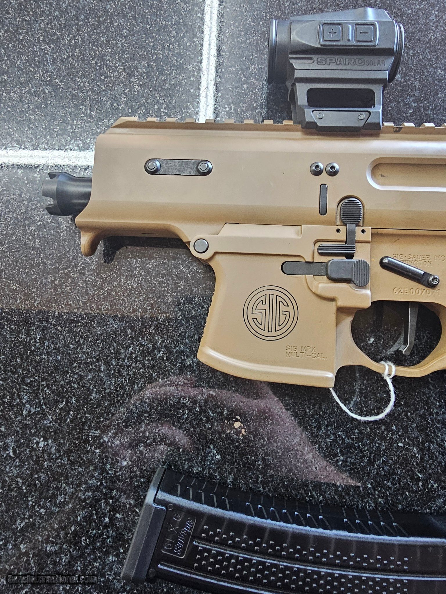 Description: Guns Listing ID: 512237 The SIG Sauer MPX is a highly regarded 9mm semi-automatic pistol designed for tactical use, home defense, and recreational shooting. Developed by SIG Sauer and introduced in 2015, the MPX combines the familiarity of AR-style controls with the reliability of a gas-operated system.? ?? Key Features Caliber: 9×19mm Parabellum Action: Short-stroke gas piston, closed rotating bolt Barrel Lengths: Commonly available in 4.5"", 6.5\", and 8\" Magazine Capacity: 10-, 20-, 30-, or 35-round detachable box magazines; 50-round drum magazine Weight: Approximately 6.1 lbs (2.7 kg) Controls: Fully ambidextrous, including safety selector, magazine release, and charging handle Modularity: Equipped with a full-length Picatinny rail and M-LOK or KeyMod handguards for accessory attachment? ?? Variants MPX Pistol: Semi-automatic version without a stock, featuring an 8\" barrel MPX PSB: Includes a pistol stabilizing brace for improved control MPX K: Compact model with a 4.5\" barrel, ideal for close-quarters scenarios MPX Copperhead: Ultra-compact variant with a 3.5\" barrel and integrated upper receiver/handguard MPX-SD: Integrally suppressed model with an 8\" barrel, designed for reduced sound signature? ? Pros Exceptional Accuracy: The MPX delivers precise shot placement, aided by its stable shooting platform and advanced recoil management system. Reliable Performance: Its robust gas-operated system ensures consistent operation across various conditions and ammunition types. User-Friendly Design: Fully ambidextrous controls and ergonomic features cater to a wide range of shooters. Low Recoil: The short-stroke gas piston system significantly reduces recoil, enhancing control during rapid fire. ? SOLD Manufacturer: SIG SAUER Model: MPX COPPERHEAD Caliber Info: 9MM LUGER (9x19 PARA) Condition: Used - Non-Certified Barrels: 3 Action: SEMI AUTOMATIC Finish: desert tan |