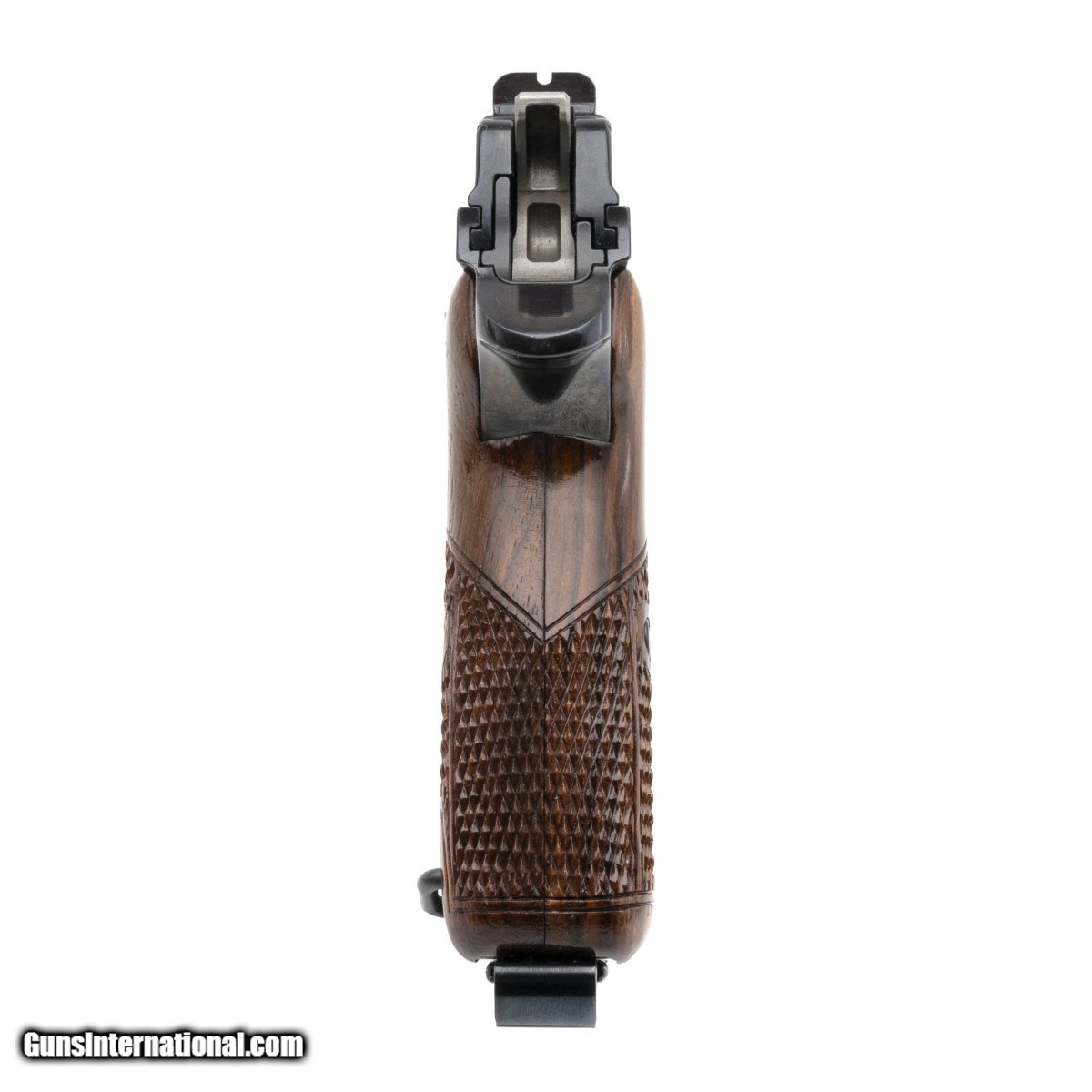 Description: " SN: P66998. 1970's vintage 9mm with a 4.7"" barrel. Bore is excellent. Rare late model P210-1 with polished blue finish and wooden grips, in pristine condition. A very desirable SIG P210. (CONSIGNMENT) SOLD |
