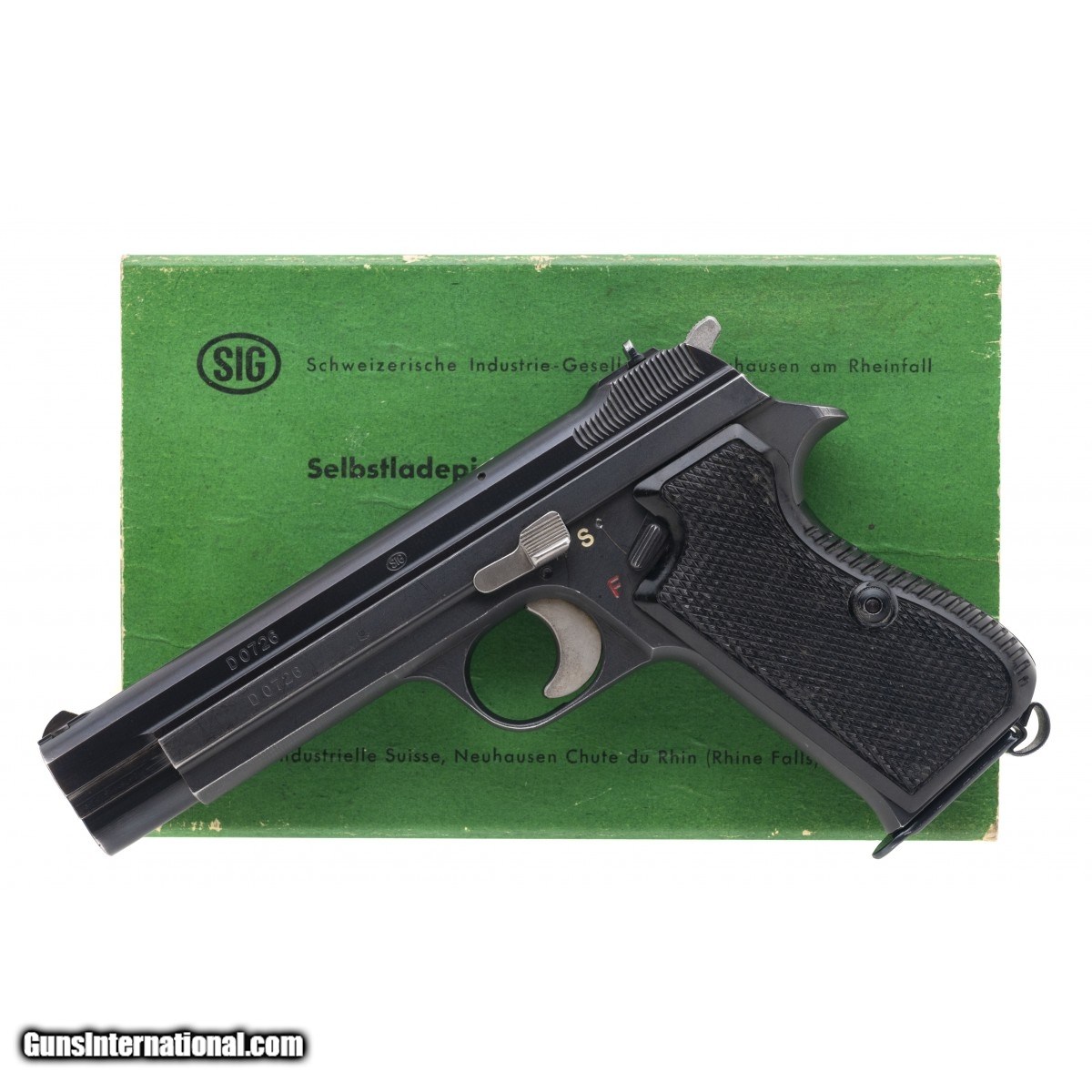 SN: D0726. 1950's production 9mm with a 4.7"" barrel. Bore is excellent. Rare variation of the SIG P210 pistol made for the W. German Border Guards with a loaded chamber indicator on the top of the slide. Very good condition with 90% original finish. Comes with box, manual and cleaning kit. Consignment.