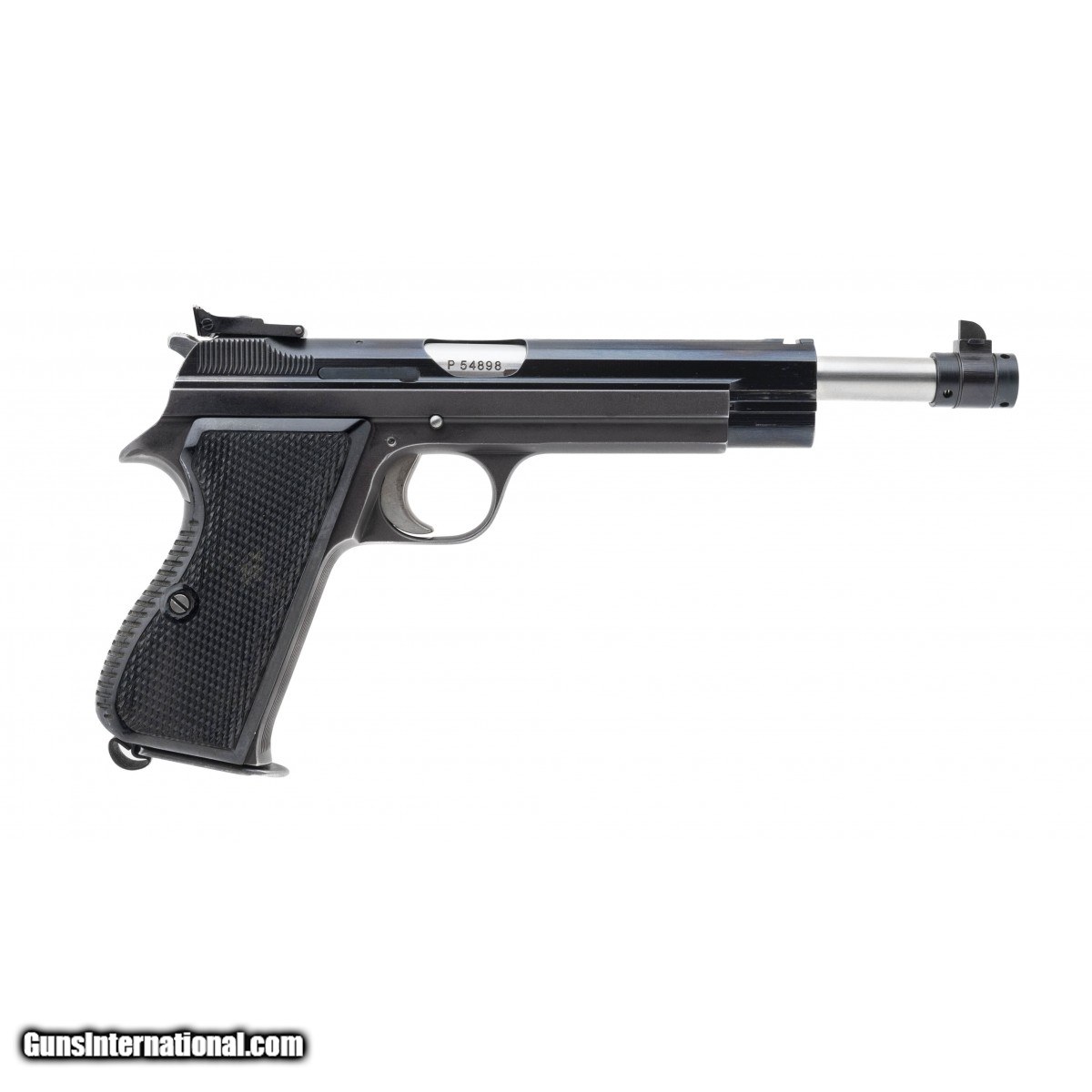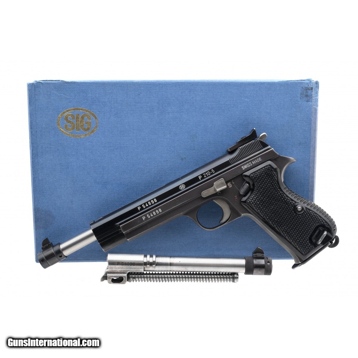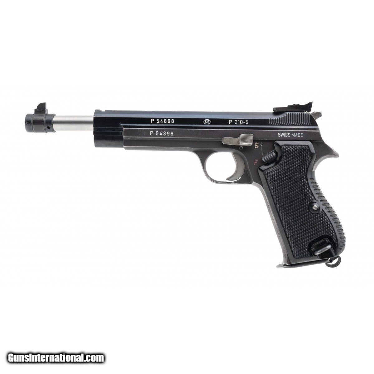 Description: " SN: P54898. 1960's production 9mm with 150mm and 180mm barrels. Bores are excellent. Swiss made target pistol with 2 barrels, each numbered to the gun. Very good original condition with about 90% finish. Has box, manual and accessories. A very rare and collectible Swiss P210. Consignment. SOLD Curio/Relic: Yes |