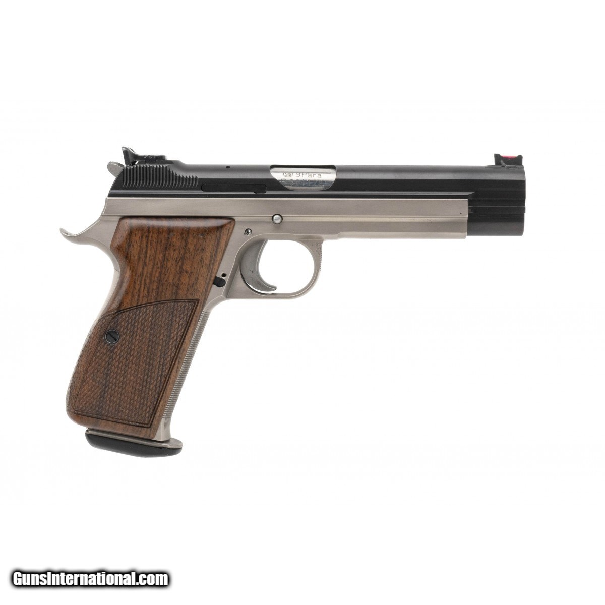 Description: "SN: P301128. 1980's vintage 9mm with a 4.7" barrel. Bore is excellent. An outstanding custom combat conversion, looks like work by Oschatz. Has 2-tone finish, extended controls, added beavertail tang and checkered trigger guard and grip frame. A beautiful piece, in excellent condition with box. (CONSIGNMENT) SOLD |