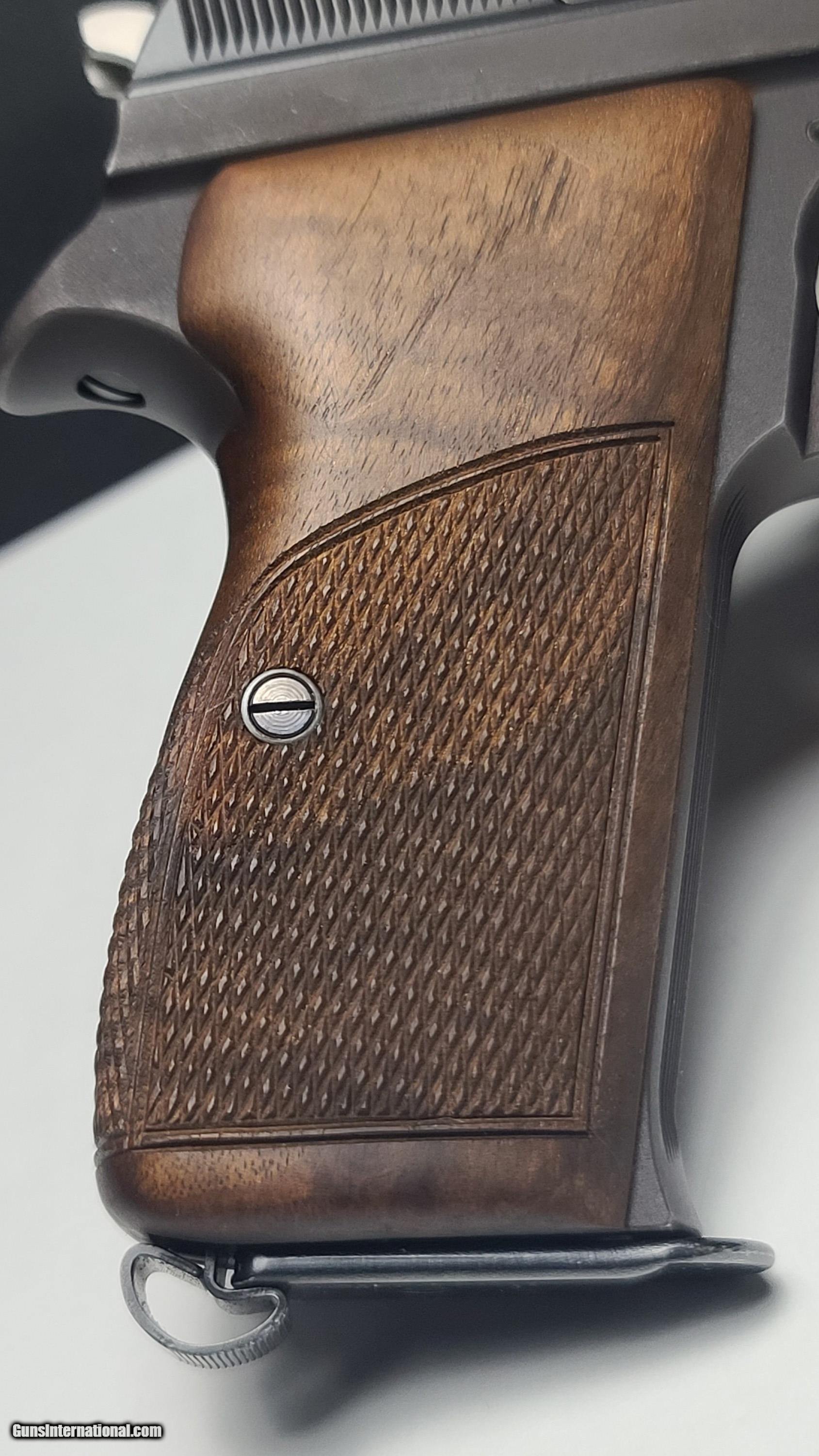 Description: SIG P210-6 Target pistol in 9mm. All numbers match.. The 5" high quality barrel has mirror bright bore with strong lands and grooves. The trigger has butter smooth pull with a crisp clean break. The hammer is built into a removable cage assembly for easy maintenance, fashioned after the Tokarev TT-30 pistol. It’s the highest quality and most accurate pistol I have ever had the pleasure of shooting.. a single-action pistol with a single stack 8 round magazine for easy loading 9mm ammunition.. the pistol is very durable and reliable with slide and frame being machined from cast or forged blocks of steel. The P210's slide rides inside the frame rails, rather than outside as seen in the traditional Browning arms. The location of the slide rails feature mimics the frame-to-receiver interface of its predecessor in Swiss military service, the Luger pistol, allowing for a very tight fit between the slide, barrel, and frame without compromising reliability. The slide rails run the full length of the frame and this rare design and construction contributes to the unusually high accuracy for which the SIG P210 is known. Please look at the pictures and let me know if you have any questions or concerns. Ship to anywhere in USA is 50.00 and FFL is required for transfer, C & R is ok. SOLD Manufacturer: Swiss Waffen Model: P210-6 Barrel Length: 5 Condition: mint Metal Condition: mint Bore Condition: perfect |