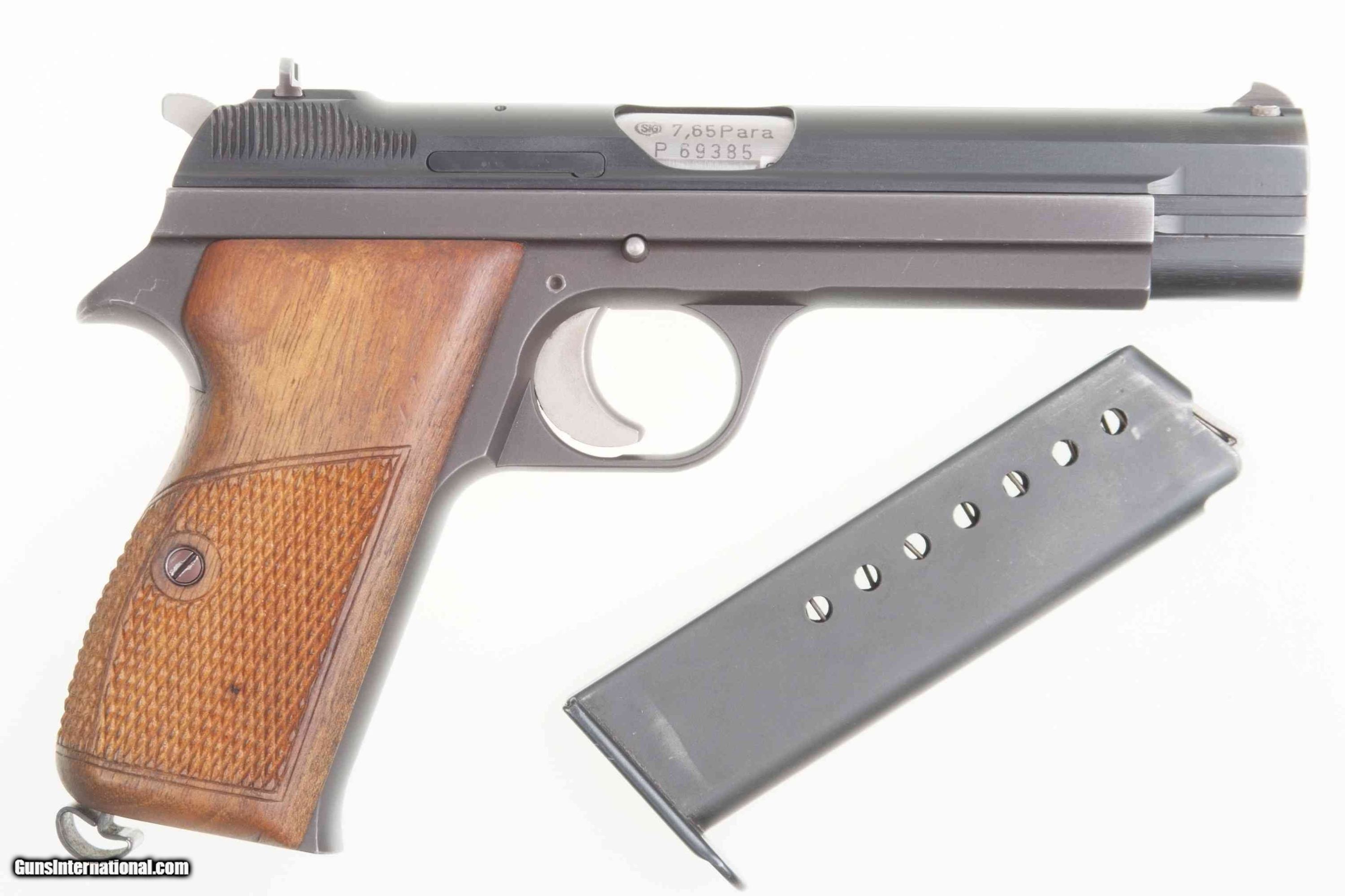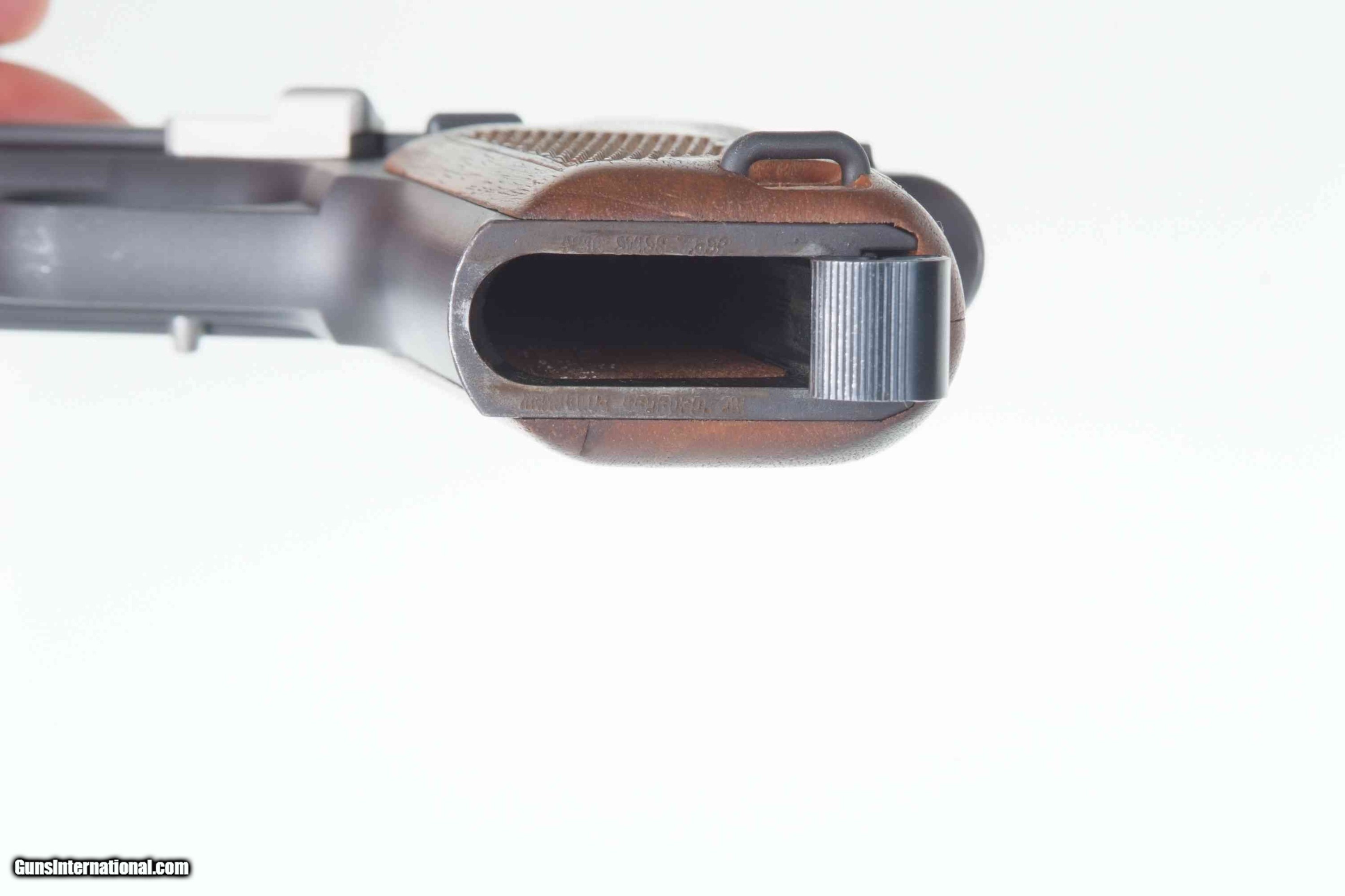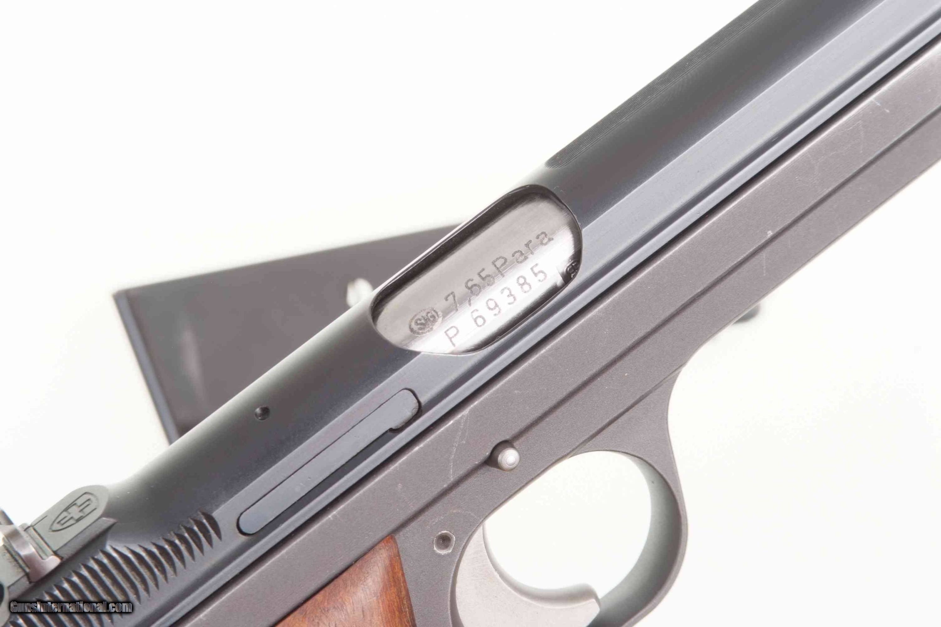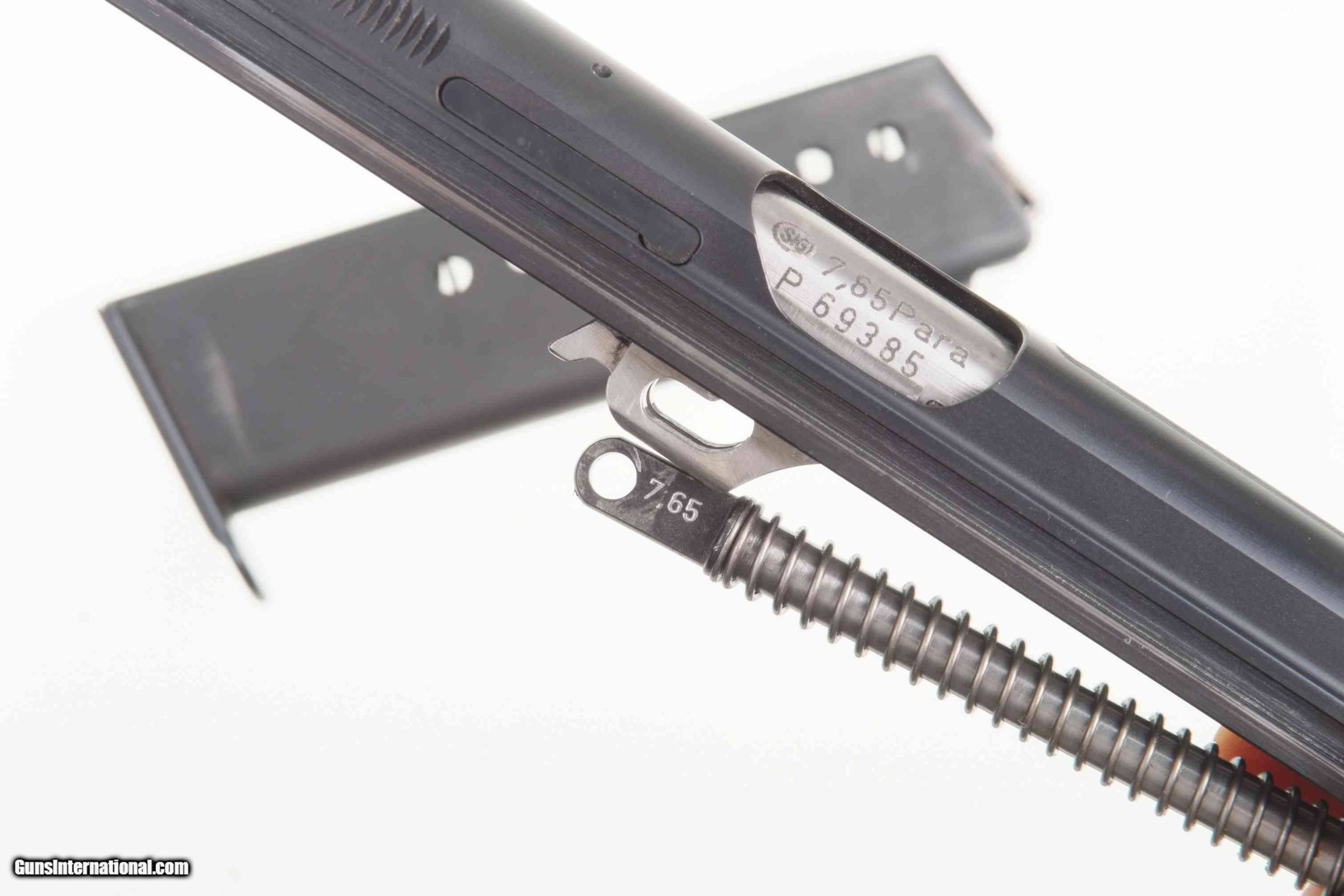 Description: Usual drift adjustable front and rear sight. Swiss cross-in-shield on rear sight base. Left side of slide and frame with full serial number that is repeated along with the SIG logo and “7.65 Para” caliber on the exposed barrel hood. Usual white highlighted S (safe) and red highlighted F (fire). Disassembly shows a matching, half cock hammer group. Slide, frame, safety lever, and magazine release are matte finished with the barrel, hammer, trigger and slide release in the white. Wood checkered grips secured with a single transverse screw. Unnumbered magazine with matte finish as correct for this era pistol. Synopsis: Standard matte finish SIG P210-2 in the commercial “P” prefix serial range with wood checkered grips. SN: P69385. Cal: 7.65P (Luger). Condition: Excellent original condition, approximately 97-98%, with mirror bore and perfect manual mechanics. Comparable condition grips that are sharply checkered and no cracks. A great gun, equally at home at the range or in your collection. ~~Insured shipping fee of $65; most packages shipped using FedEx 2nd Day.~~ SOLD Manufacturer: SIG Serial Number: P69385 Caliber Info: 7.65 Para |