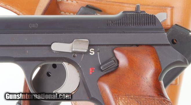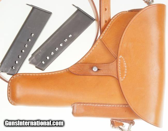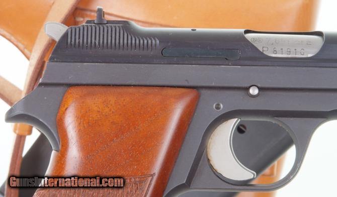 Usual drift adjustable front and rear sight. Swiss cross-in-shield on rear sight base. Left side of slide and frame with full serial number that is repeated along with the SIG logo and “7.65 Para” caliber on the exposed barrel hood. Usual white highlighted S (safe) and red highlighted F (fire). Disassembly shows an unnumbered half cock hammer group, correct for commercial pistol. Slide, frame, safety lever, and magazine release are matte finished with the barrel, hammer, trigger and slide release in the white. Checkered grips secured with a single transverse screw. Unnumbered magazines with matte finish as correct for this era pistol. Light tan holster and strap with manufacturer logo on hold-down tab.