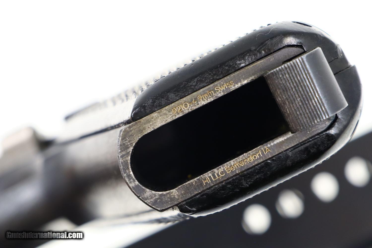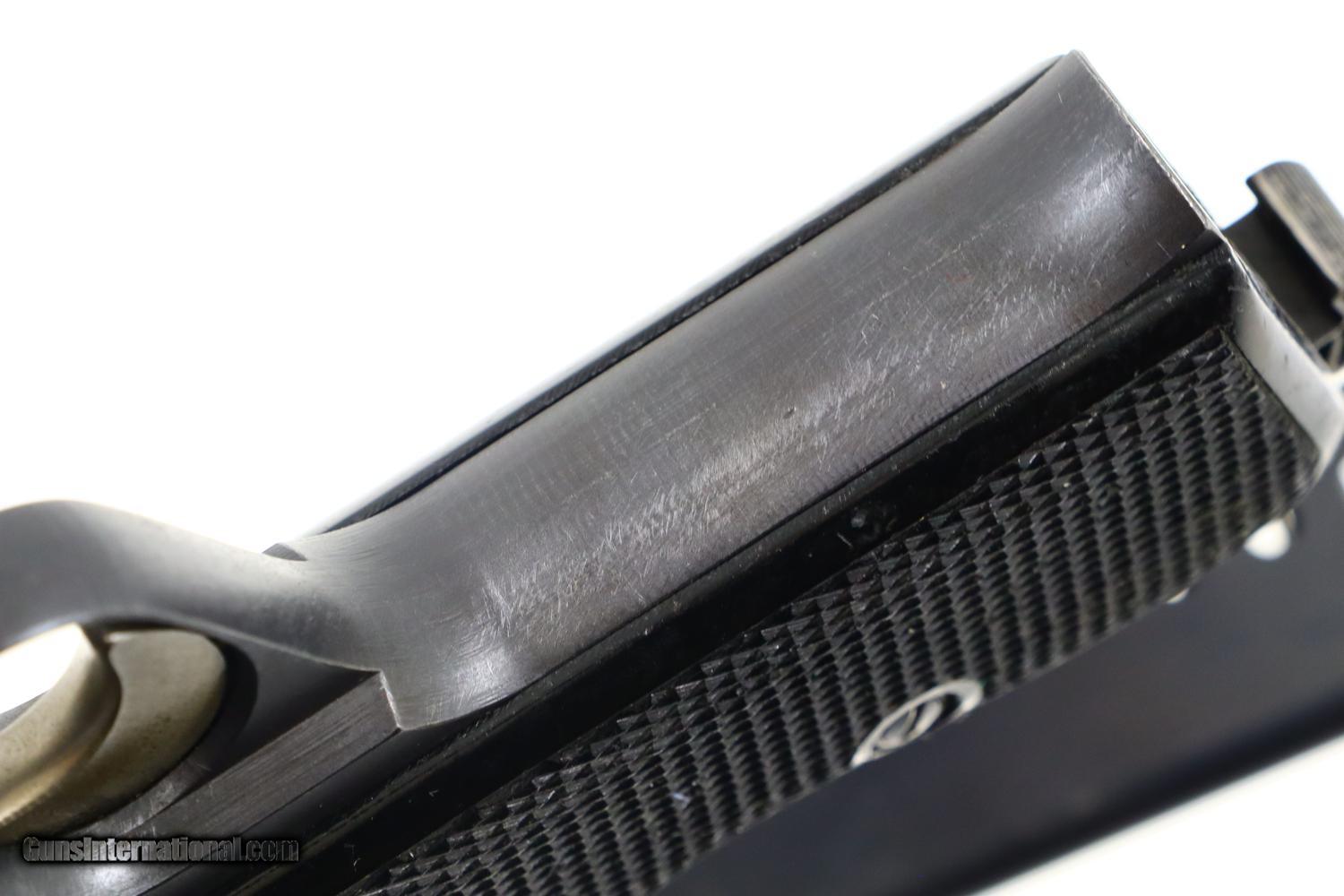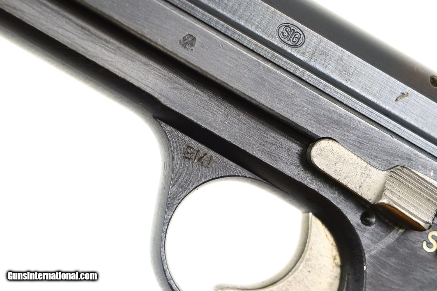 Description: Synopsis: SIG, P210-4, German Border Police, D2723, FB00908 Description: Standard configuration SIG P210-4, one of 5000 pistols in this police contract, with drift adjustable front and rear sight. The left side of the slide is marked with the full serial number and the encircled SIG logo. The matching number and proof are on the left rail. Usual white highlighted S (safe) and red highlighted F (fire). Disassembly shows a matching barrel and hammer group. Slide, frame, safety lever, and magazine release are blued with the barrel, loaded indicator, hammer, trigger and slide release in the white. Black checkered grips secured with a single transverse screw, no lanyard ring as correct for this pistol. Unnumbered and unmarked magazine. Condition: VG finish with the frame likely a period rework based on the wear pattern. Now with superimposed sharp edge and light holster wear. Magazine and grips are in comparable condition. Bright bore sharp rifling. Perfect manual mechanics. A nice looking SIG P210-4 German Border Police pistol, equally at home at the range or in a collection. ~~Insured shipping fee of $65; most packages shipped using FedEx 2nd Day.~~ SOLD Manufacturer: SIG Serial Number: D2723 Caliber Info: 9mm |