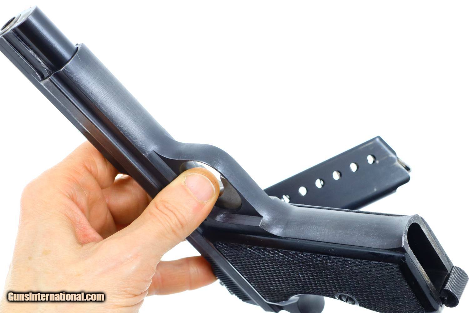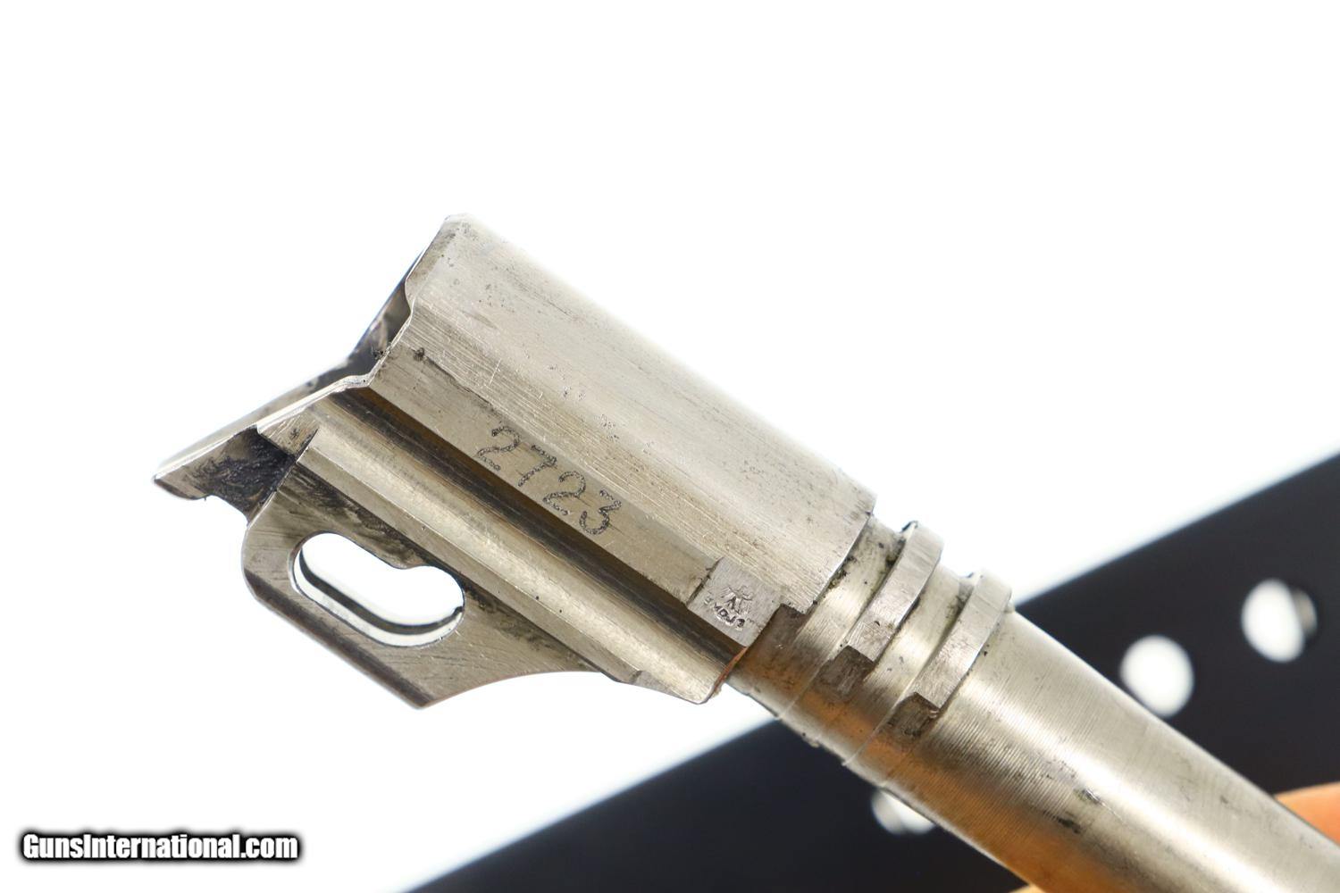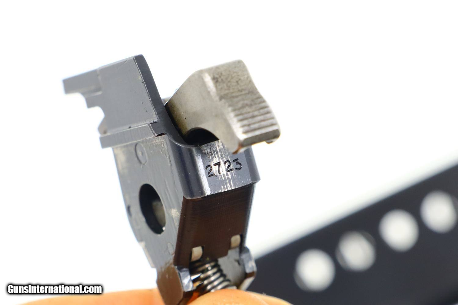 Description: Synopsis: SIG, P210-4, German Border Police, D2723, FB00908 Description: Standard configuration SIG P210-4, one of 5000 pistols in this police contract, with drift adjustable front and rear sight. The left side of the slide is marked with the full serial number and the encircled SIG logo. The matching number and proof are on the left rail. Usual white highlighted S (safe) and red highlighted F (fire). Disassembly shows a matching barrel and hammer group. Slide, frame, safety lever, and magazine release are blued with the barrel, loaded indicator, hammer, trigger and slide release in the white. Black checkered grips secured with a single transverse screw, no lanyard ring as correct for this pistol. Unnumbered and unmarked magazine. Condition: VG finish with the frame likely a period rework based on the wear pattern. Now with superimposed sharp edge and light holster wear. Magazine and grips are in comparable condition. Bright bore sharp rifling. Perfect manual mechanics. A nice looking SIG P210-4 German Border Police pistol, equally at home at the range or in a collection. ~~Insured shipping fee of $65; most packages shipped using FedEx 2nd Day.~~ SOLD Manufacturer: SIG Serial Number: D2723 Caliber Info: 9mm |