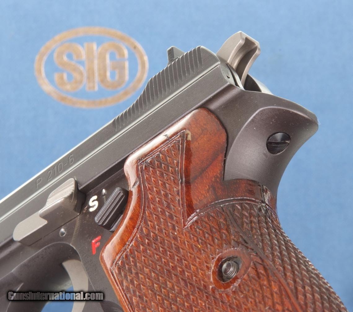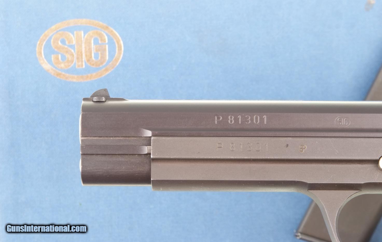 Description: Drift adjustable white highlighted front sight and standard rear sight. No Swiss cross-in-shield on rear sight base. Left side of slide and frame with full serial number that is repeated along with the SIG logo and caliber on the exposed barrel hood. P210-6 designation on the left side of the slide. Usual white highlighted S (safe) and red highlighted F (fire). Under the tang is the sear adjusting screw as found on all of the “-6” pistols. Slide, frame, safety lever, and magazine release are matte finished with the barrel, hammer, trigger and slide release in the white. Wooden checkered grips secured with a single transverse screw. Unnumbered magazines (two) with matte finish as correct for this pistol. Spare barrel in 7.65P, numbered to pistol but without externally applied caliber. Original blue SIG box with gold logo on cover. Grey foam liner has been removed from the base and there is no external labeling. Synopsis: Beautiful and early matte finish SIG P210-6 in the commercial “P” prefix serial range with wood checkered grips and spare 7.65P barrel. Condition: Excellent++ original finish with only a few handling marks, mostly scattered over the grips. Mirror bore and perfect manual mechanics. The spare barrel in 7.65P, was probably purchased as an unnumbered replacement, later matched to the pistol. Near excellent bore with slight frosting in grooves. Left front corner of box having a taped separation. An extremely attractive P210-6, with spare barrel, magazine and shipping box nice extras. A HISTORIC INVESTMENT! ~~Insured shipping fee of $75; most packages shipped using FedEx 2nd Day.~~ SOLD Manufacturer: SIG Serial Number: P81301 Caliber Info: 9mmP |