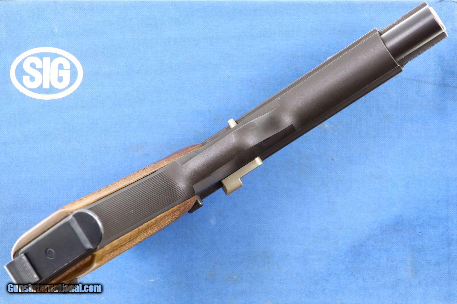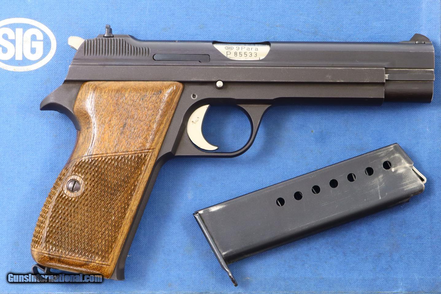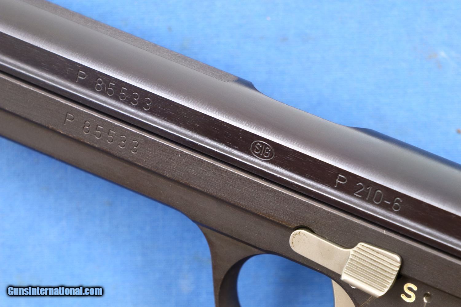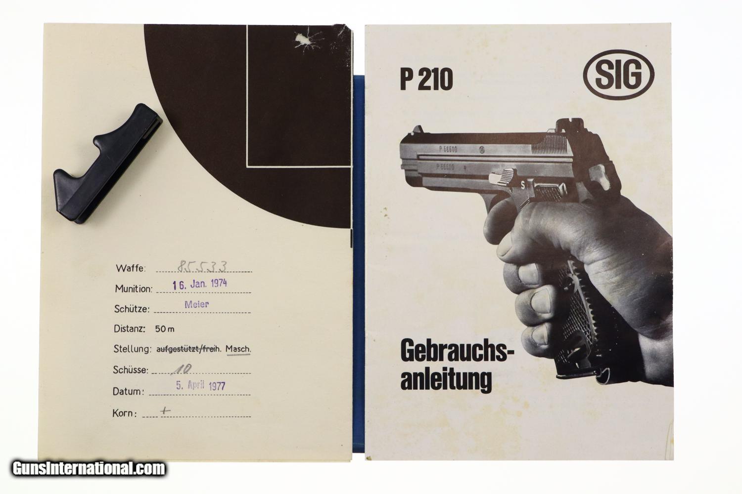 Wonderful, standard configuration matte finish SIG P210-6 with fully adjustable sights in the commercial “P” prefix serial range with dark walnut checkered grips. SN: P85533. Cal: 9mmP . Drift adjustable front and rear sights. Left side of slide and frame with full serial number that is repeated along with the SIG logo and “9 Para” on the exposed barrel hood. Usual white highlighted S (safe) and red highlighted F (fire). Typical “-6” features include the model reference on the slide, hammer group fixation screw under tang, vertical serrations on front strap, and the thin trigger. Slide, frame, safety lever, and magazine release are matte finished with the barrel, hammer, trigger and slide release in the white. Walnut checkered grips secured with a single transverse screw. Unnumbered magazine with matte finish as correct for this era pistol. Complete with blue shipping box lined in grey foam, instruction booklet, matching test target dated 5 April 1997, and a Sig loader.