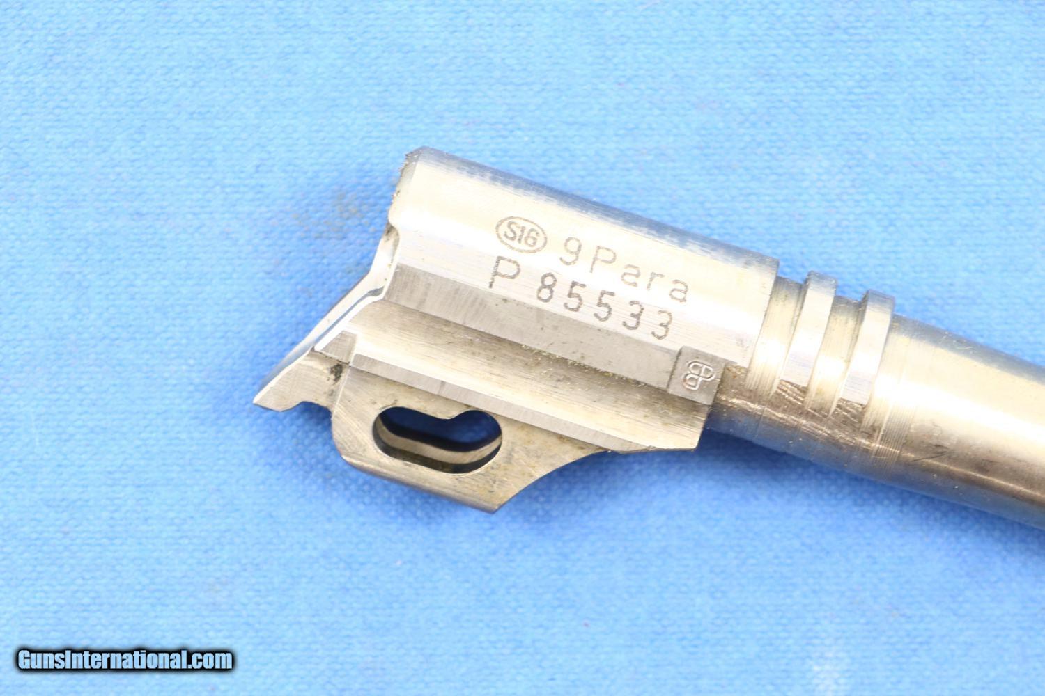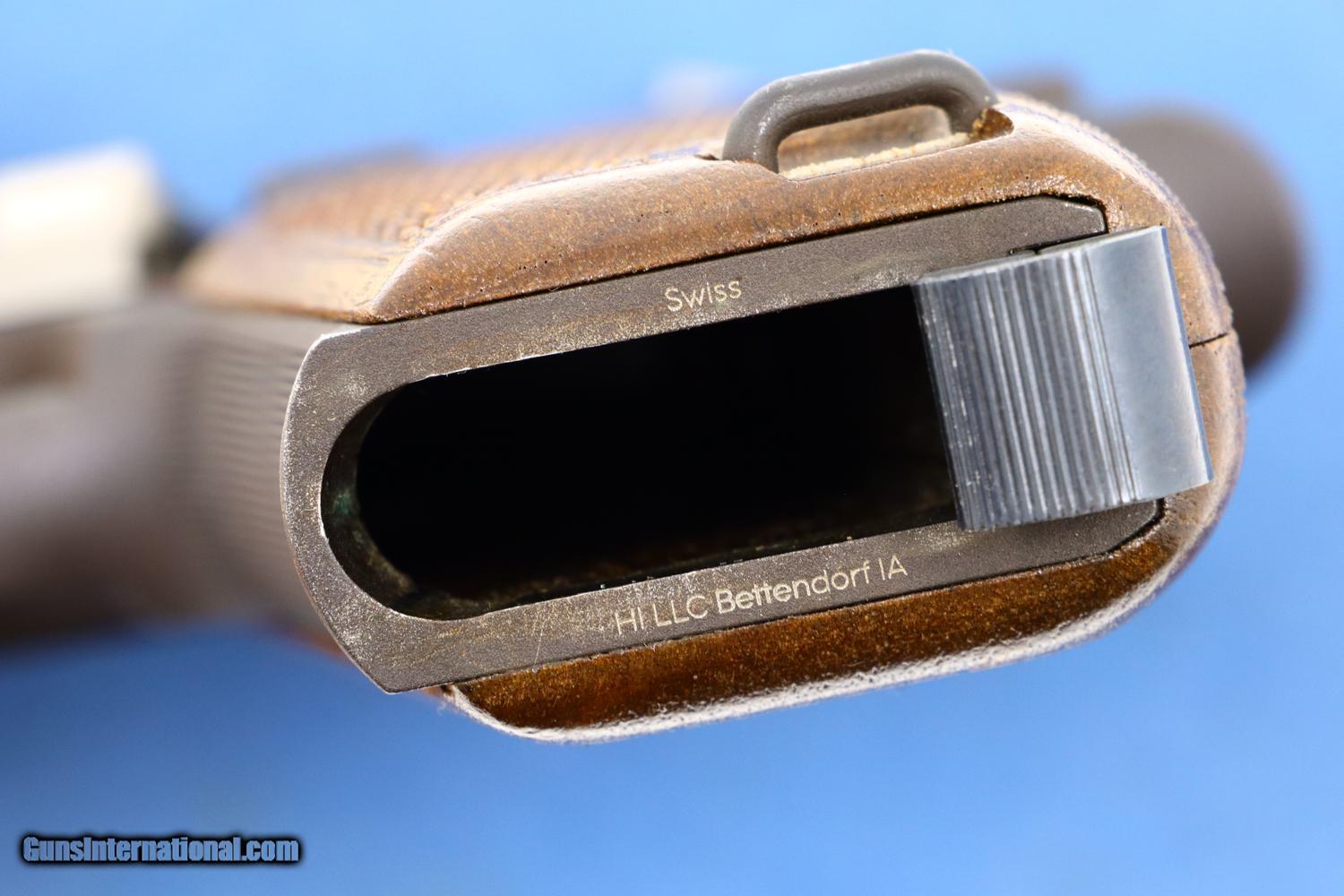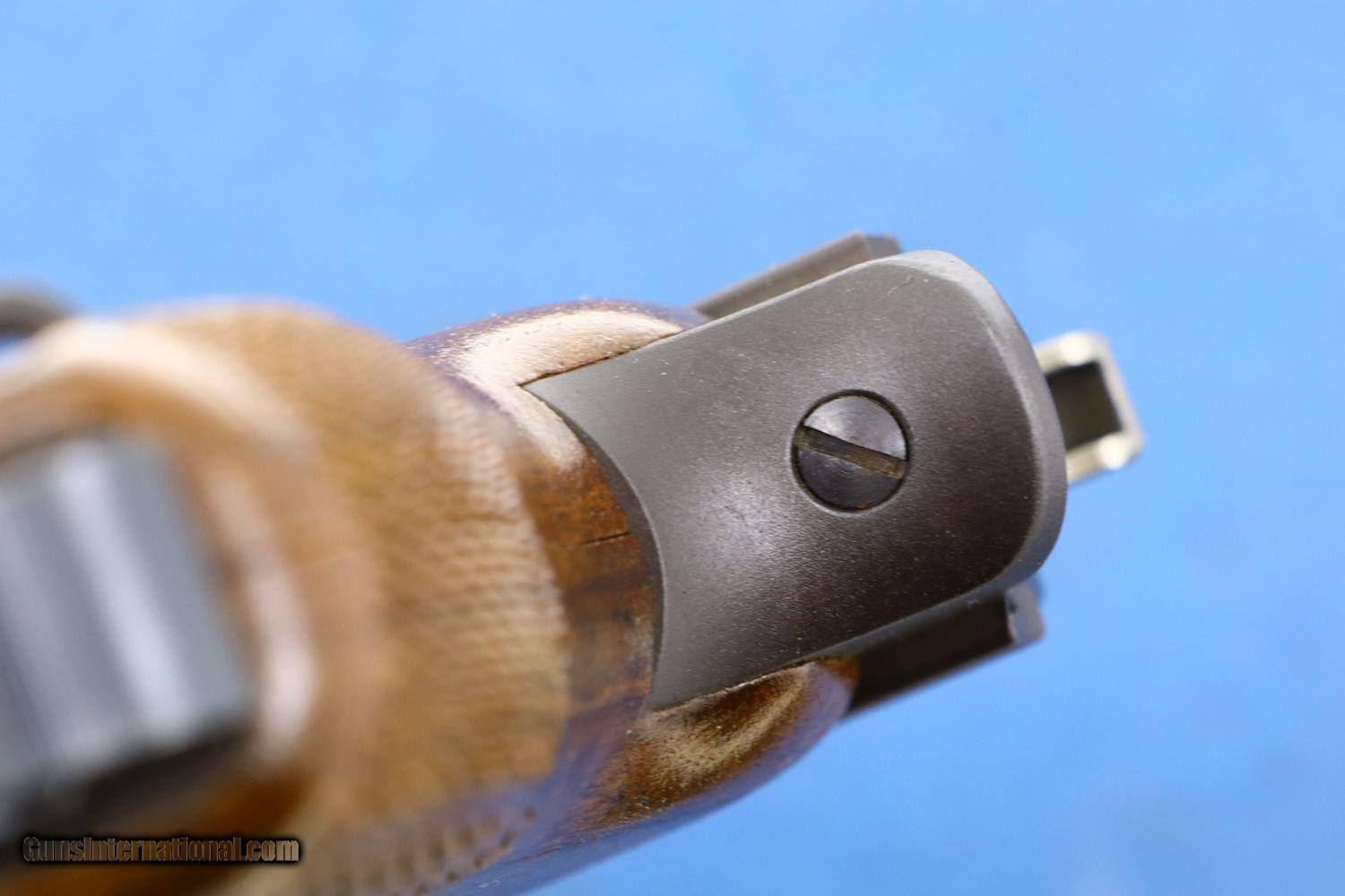 Description: Synopsis: SIG P210-6, Swiss Pistol, 9mmP, Boxed with Test Target, P85533, FB01017 Description: Wonderful, standard configuration matte finish SIG P210-6 with fully adjustable sights in the commercial “P” prefix serial range with dark walnut checkered grips. SN: P85533. Cal: 9mmP . Drift adjustable front and rear sights. Left side of slide and frame with full serial number that is repeated along with the SIG logo and “9 Para” on the exposed barrel hood. Usual white highlighted S (safe) and red highlighted F (fire). Typical “-6” features include the model reference on the slide, hammer group fixation screw under tang, vertical serrations on front strap, and the thin trigger. Slide, frame, safety lever, and magazine release are matte finished with the barrel, hammer, trigger and slide release in the white. Walnut checkered grips secured with a single transverse screw. Unnumbered magazine with matte finish as correct for this era pistol. Complete with blue shipping box lined in grey foam, instruction booklet, matching test target dated 5 April 1997, and a Sig loader. Condition: The pistol is truly excellent with just a few superficial handling marks on the right side as carefully photographed. There is no muzzle wear or thinning of the front straps. Mirror bore. Perfect manual mechanics. Comparable condition box, deteriorated grey foam having been removed, with factory matching and dated test target (nicely centered group), instruction booklet, and loader. Manufacturer: SIG Serial Number: P85533 Caliber Info: 9 Para Price: $4,295.00 Contact Seller |