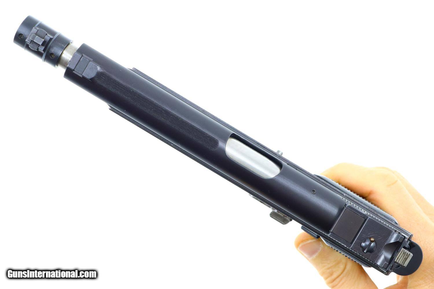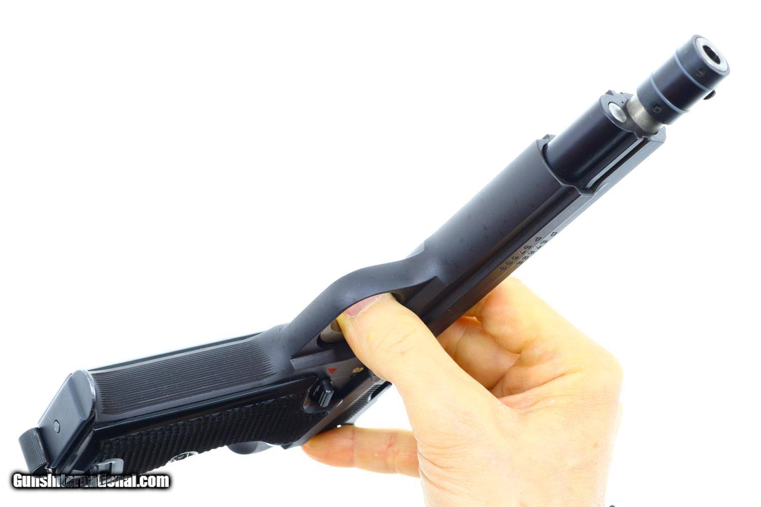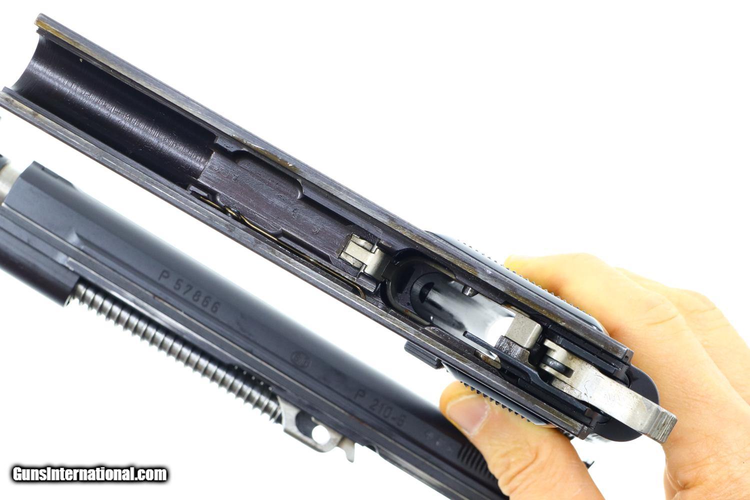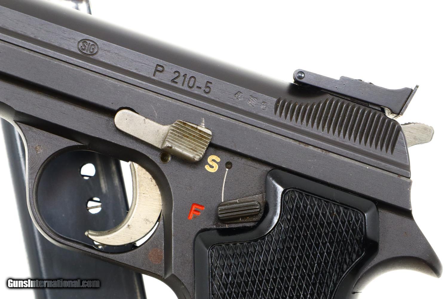 Standard configuration SIG P210-5 Target pistol with 150 mm barrel. Left side of slide with encircled SIG logo and model. Full serial number on the left side of the slide, left side of the frame, and exposed barrel hood. Target front sight that slips onto extended barrel and fully adjustable rear sight. Matte finished with black plastic checkered grips without screw escutcheons. Correct Matte magazine. A previous German import reflected by the very lightly stamped proofs on the left side of the slide behind the model, on the left upper trigger guard web, and the exposed barrel hood.Synopsis: