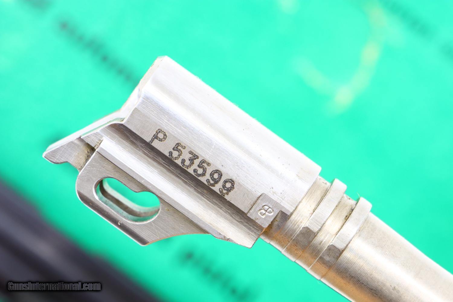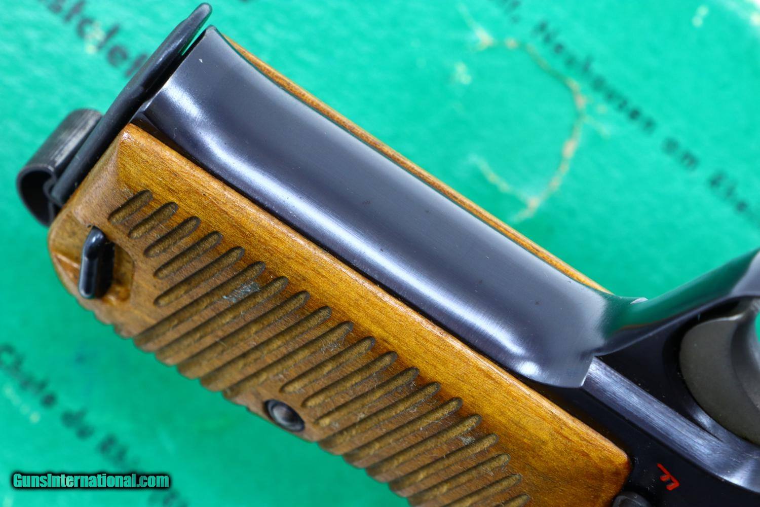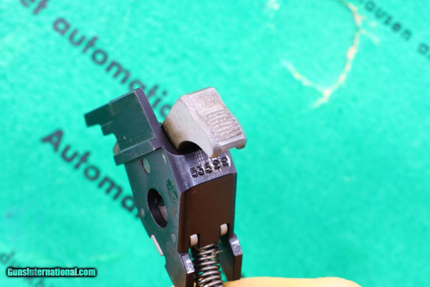Description: Standard configuration early P210-1, high polish, with drift adjustable front and rear sights. Swiss cross-in-shield on rear sight base. Left side of slide and frame with full serial number that is repeated on the exposed barrel hood. Usual white highlighted S (safe) and red highlighted F (fire). Disassembly shows a matching, half cock hammer group. Slide, frame, safety lever, and magazine release are high polish blued with the barrel, hammer, trigger and slide release in the white. Walnut serrated grips secured with a single transverse screw. Unnumbered high polish magazine, original blue, as correct for this pistol. Early SIG manual, originally printed for the SP47/8, later remarked for the P210. Green shipping box, closely numbered P53471. Synopsis: Beautiful, early production, high polish SIG P210-1 in the commercial “P” serial range, walnut serrated grips, manual, green SIG box. Condition: Approximately 99% original high polish blue with just minimal sharp edge wear as one might expect from a lightly holstered pistol. Comparable condition grips and magazine, though the surface of the left panel has a frosted appearance, likely a varnish reaction to a contacted surface. Bright bore with sharp rifling. Perfect manual mechanics. Excellent instruction manual and VG+ green box with shop wear and inner base flap separations. A very early and extremely attractive commercial SIG, especially nice with a crisp instruction booklet and a correct, though mismatched, shipping box. ~~Insured shipping fee of $75; most packages shipped using FedEx 2nd Day.~~ SOLD Manufacturer: SIG Serial Number: P53599 Caliber Info: 9mmP |