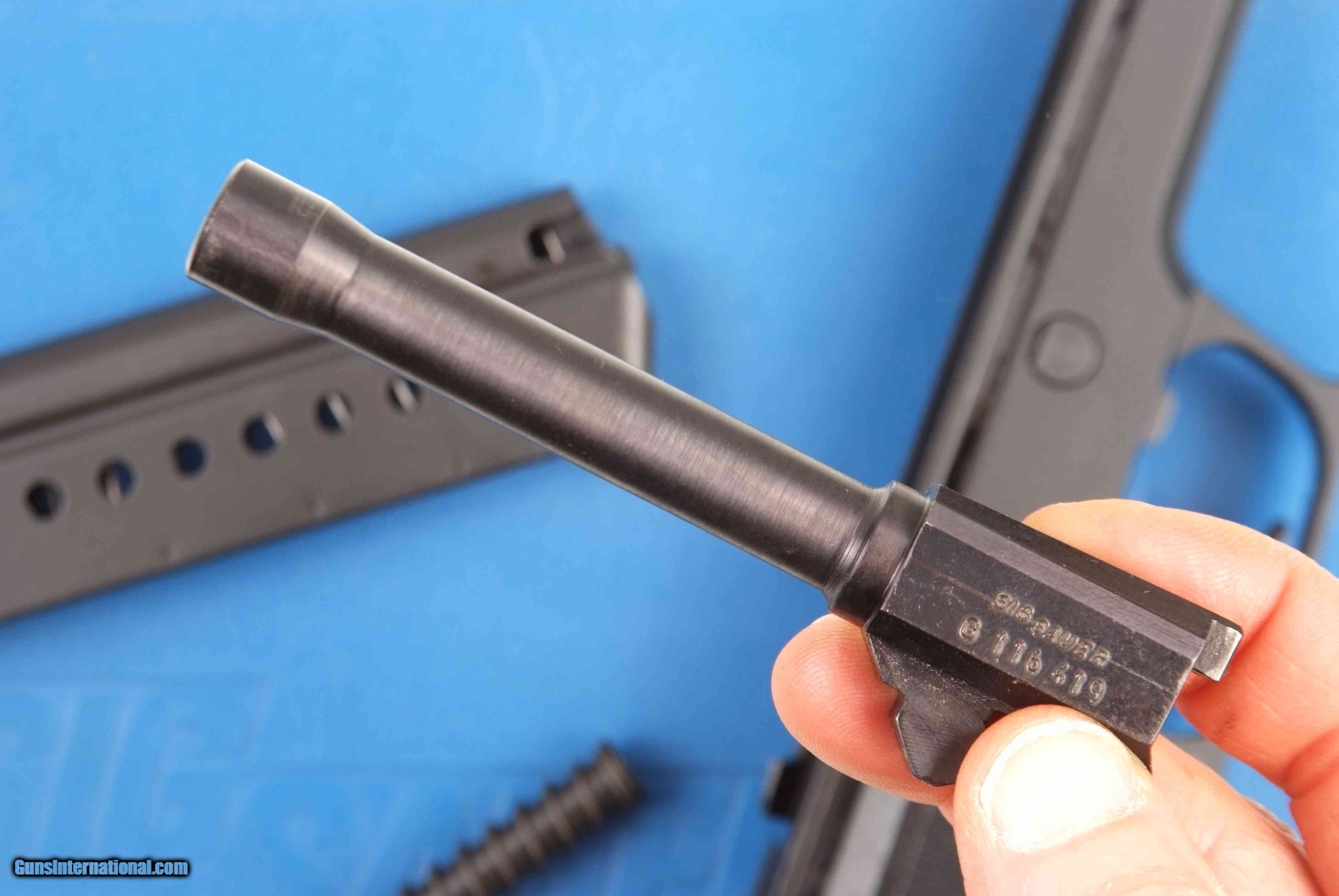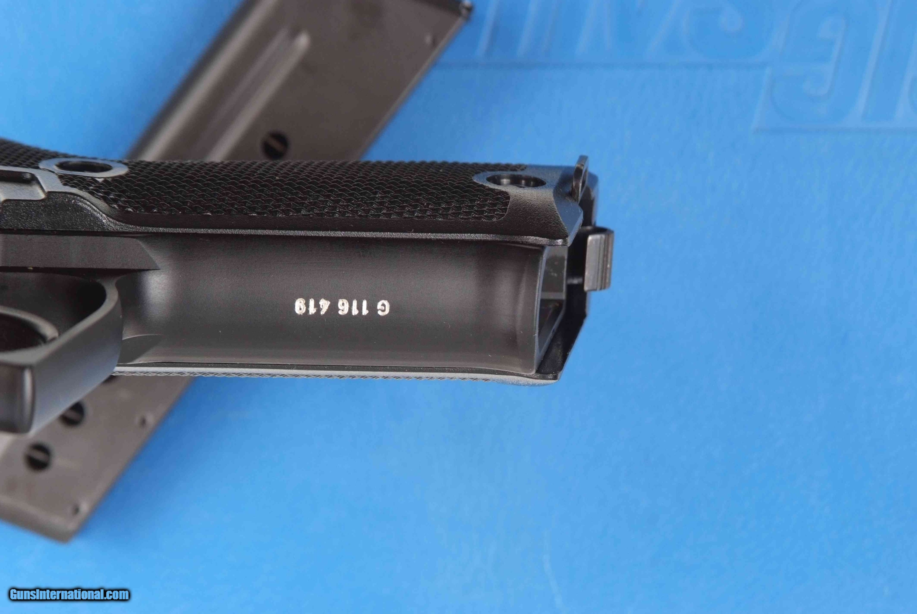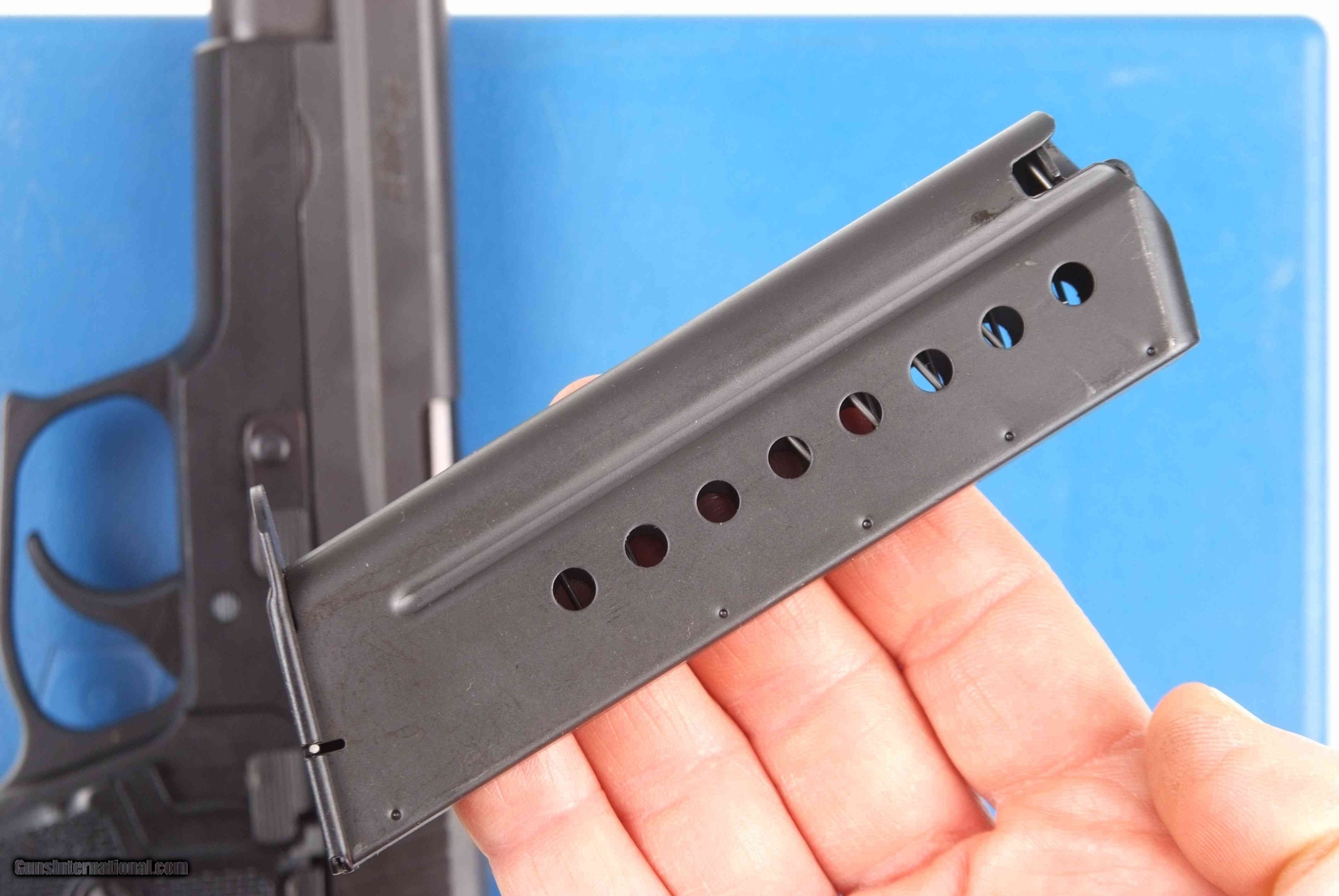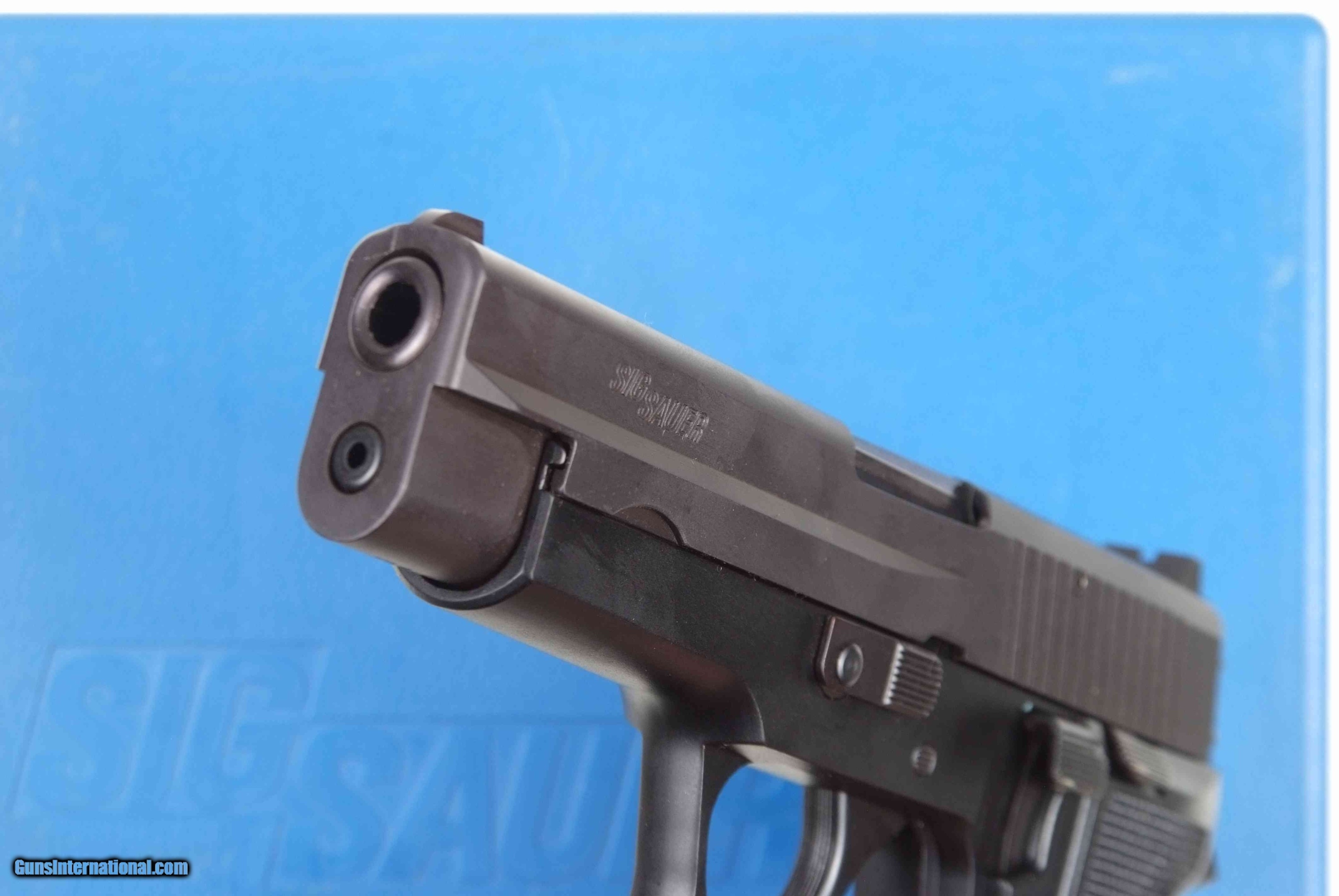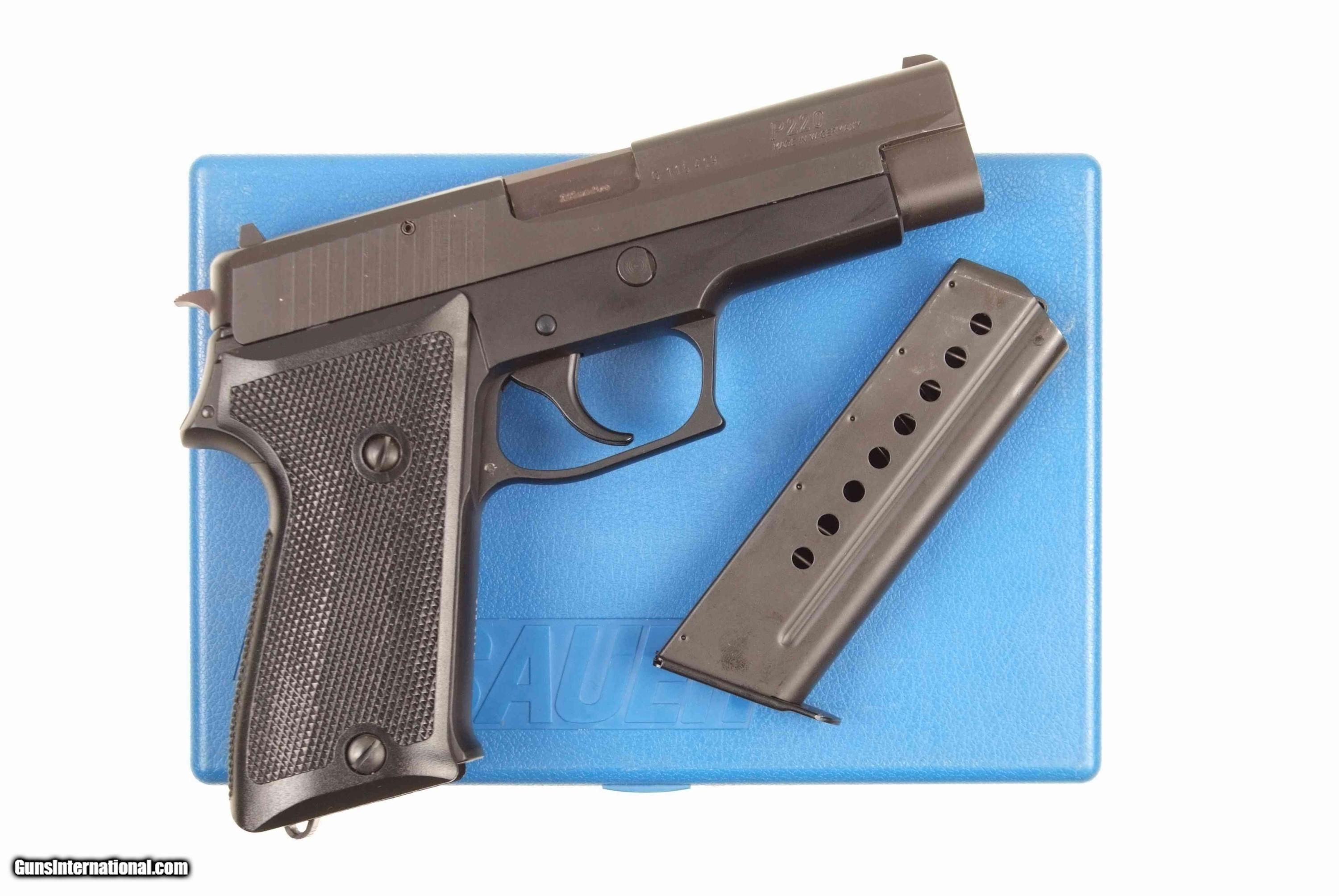 Description: Standard configuration SIG Sauer P220 with fixed front sight and drift adjustable rear sight, both white highlighted. The right side of the slide is marked with the “P220” designation along with "Made in W. Germany" and the full serial number that is repeated on the frontstrap and on the left (hidden) side of the barrel hood. On the right side of the barrel hood is the caliber, barrel diameter reduced with flare at muzzle. Fitted with two piece black plastic grips molded to have bordered checkering, each panel secured with two screws. Unmarked single column magazine except for the caliber that appears on the floorplate. Original blue shipping box, factory numbered to pistol, molded for pistol and spare magazine (not present). Synopsis: Superb SIG SAUER P220, virtually new in 7.65mmP, with traditional slide, contoured barrel, single column magazine marked for caliber, bottom release, matching blue shipping box. Condition: Nearly new! Same condition applies to the grips and grip screws that have perfect slots. Mirror bore. Perfect manual mechanics. A beautiful early SIG Sauer P220, rarely offered in this caliber, with unusual contoured barrel and factory matching shipping box. ~~Insured shipping fee of $75; most packages shipped using FedEx 2nd Day.~~ SOLD Manufacturer: SIG Serial Number: G116419 Caliber Info: 7.65mmP |