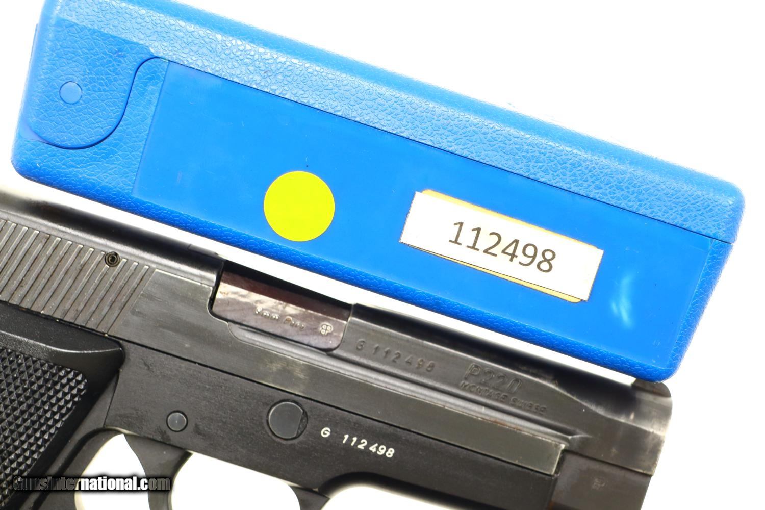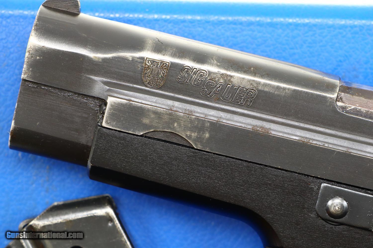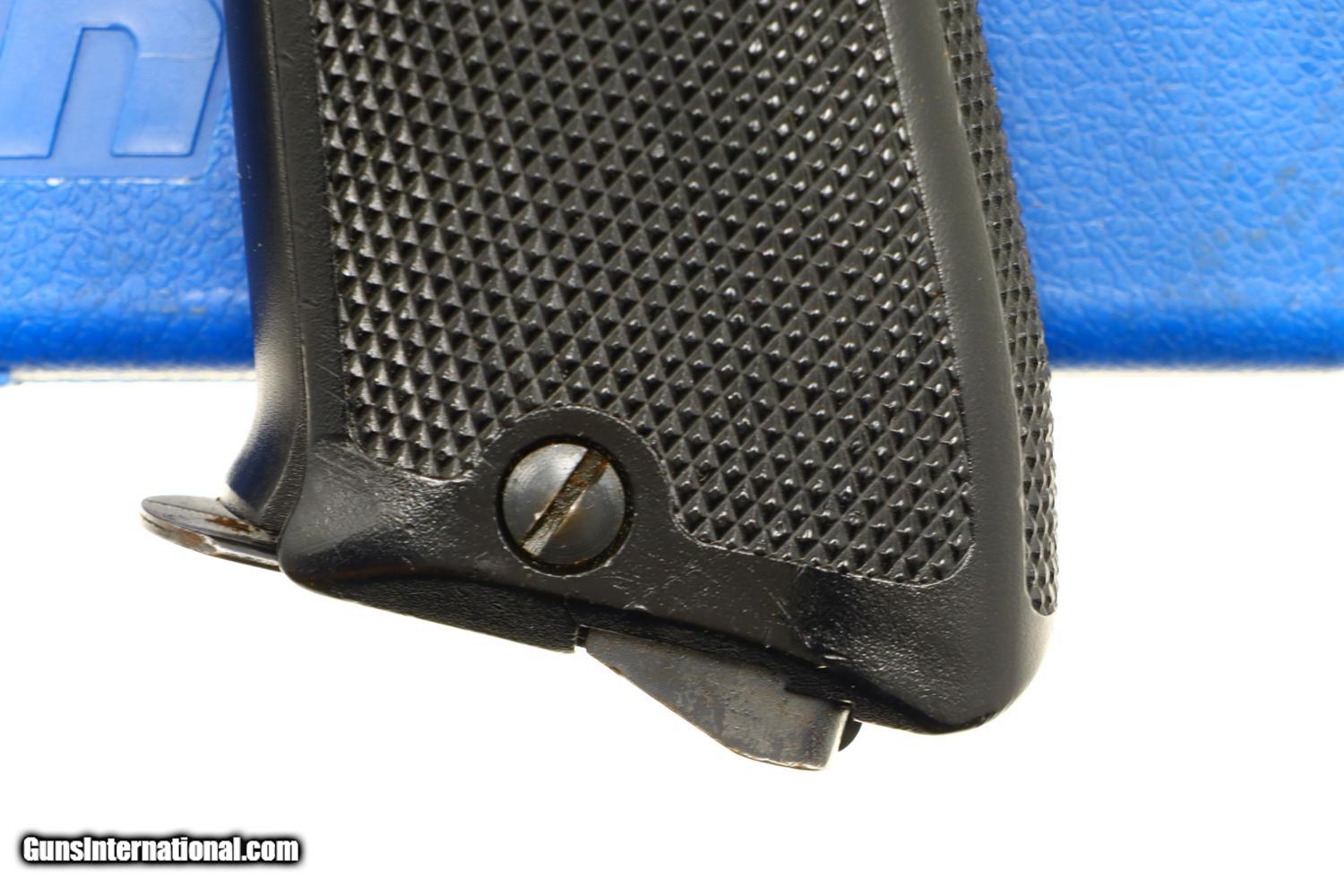 Description: One of the earliest SIG Sauer P220s, this example with folded slide, assembled in Switzerland. Standard white highlighted front and rear sights. The left side of the slide is marked with a large eagle within a shield, wings outstretched, as used by the police of Neuchatel. The right side of the slide is marked to reflect assembly in Switzerland. Matching serial numbers on the barrel, slide and frame. Checkered black plastic grips. Correct SIG Sauer magazines with 8 indicator holes, a zippered spine, and a detachable floorplate. Correct blue shipping box. Synopsis: Early SIG Sauer P220 in 9mmP, made in Switzerland, police marked, bottom magazine release with factory guard with spare magazine and correct shipping box. Condition: VG+ with sharp edge wear and thinning as one might expect from a service pistol that has seen moderate use. Surprisingly little wear to the anodized frame. Excellent grips and near excellent magazine. Mirror bright bore. Perfect manual mechanics. An extremely interesting and unusual early SIG P220 with police markings and an unusual guard for the magazine release. ~~Insured shipping fee of $45; most packages shipped using FedEx 2nd Day.~~ SOLD Manufacturer: SIG Sauer Serial Number: G112498 Caliber Info: 9mmP |