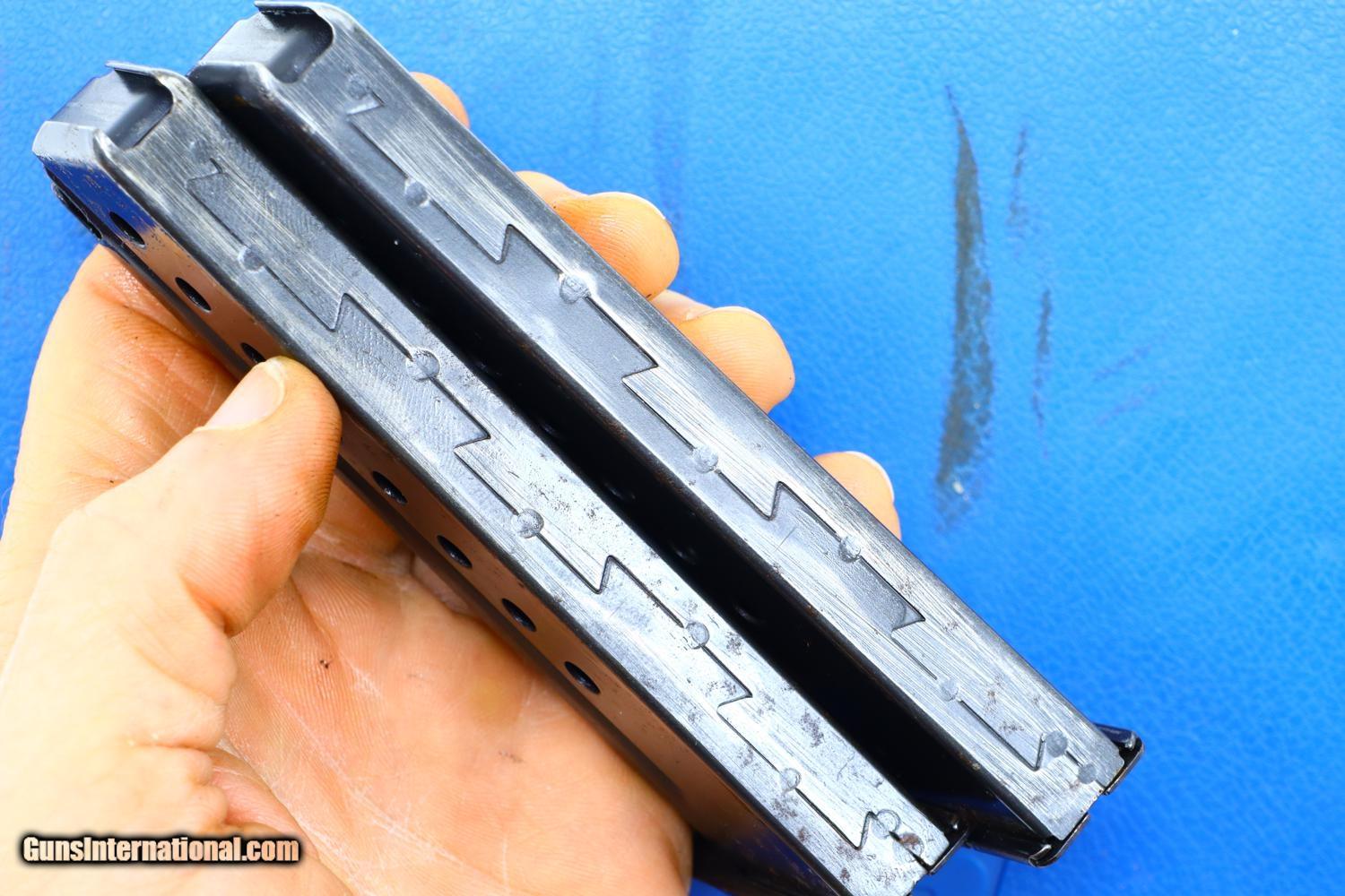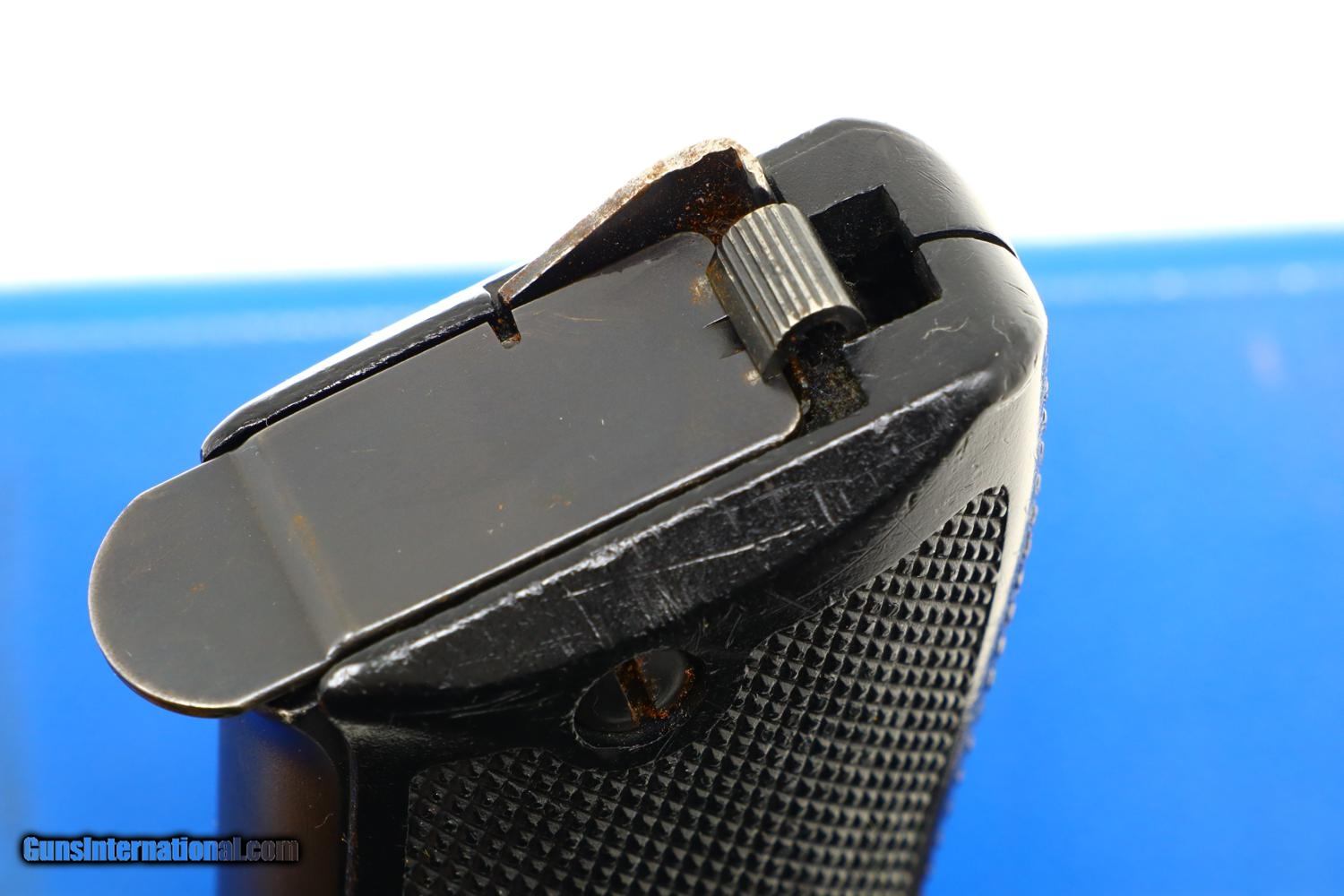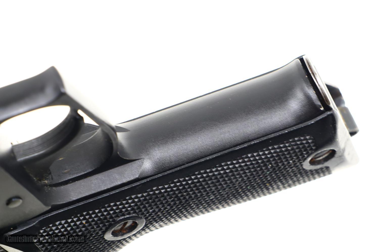Description: One of the earliest SIG Sauer P220s, this example with folded slide, assembled in Switzerland. Standard white highlighted front and rear sights. The left side of the slide is marked with a large eagle within a shield, wings outstretched, as used by the police of Neuchatel. The right side of the slide is marked to reflect assembly in Switzerland. Matching serial numbers on the barrel, slide and frame. Checkered black plastic grips. Correct SIG Sauer magazines with 8 indicator holes, a zippered spine, and a detachable floorplate. Correct blue shipping box. Synopsis: Early SIG Sauer P220 in 9mmP, made in Switzerland, police marked, bottom magazine release with factory guard with spare magazine and correct shipping box. Condition: VG+ with sharp edge wear and thinning as one might expect from a service pistol that has seen moderate use. Surprisingly little wear to the anodized frame. Excellent grips and near excellent magazine. Mirror bright bore. Perfect manual mechanics. An extremely interesting and unusual early SIG P220 with police markings and an unusual guard for the magazine release. ~~Insured shipping fee of $45; most packages shipped using FedEx 2nd Day.~~ SOLD Manufacturer: SIG Sauer Serial Number: G112498 Caliber Info: 9mmP |
