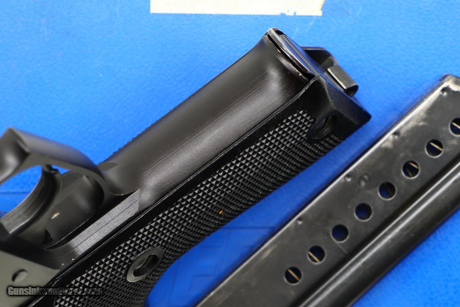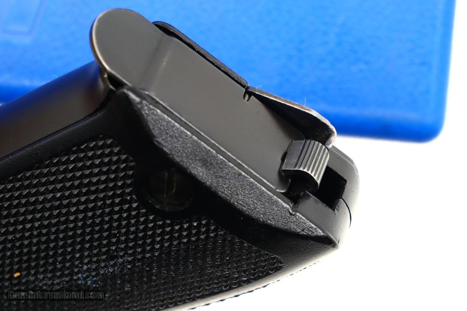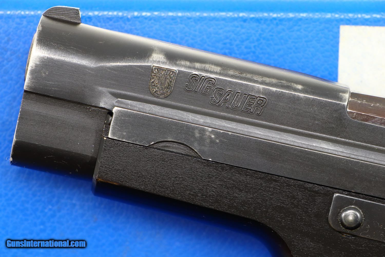 Description: One of the earliest SIG Sauer P220s, this example with folded slide, assembled in Switzerland. Standard white highlighted front and rear sights. The left side of the slide is marked with a large eagle within a shield, wings outstretched, as used by the police of Neuchatel. The right side of the slide is marked to reflect assembly in Switzerland. Matching serial numbers on the barrel, slide and frame. Checkered black plastic grips. Correct SIG Sauer magazines with 8 indicator holes, a zippered spine, and a detachable floorplate. Correct blue shipping box. Synopsis: Early SIG Sauer P220 in 9mmP, made in Switzerland, police marked, bottom magazine release with factory guard with spare magazine and correct shipping box. Condition: VG+ with sharp edge wear and thinning as one might expect from a service pistol that has seen light-moderate use. Surprisingly little wear to the anodized frame. Excellent grips and comparable condition magazines. Bright bore with sharp rifling. Perfect manual mechanics. An extremely interesting and unusual early SIG P220 with police markings and an unusual guard for the magazine release as used by the border patrol. ~~Insured shipping fee of $55; most packages shipped using FedEx 2nd Day.~~ SOLD Manufacturer: SIG Sauer Serial Number: G112546 Caliber Info: 9mmP |