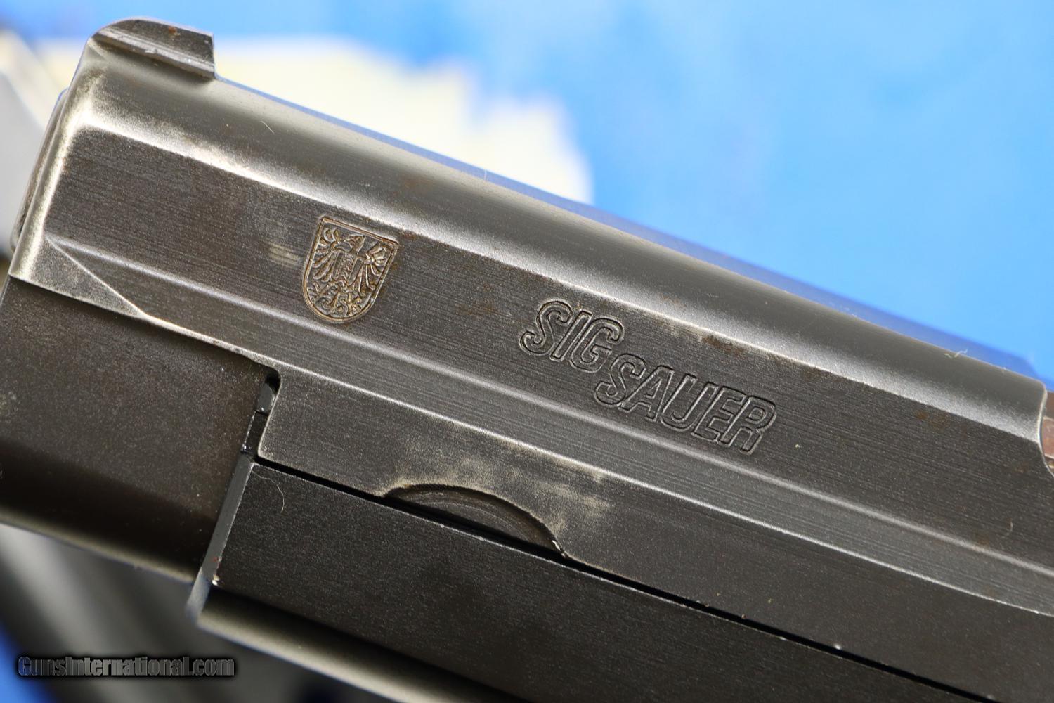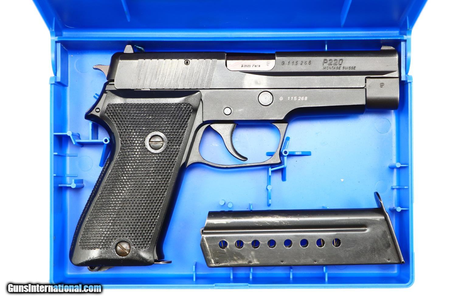 Description: Synopsis: SIG Sauer P220, Police, Late, Boxed, G115268, I-1239 Description: One of the later SIG Sauer P220s, this example with machined slide, assembled in Switzerland. Standard white highlighted front and rear sights. The left side of the slide is marked with a large eagle within a shield, wings outstretched, as used by the police of Neuchatel. The right side of the slide is marked to reflect assembly in Switzerland. Matching serial numbers on the barrel, slide and frame. Checkered black plastic grips. Correct SIG Sauer magazines with 8 indicator holes, a zippered spine, and a detachable floorplate. Correct blue shipping box. Condition: VG+ with sharp edge wear and thinning as one might expect from a service pistol that has seen light-moderate use. Surprisingly little wear to the anodized frame. Near excellent grips and comparable condition magazines. Bright bore with sharp rifling. Perfect manual mechanics. An extremely interesting and unusual late SIG P220 with police markings and guard for the magazine release as used by the border patrol. ~~Insured shipping fee of $55; most packages shipped using FedEx 2nd Day.~~ SOLD Manufacturer: SIG Sauer Serial Number: G115268 Caliber Info: 9mmP |