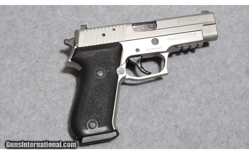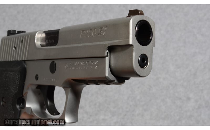 Description: The modern Sig Sauer pistol story began with the P220. Initially offered in several centerfire calibers in 1976, all but the .45 ACP chambering were eventually dropped. The .45 ACP P220 went on to become recognized as one of 'the most accurate 45s right out of the box.' Since that time the P220 has earned an enviable record in hot spots around the world. Today the P220 features a stainless steel slide machined from bar stock and coated with a durable, wear-resistant Nitron finish or natural stainless finish, light-weight alloy frame with integral accessory rail, and the Sig Sauer four-point safety system of decocking lever, patented automatic firing pin safety block, safety intercept notch, and trigger bar disconnector. .45 ACP SOLD Chambers: Semi Auto Wood Condition: Rubber Hogue Grips Bore Condition: Excellent Barrels: 4 1/2 Triggers: Factory Trigger Weight: 2 1/2 lbs. Sights: Fixed Night Sights Item Location: Tulalip, WA |