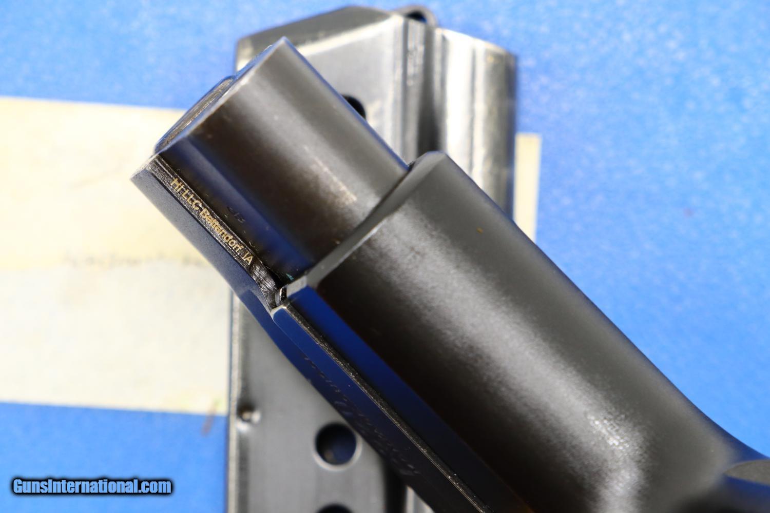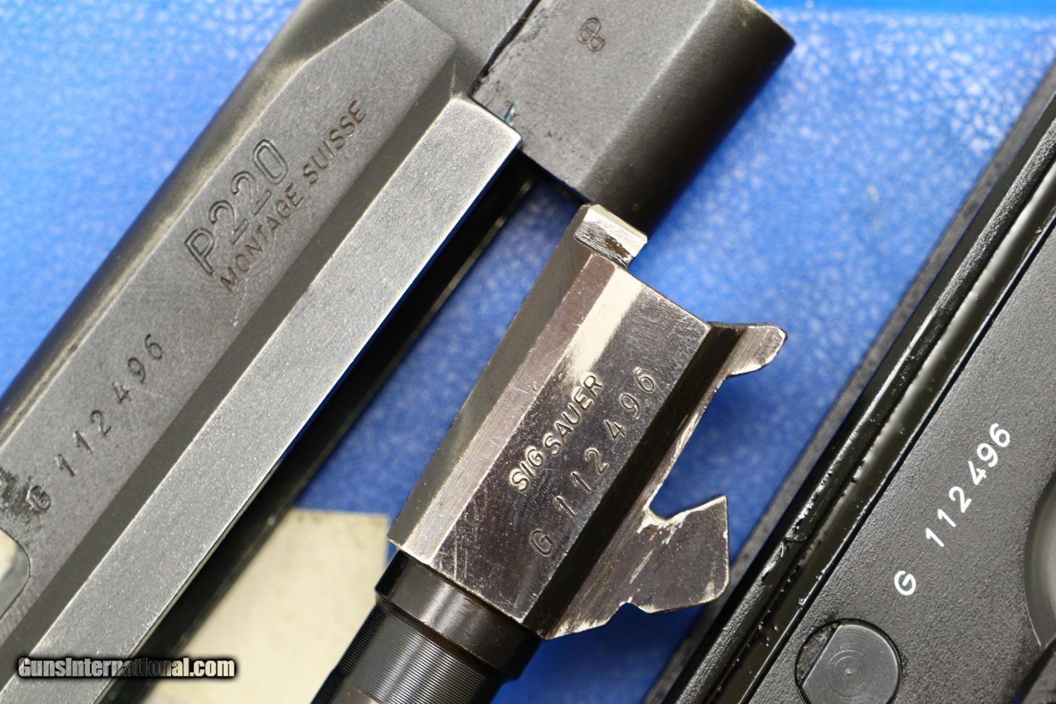 Description: Synopsis: SIG Sauer P220, Swiss Police, Early, Boxed, G112496, I-1242 Description: One of the earliest SIG Sauer P220s, this example with folded slide, assembled in Switzerland. Standard white highlighted front and rear sights. The left side of the slide is marked with a large eagle within a shield, wings outstretched, as used by the police of Neuchatel. The right side of the slide is marked to reflect assembly in Switzerland. Matching serial numbers on the barrel, slide and frame. Checkered black plastic grips. Correct SIG Sauer magazines with 8 indicator holes, a zippered spine, and a detachable floorplate. Correct blue shipping box. Condition: VG+ with sharp edge wear and thinning as one might expect from a service pistol that has seen light-moderate use. Surprisingly little wear to the anodized frame. Near excellent grips and VG+ magazines. Bright bore with sharp rifling. Perfect manual mechanics. An extremely interesting and unusual early SIG P220 with police markings and an unusual guard for the magazine release as used by the border patrol. ~~Insured shipping fee of $55; most packages shipped using FedEx 2nd Day.~~ SOLD Manufacturer: SIG Sauer Serial Number: G112496 Caliber Info: 9mmP |