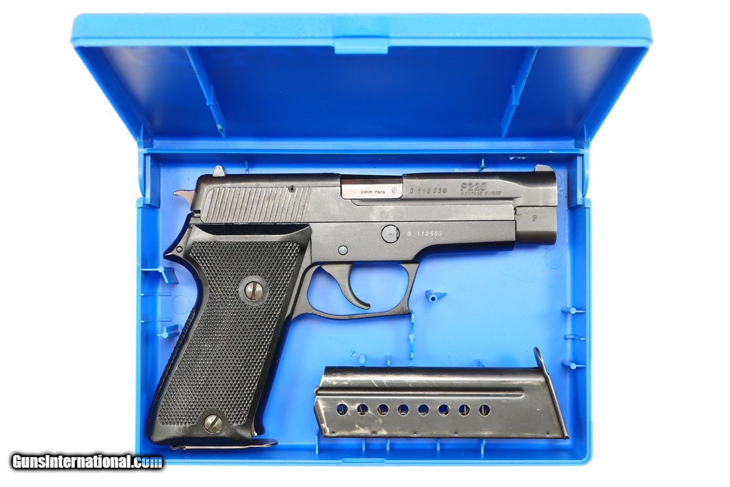 Description: Synopsis: SIG Sauer P220, Swiss Police, Early, Boxed, G112550, I-1240 Description: One of the earliest SIG Sauer P220s, this example with folded slide, assembled in Switzerland. Standard white highlighted front and rear sights. The left side of the slide is marked with a large eagle within a shield, wings outstretched, as used by the police of Neuchatel. The right side of the slide is marked to reflect assembly in Switzerland. Matching serial numbers on the barrel, slide and frame. Checkered black plastic grips. Correct SIG Sauer magazines with 8 indicator holes, a zippered spine, and a detachable floorplate. Correct blue shipping box. Condition: VG+ with sharp edge wear and thinning as one might expect from a service pistol that has seen moderate use. Surprisingly little wear to the anodized frame. Near excellent grips and VG+ magazines. Bright bore with sharp rifling. Perfect manual mechanics. An extremely interesting and unusual early SIG P220 with police markings and an unusual guard for the magazine release as used by the border patrol. ~~Insured shipping fee of $55; most packages shipped using FedEx 2nd Day.~~ SOLD Manufacturer: SIG Sauer Serial Number: G112550 Caliber Info: 9mmP |