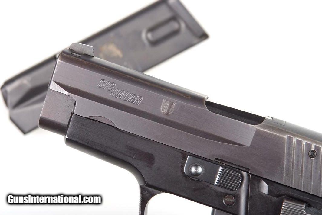 Description: Standard configuration SIG SAUER P228, 9mmP, with drift adjustable night sights. Left side of slide marked SIG SAUER followed by the canton symbol of Ticino. The right side of the slide is marked with the model, along with the full serial number that is repeated on the left side of the barrel hood and right side of the frame. Fitted with two piece black plastic grips with a molded frictional surface surrounding the manufacturers name and model. High capacity double column magazine marked SIG SAUER, the zippered spine having indicator holes marked for 5/10/13 cartridges. Synopsis: SIG Sauer, P228, Swiss Ticino Police. Condition: Near excellent original finish, with holster wear pattern consistent with light service use. Comparable condition grips, light burring of screw slots. Magazine with insertional wear as photographed. Mirror bore. Perfect manual mechanics. A SIG Sauer Police variation seldom encountered in the United States. DO NOT PURCHASE IF YOU LIVE IN A STATE WHERE HIGH CAPACITY MAGAZINES ARE RESTRICTED! ~~Insured shipping fee of $55; most packages shipped using FedEx 2nd Day.~~ SOLD Manufacturer: SIG Sauer Serial Number: B206148 Caliber Info: 9mmP |