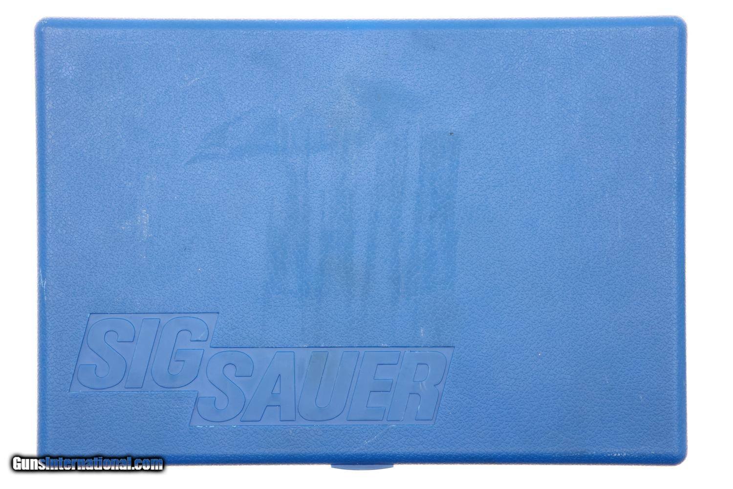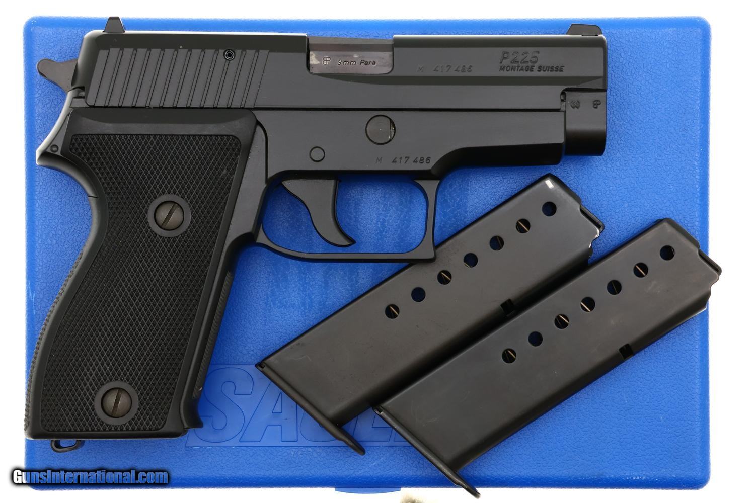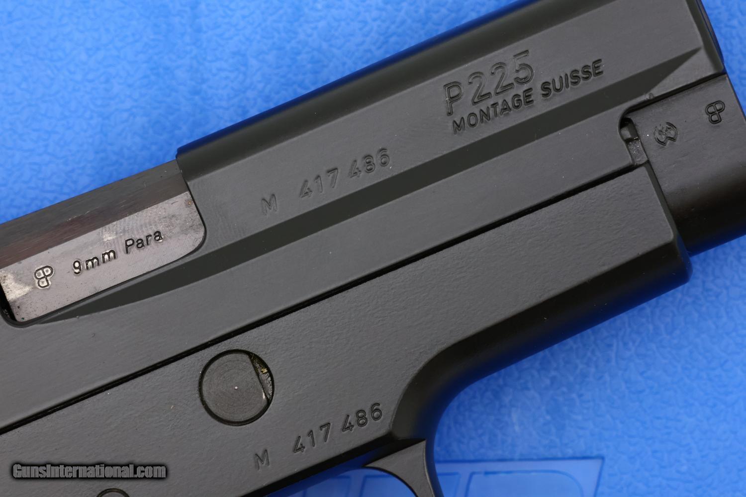 Beautiful SIG SAUER P225 pistol in 9mmP assembled in Switzerland for the Bern Police with drift adjustable front and rear sights. Left side of slide marked with the Bern canton, followed by “SIG SAUER” . The right side is marked with the model surmounting “Montage Suisse” (meaning assembled in Switzerland). The exposed barrel hood is marked 9mm Para along with the Swiss proofing that is repeated on the forward slide. The full serial number is on the right side of the slide, the right side of the frame, and the left side of the barrel hood (not shown). Fitted with two piece black plastic checkered grips. Single column magazine with zippered spine and seven indicator holes. Complete with original blue SIG SAUER shipping box with spare magazine, multi-language instruction booklet and a black leather holster marked with a Bern acceptance mark and the number ‘83’ stamped into the back.
